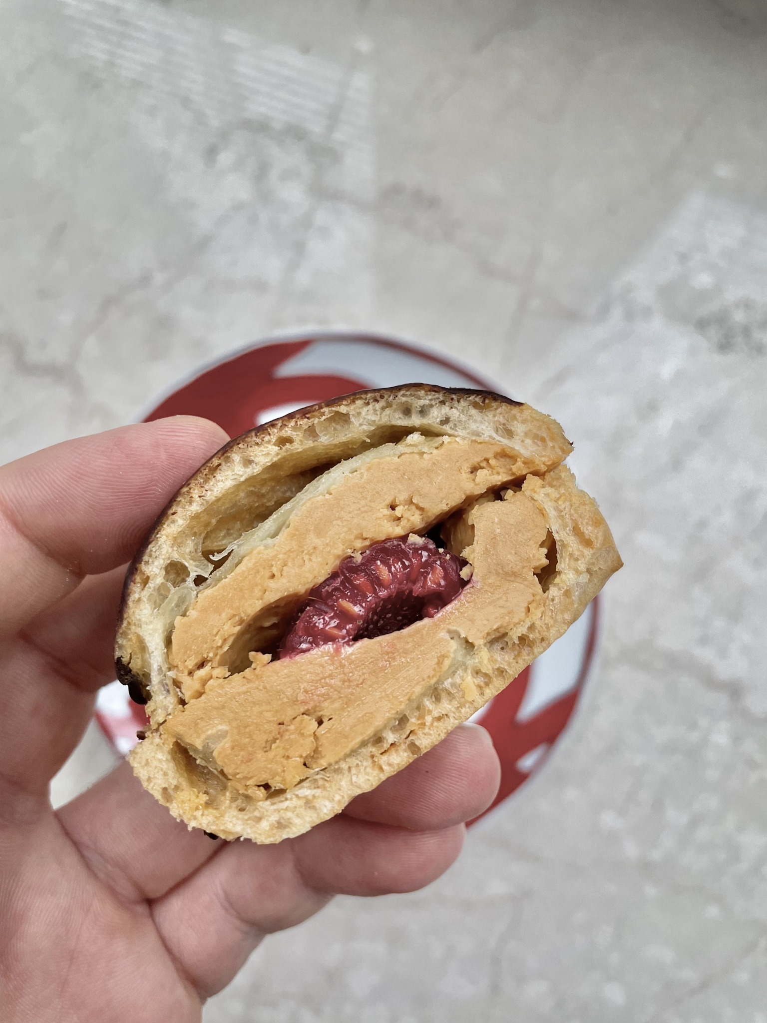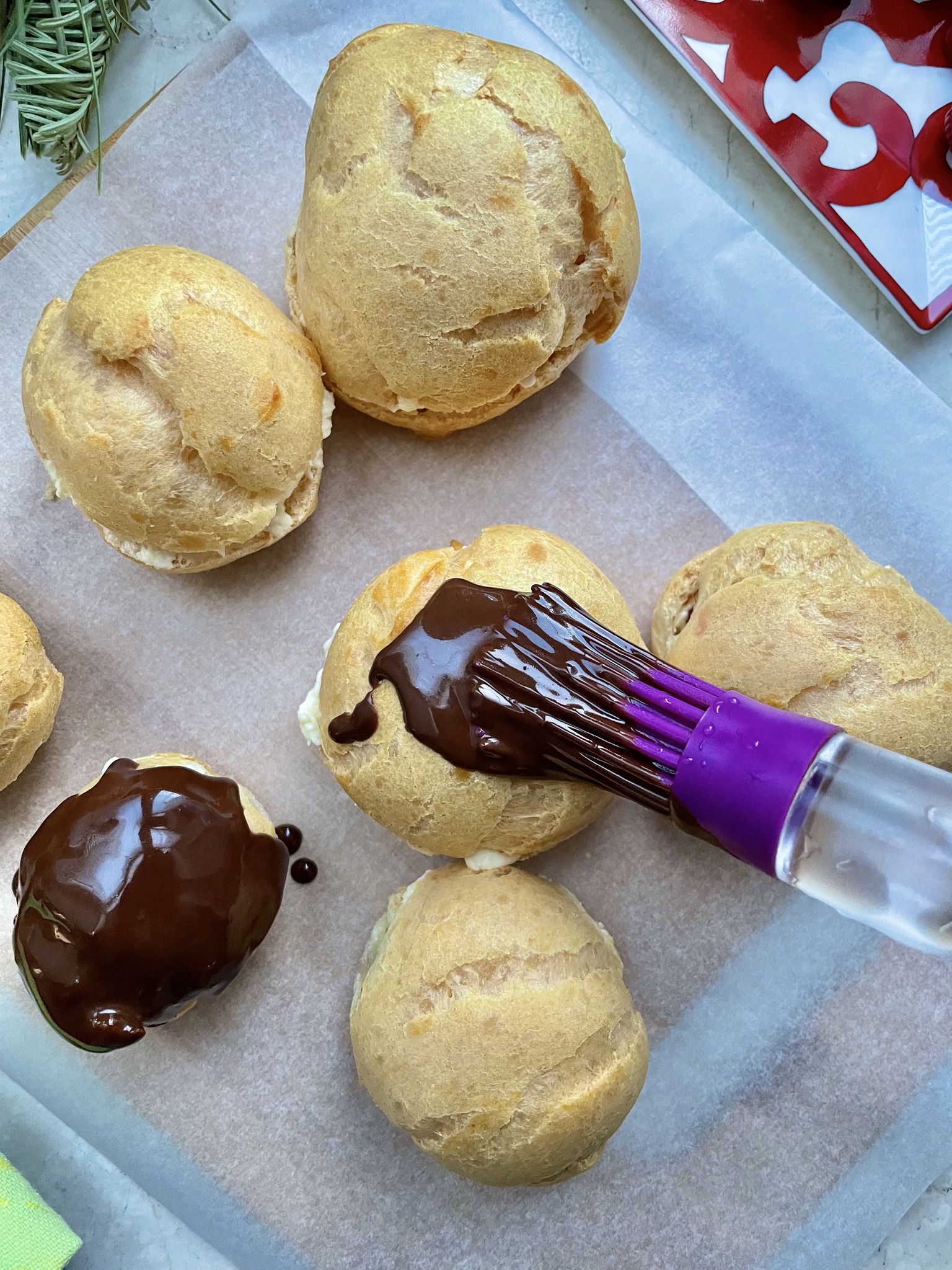 Остиглі профітролі розділити хлібним ножем на дві частини, заповнити кремом і покласти всередину розрізані ягоди малини, склеїти половинки. Зверху профітролі покрити глазур'ю та відправити у холодильник до подачі.