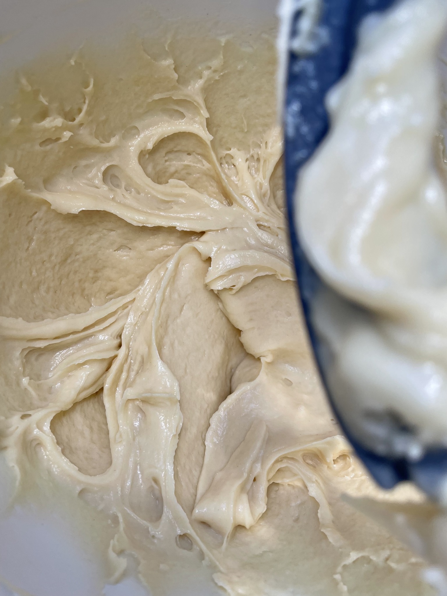 У чашу контейнера викласти вершкове масло та ванільну есенцію, збивати до повітряного стану на повільній швидкості. Додати згущене молоко та збивати до однорідного стану.