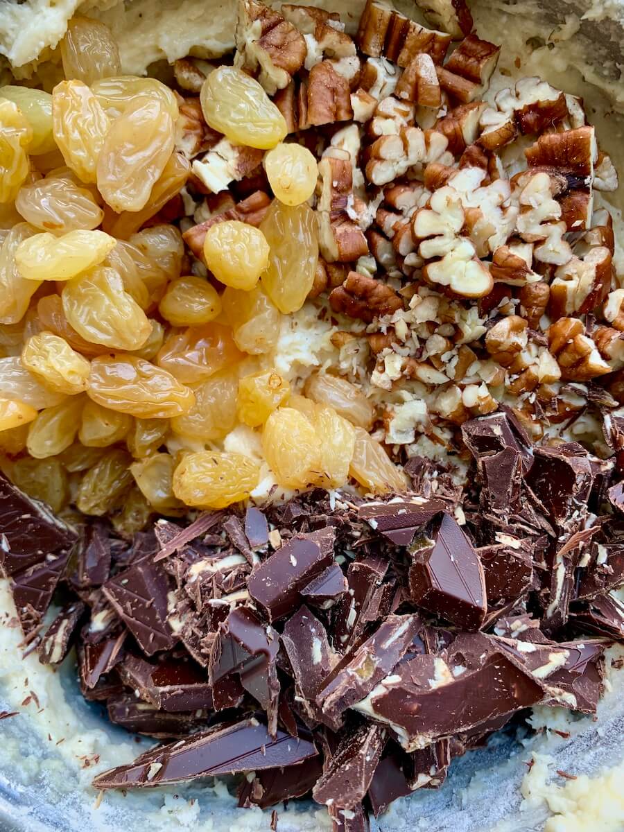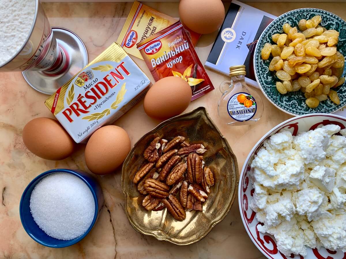 Итак, берем 150 г мягкого сливочного масла комнатной температуры, 100 г сахара, пакетик ванильного сахара, 4 яйца, 250 г муки, пакетик разрыхлителя. Для начинки: 100 г белого изюма, 2 столовые ложки ликера/водки/коньяка/рома – что есть под рукой, горсть орехов пекан или грецких, 100 г горького шоколада или шоколадных чипсов и 300 г сухого, нежирного творога или рикотты.