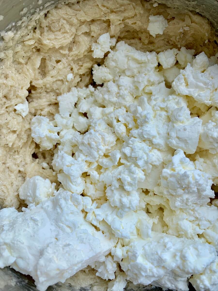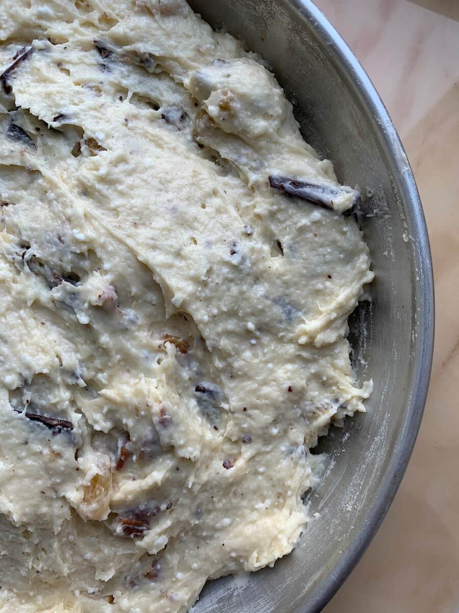 Духовку разогреть до 180 градусов. Изюм залить кипятком на 10 минут, слить воду и снова залить его уже алкоголем на 30 минут. На медленной скорости взбить масло с сахаром и ванилью до состояния крема, добавить рикотту или нежирный сухой творог, продолжая взбивать. По одному добавить 4 яйца, не прекращая перемешивать. Далее небольшими порциями добавить просеянную муку с разрыхлителем – приготовить однородное тесто.