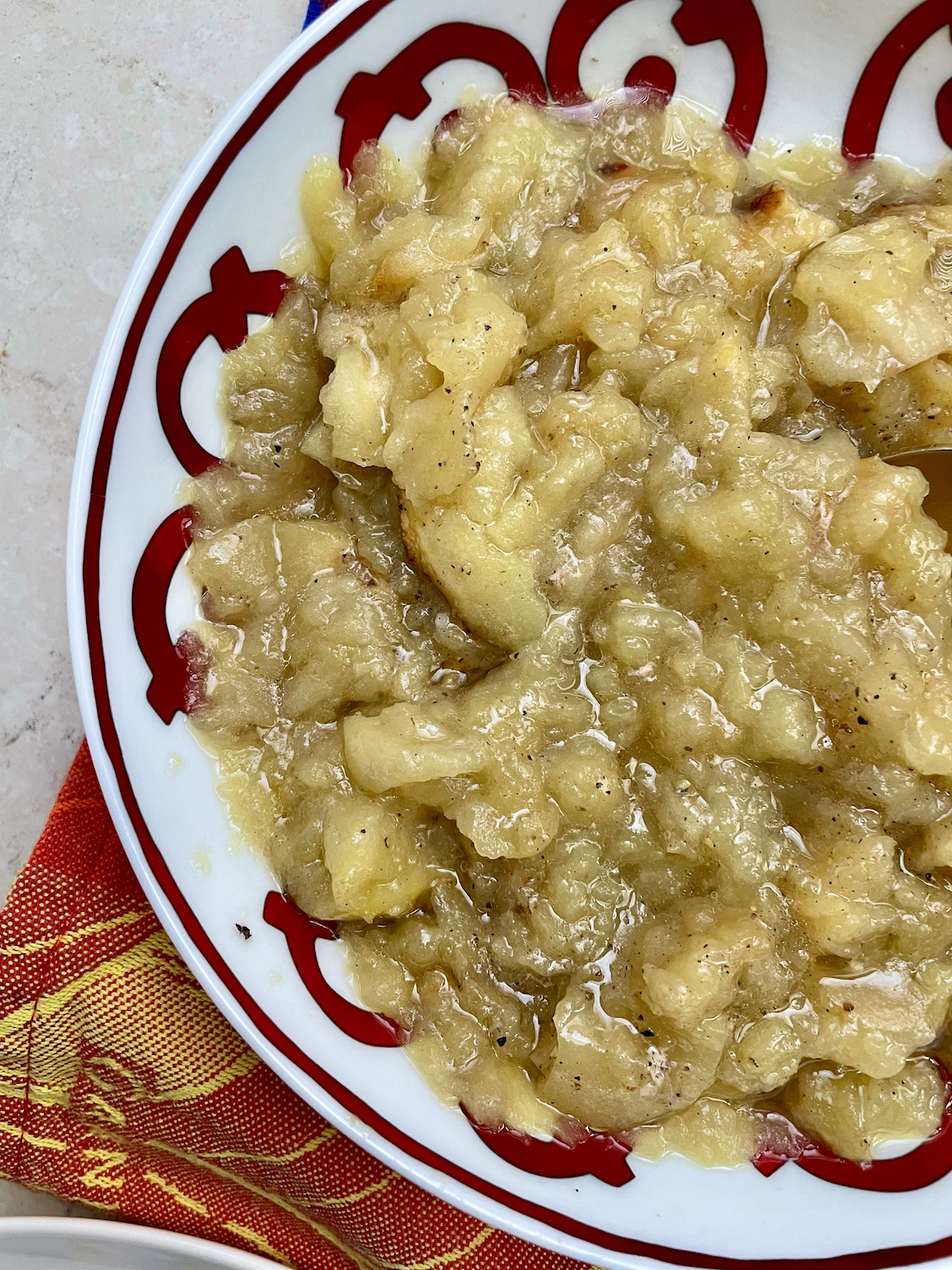 Готовую утку нарезать кусочками, яблоки переложить в пиалу, пюрировать и добавить соевый соус и соль/перец – довести вкус до идеального.