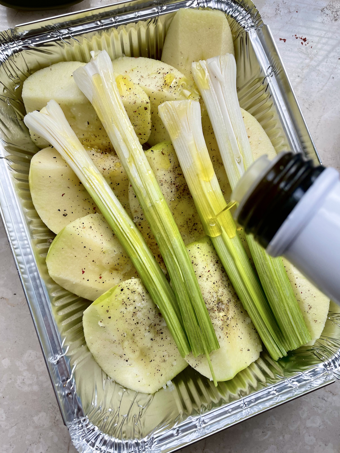Духовку разогреть до 200 градусов. Яблоки очистить от кожуры и сердцевины, разрезать на 4 части. Выложить яблоки в форму для запекания. Стебли чеснока разрезать вдоль надвое, положить на яблоки, приправить солью, перцем и оливковым маслом. Сверху положить филе утки, приправленное солью и перцем. Отправить форму в духовку на 30 минут – пока утка не покроется хрустящей корочкой, а яблоки не будут абсолютно мягкими. Сварить пасту, как указано на упаковке.