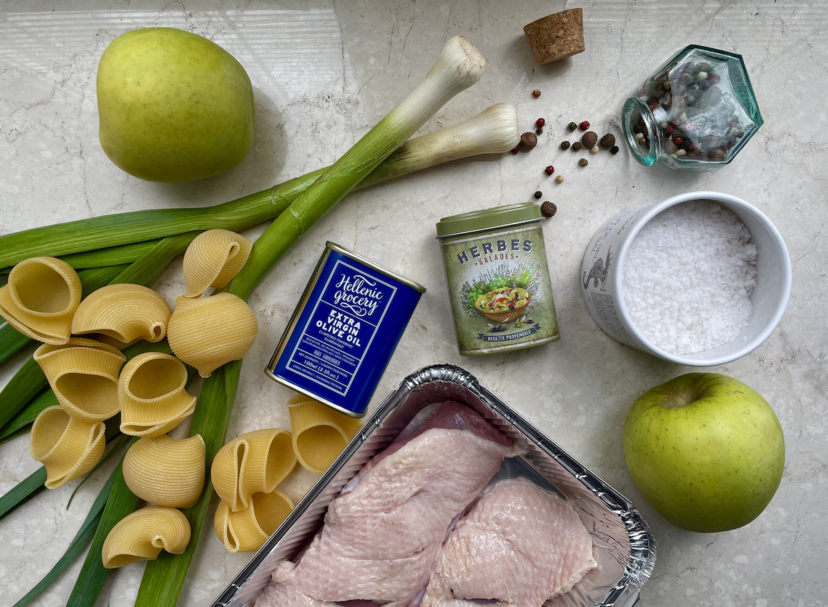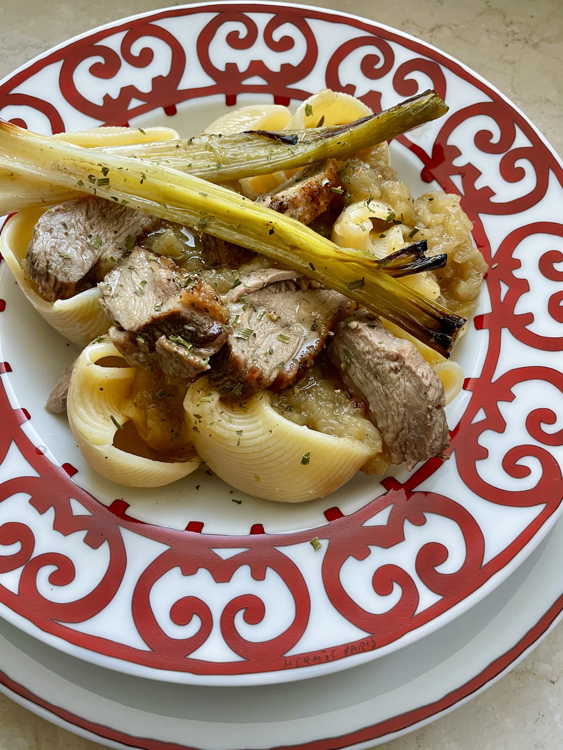 Итак, берем 2 утиных филе, 200 г пасты в виде больших ракушек, 3 яблока сорта «Голден делишез», 2 стебля молодого чеснока, оливковое масло, соль, свежемолотый перец, чайную ложку сладкого соевого соуса.
