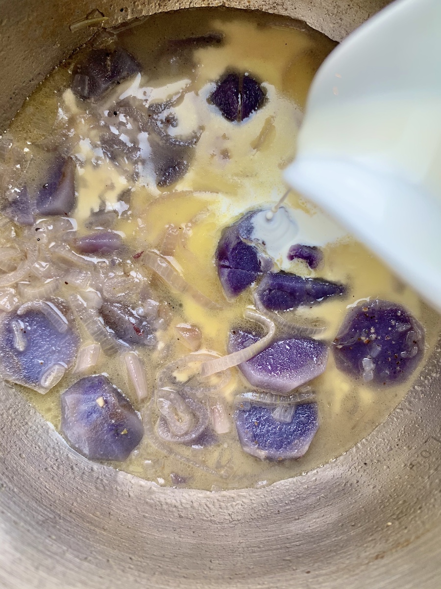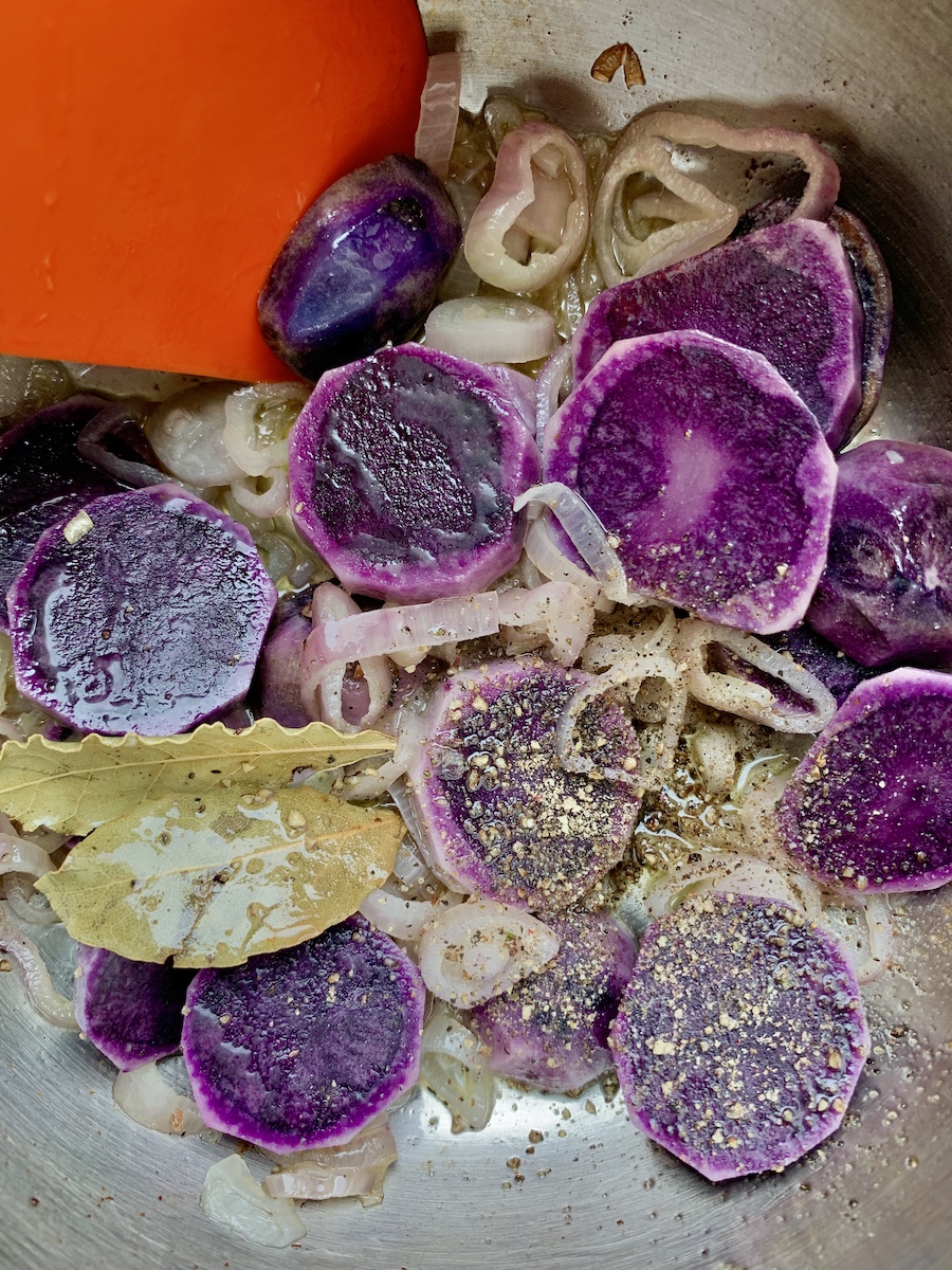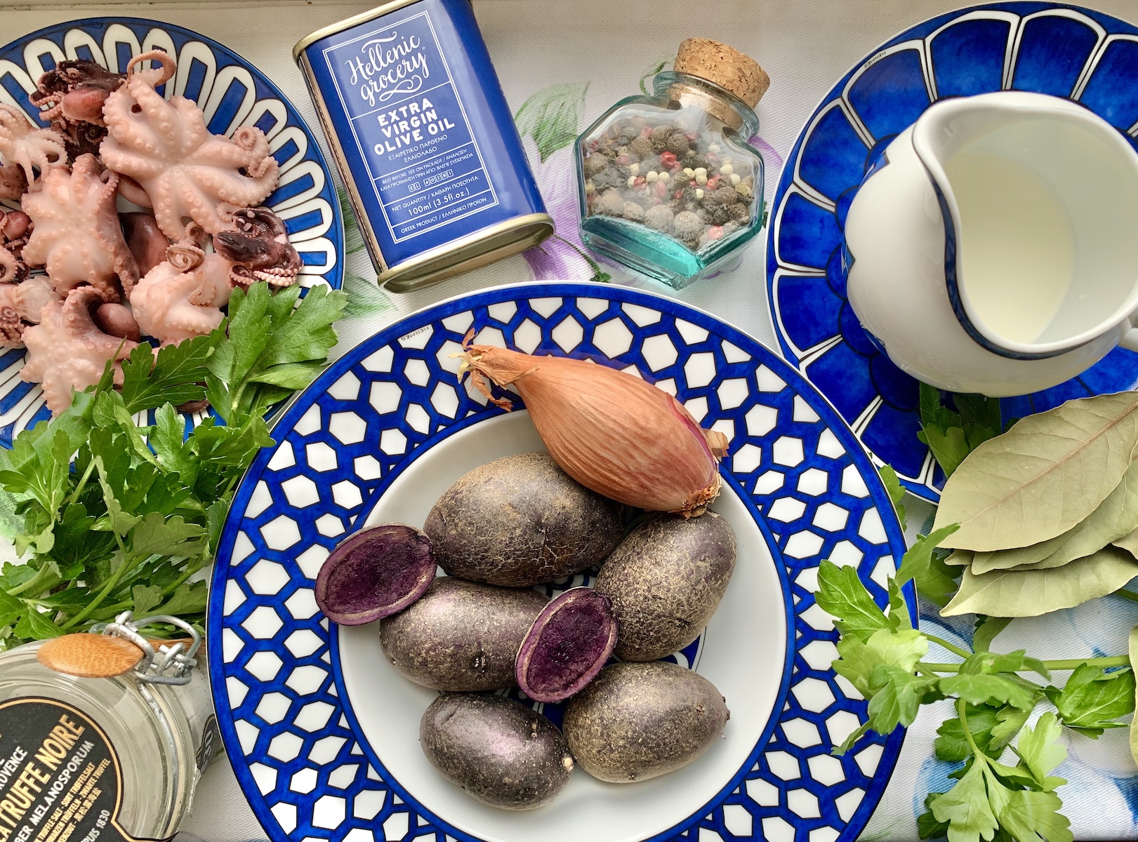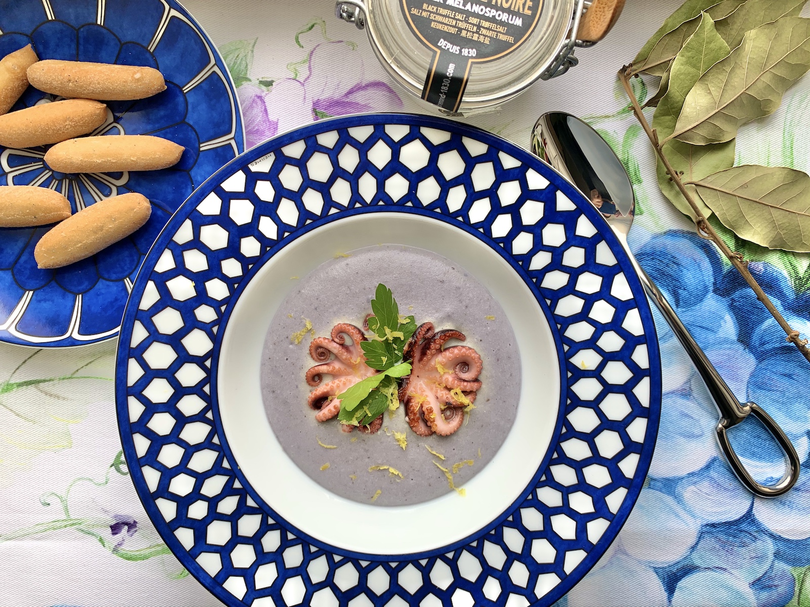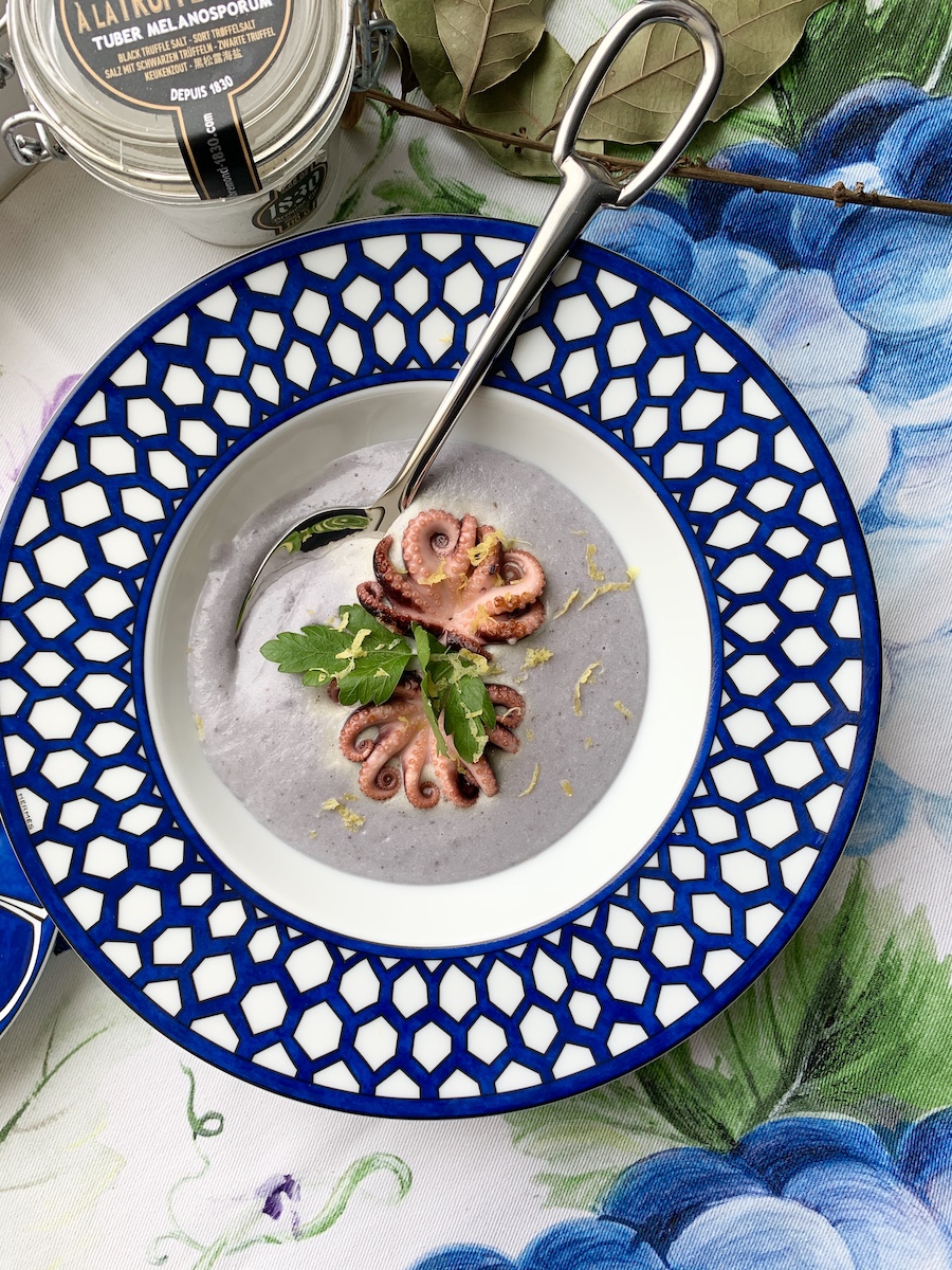 Отже, на одну порцію беремо: 2 середні картоплини (у мене – сині), 1 маленька цибуля-шалот (в оригіналі – порей, але можете сміливо брати будь-яку цибулю), 1 столову ложку вершкового масла, 1 столову ложку оливкової олії, 2 лаврових листя, свіжомелений перець, сіль, воду та 40 мл вершків жирністю 20%. Для подачі: 3 маленькі восьминоги, гілочку петрушки і трохи лимонної цедри.