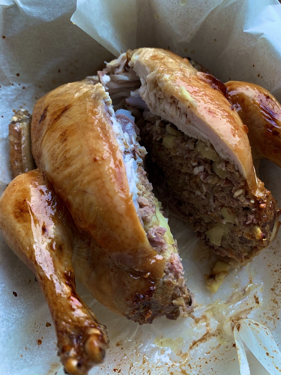 Рецепт из поваренной книги аббатства Даунтон вполне актуален на современном столе. В начале прошлого века ни один аристократический ужин не обходился без мясных блюд. Поварам приходилось прибегать ко всевозможным техникам, чтобы мясо и птицу нужно было всего лишь нарезать и подать под соусом. Так, было принято вынимать из птицы костяк и фаршировать ее. Сегодняшний рецепт – аллюзия на сказку «1000 и 1 ночи», богатый пряный вкус, бывший трендом в 1920-е, когда все помешались на специях и Востоке.