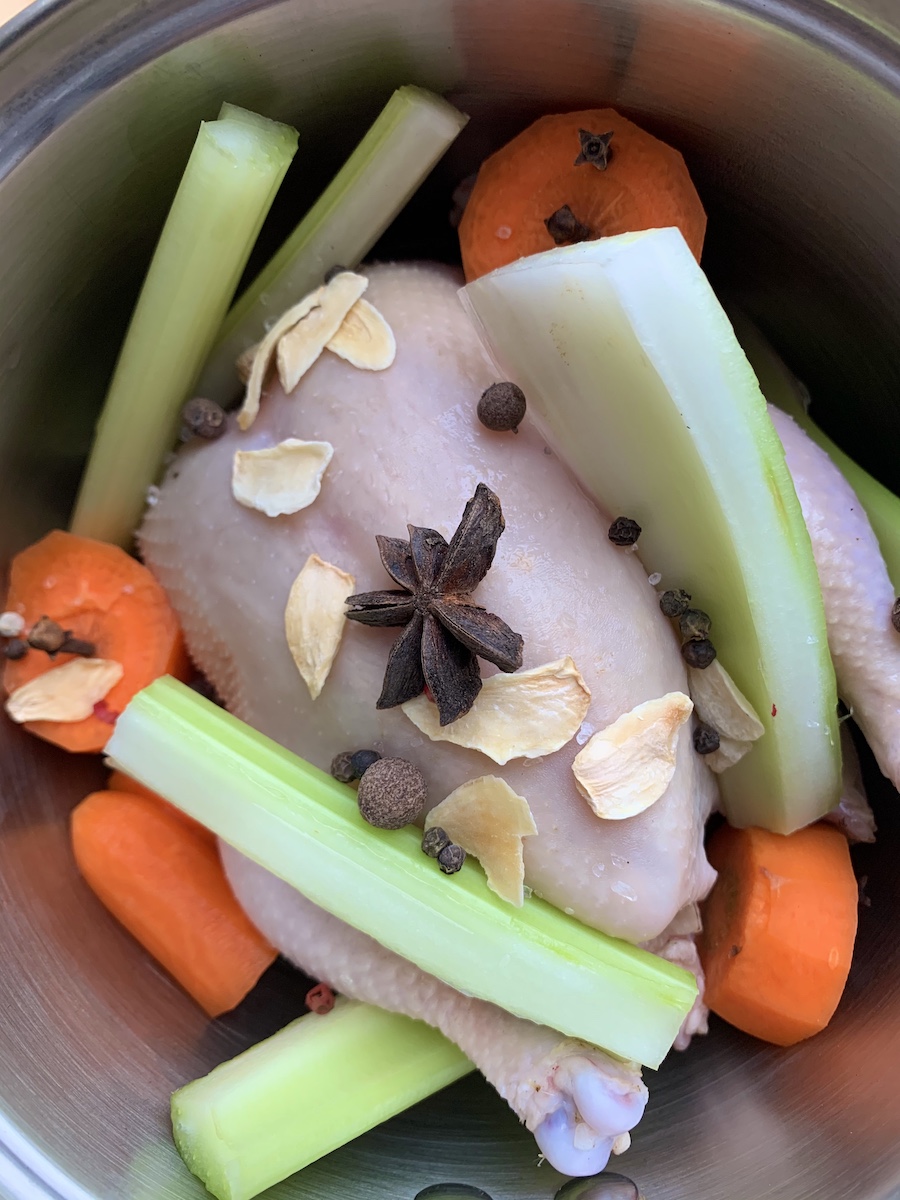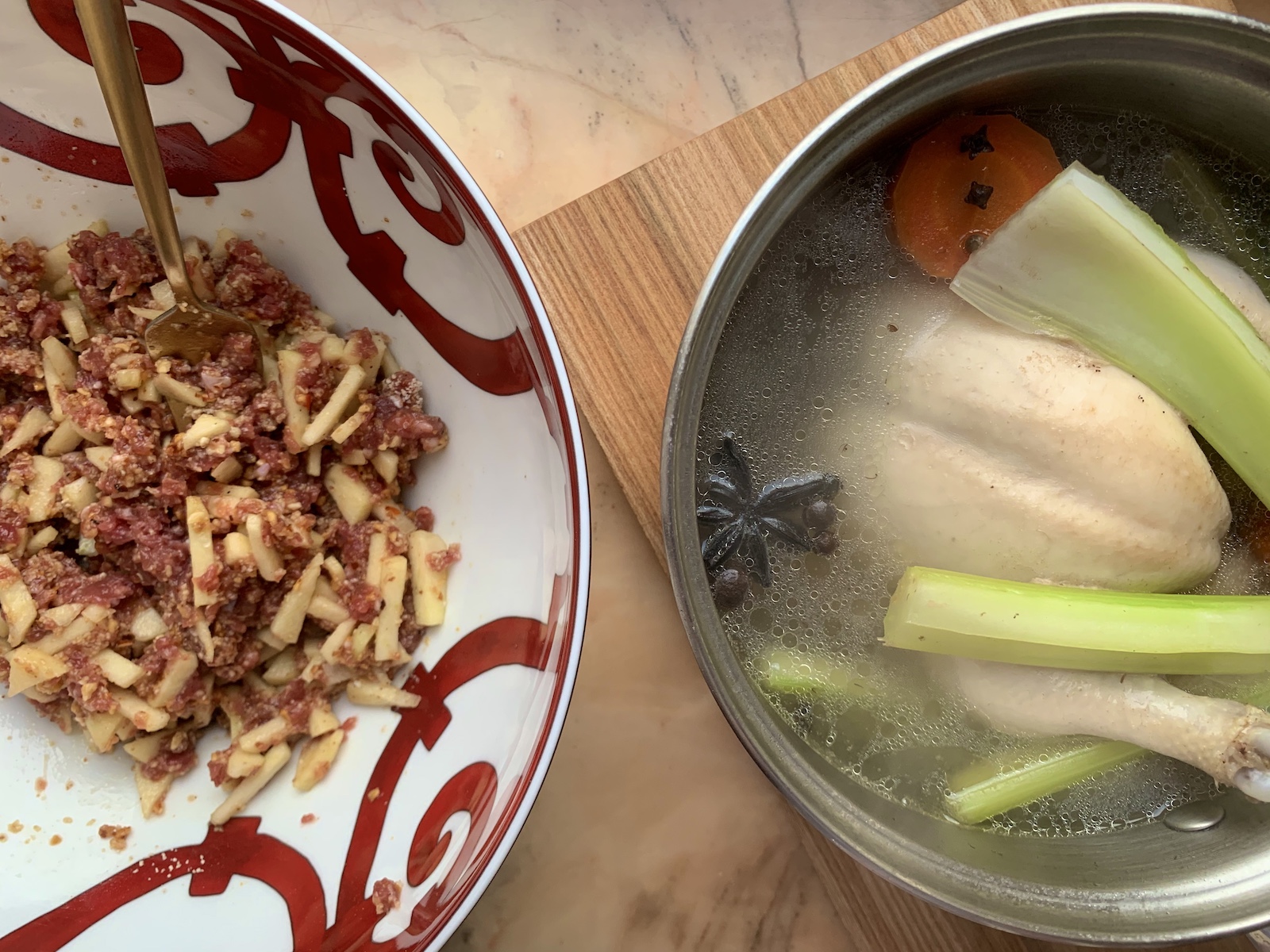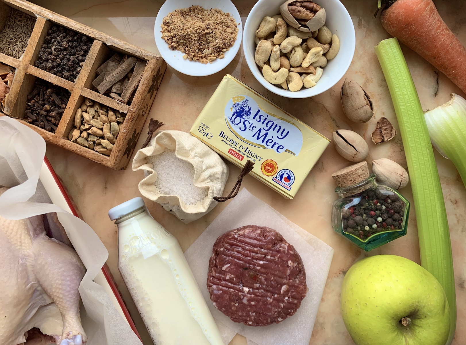 Итак, берем 2 цыпленка, 2 стебля сельдерея, 2 моркови, 2 зубка чеснока, две звездочки бадьяна, 5 веточек гвоздики и разные перцы горошком – для бульона. Для начинки: 200 г говяжьего фарша, 100 г сливочного масла, 100 г фисташек, 30 г миндаля, 1 яблоко, цедра 1 лимона, кориандр, гвоздика, кардамон, соль, перец, 1 яйцо. Для соуса: 2 столовые ложки сливочного масла, 2 столовые ложки муки, белый перец, фисташки, бульон.