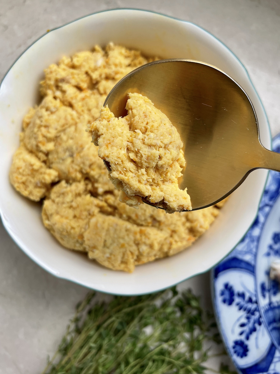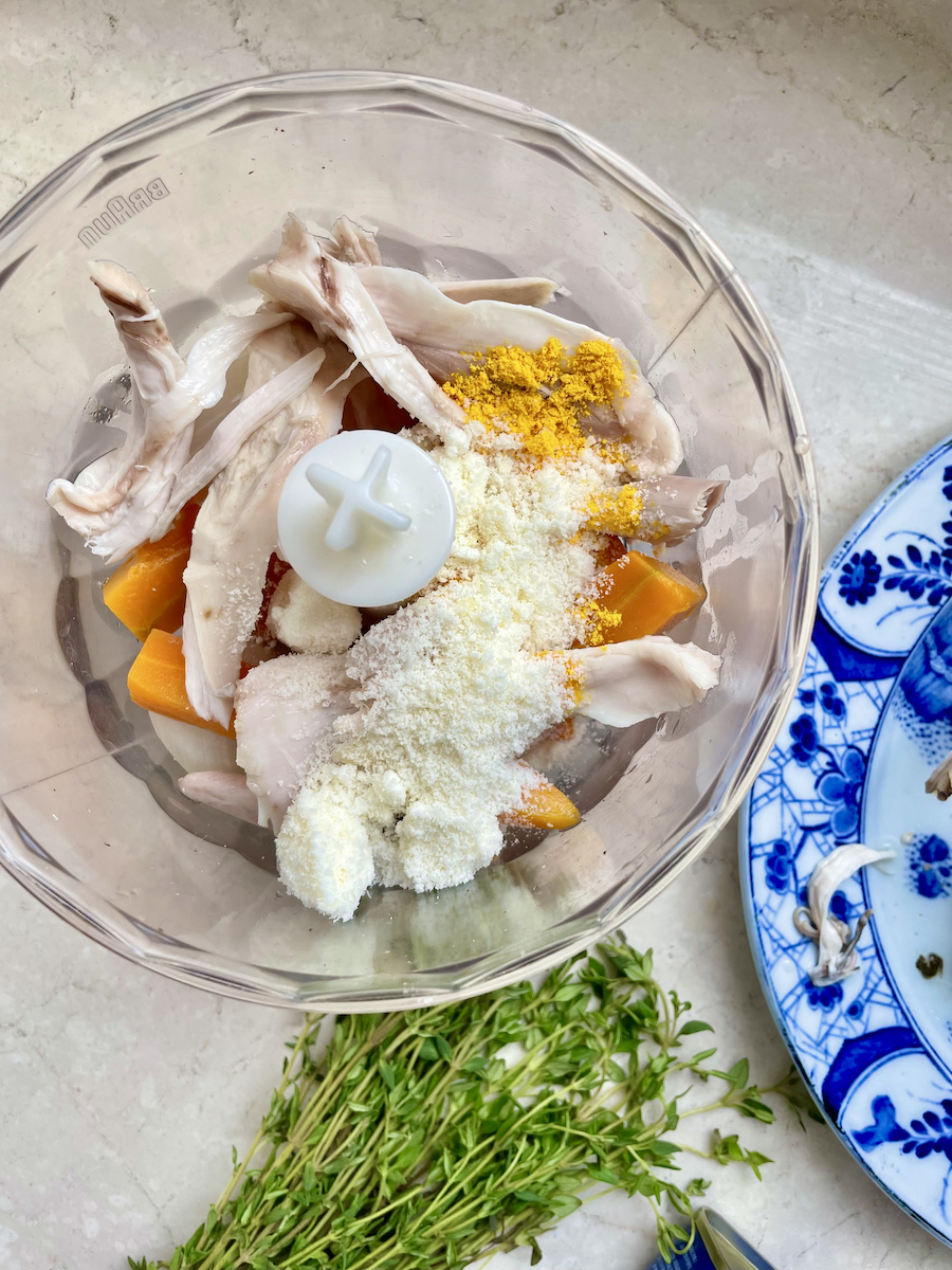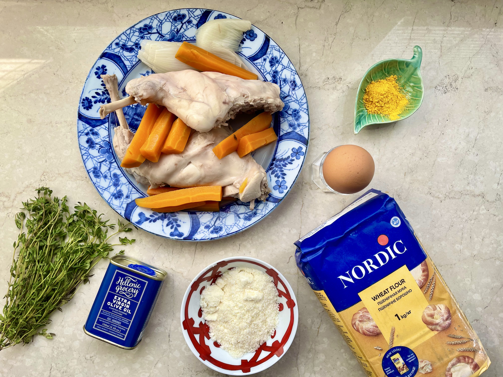 В кастрюлю сложить ножки кролика, очищенные морковь и лук, бадьян, тимьян, перец, соль, все залить водой и варить до готовности мяса. Далее дать всему остыть, разобрать ножки, пропустить вместе с морковью и луком через мясорубку (или блендировать), добавить куркуму, пармезан, чеснок, соль и перец по вкусу, хорошо перемешать, отправить в холодильник. В чашу комбайна просеять муку. Отдельно смешать воду, яйцо, масло и соль, добавить к муке и замесить эластичное тесто.