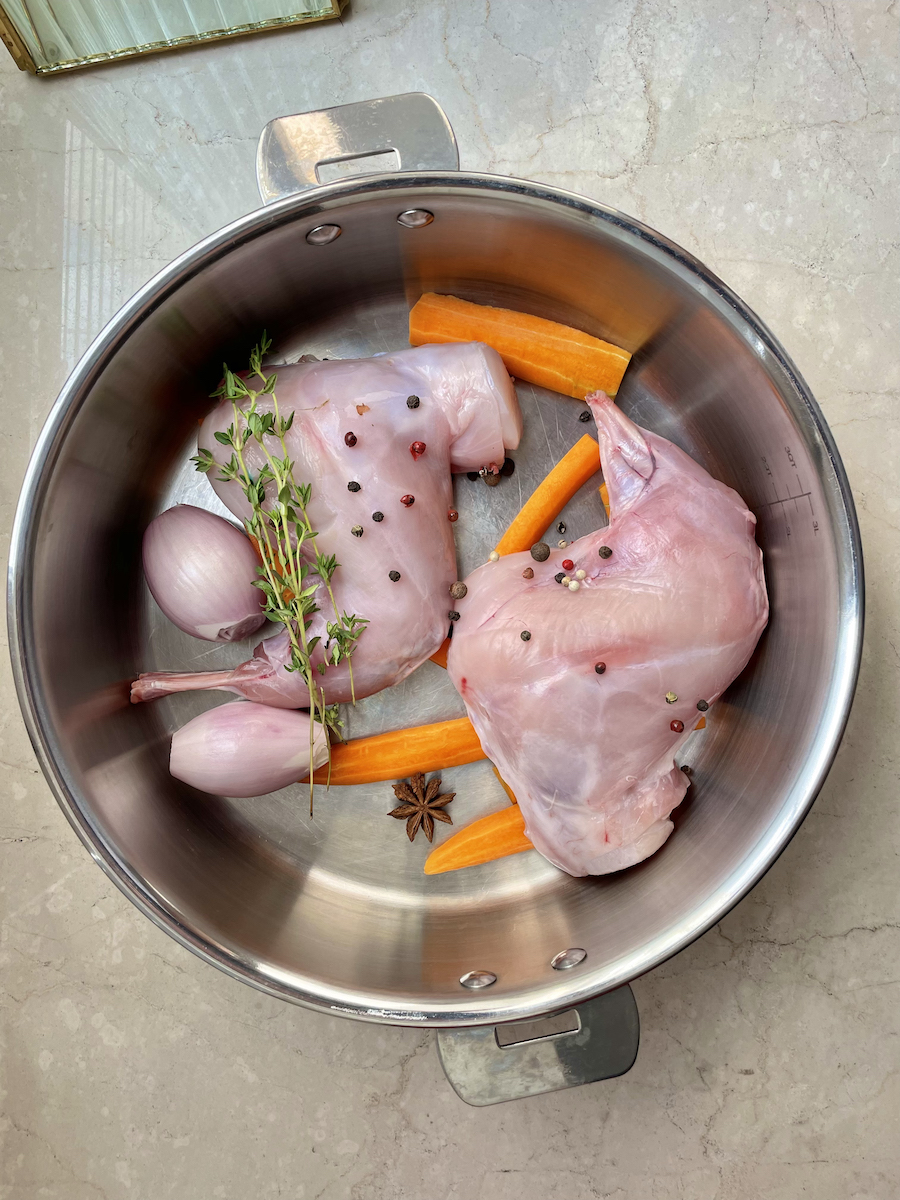 Итак, для начинки берем две задних ножки кролика (с бедром), одну большую морковь, 2 лука-шалот, несколько горошин разных перцев, звездочку бадьяна, несколько веточек свежего тимьяна, чайную ложку сушеного чеснока, столовую ложку без горки куркумы, соль, 3 столовые ложки тертого пармезана. Для лучшего (на мой взгляд) теста: 650 г муки, 250 мл воды, 1 яйцо, 20 мл растительного масла, соль. Для подачи: сливочное масло, сметана, тимьян.