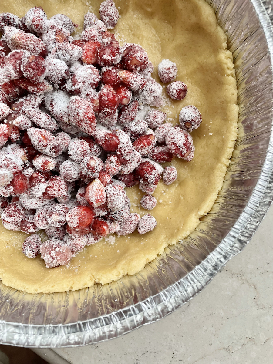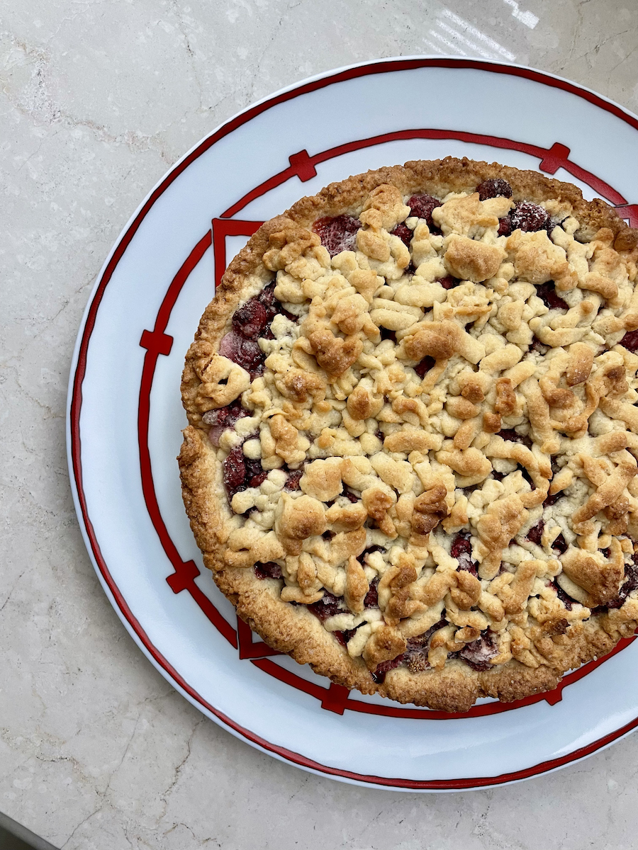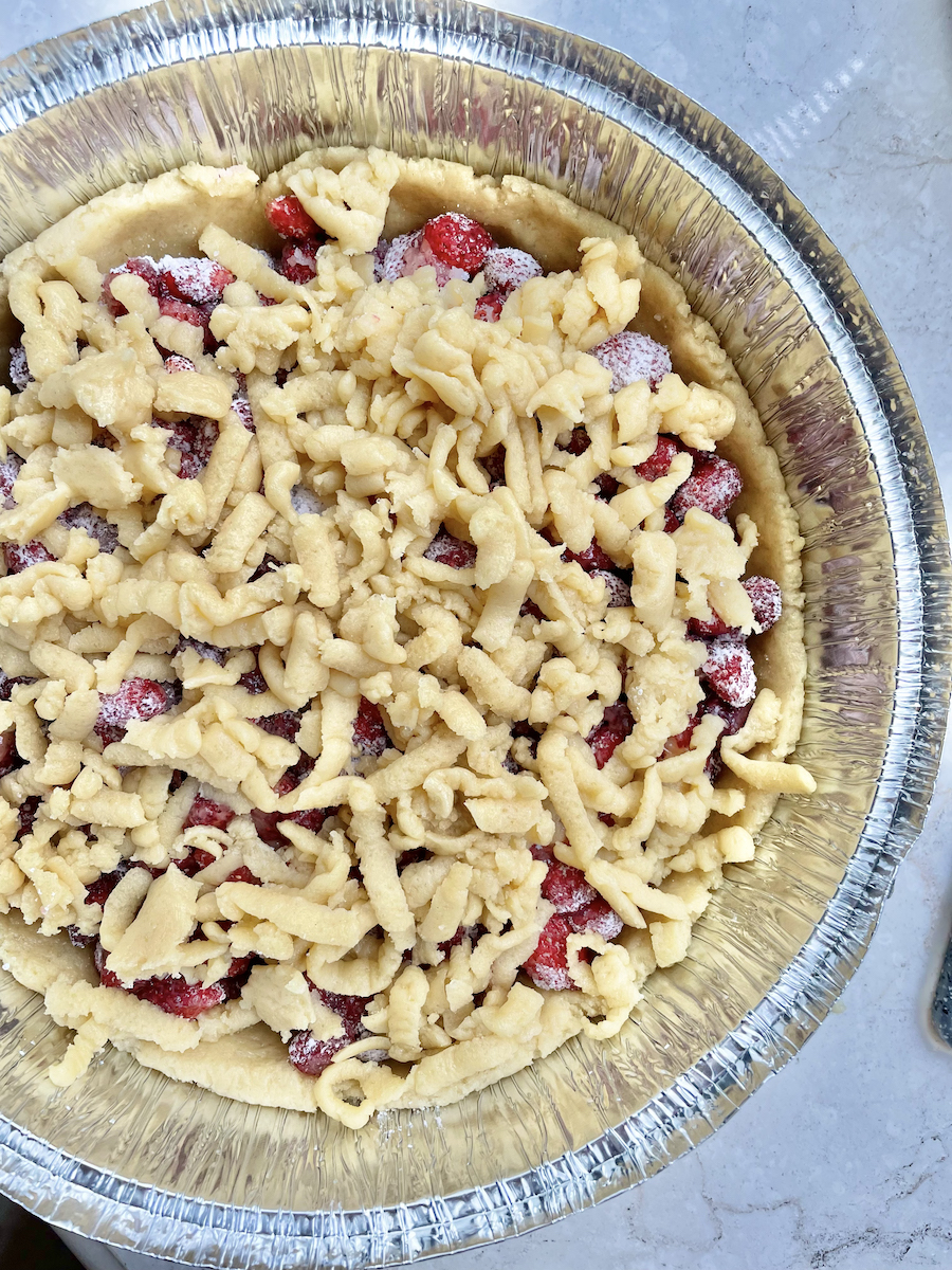 Из большей части теста сделать корзинку, распределив его по форме для запекания. Равномерно выложить ягоды. Оставшееся тесто натереть на терке и распределить ровным слоем по ягодам. Отправить пирог в духовку на 35 минут.