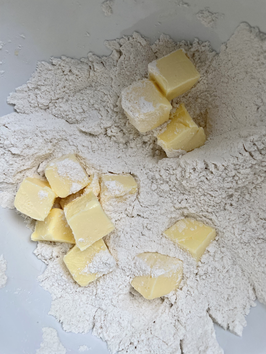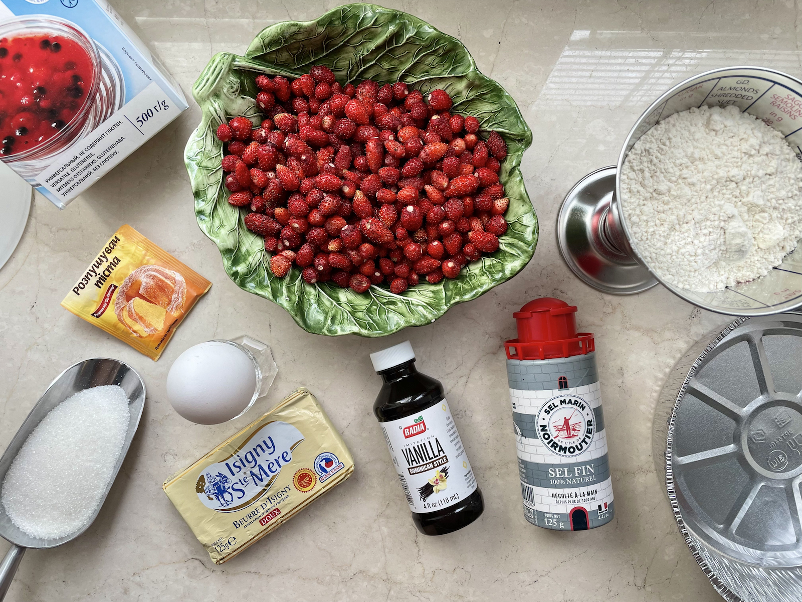 Итак, берем 200 г просеянной муки, 50 г сахара, 5 г разрыхлителя, щепотку соли, 100 г холодного сливочного масла, 1 яйцо, 1 чайную ложку ванильной эссенции, 200 г земляники, столовую ложку сахара, ½ столовой ложки крахмала.