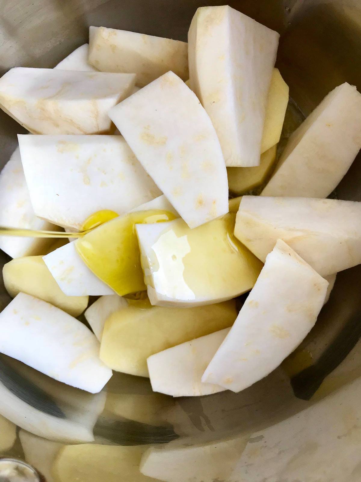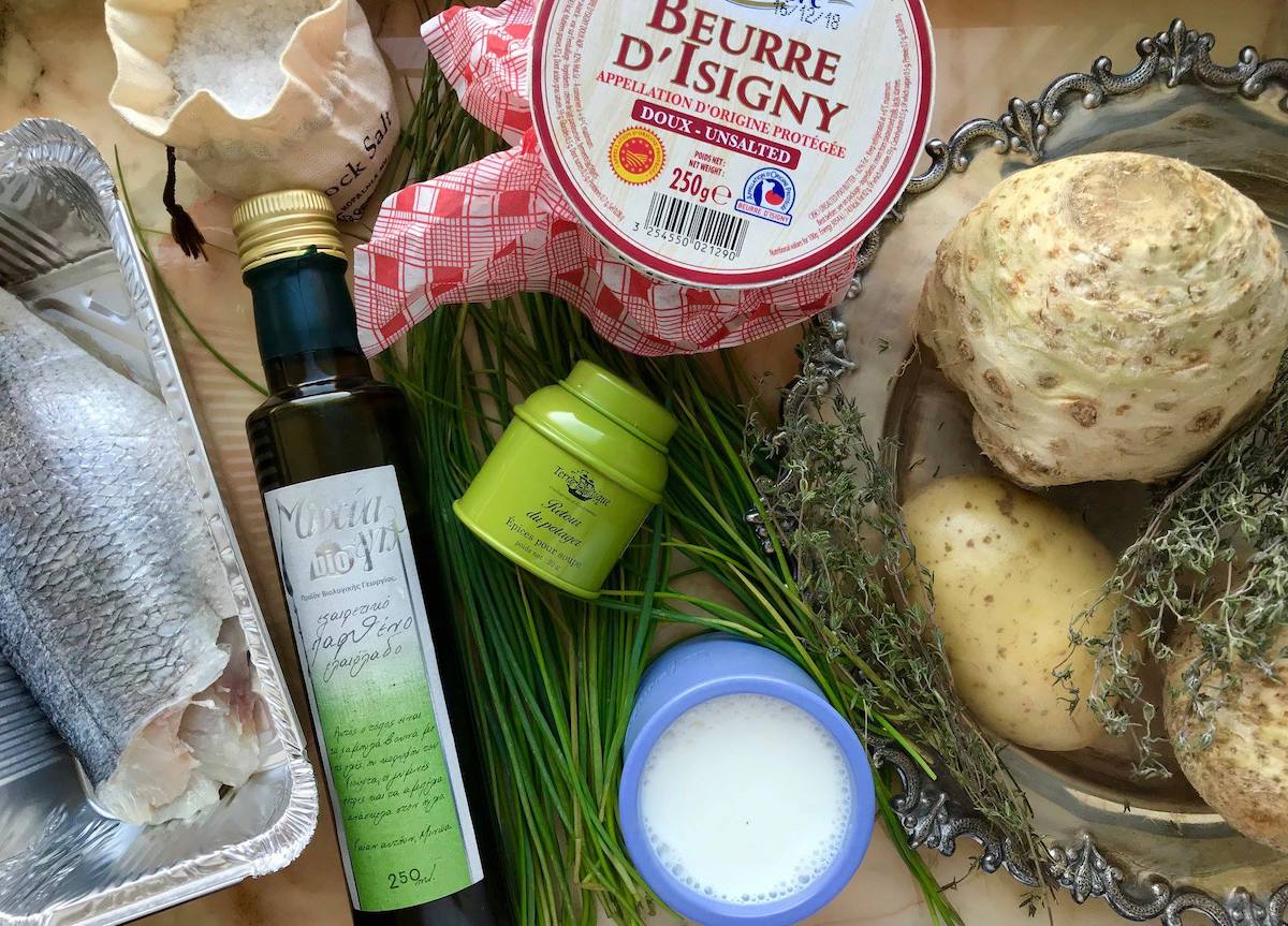 Итак, берем 750 г корня сельдерея, 200 г картофеля, 200-250 мл молока, сливочное и оливковое масло, соль, свежемолотый перец, 2 филе дорады (250 г) и шнитт-лук, смесь сушеных овощей и трав для вкуса, сушеный тимьян.