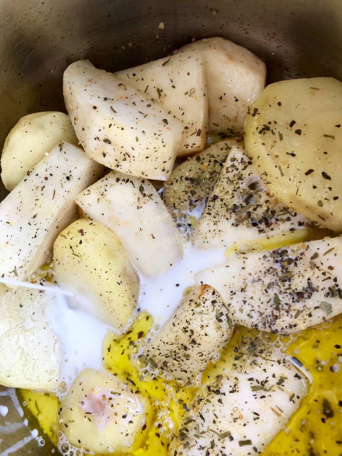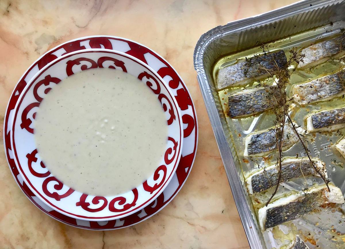 Духовку разогреть до 190 градусов. Сельдерей и картофель очистить, нарезать крупными кусками. В сотейнике растопить сливочное масло, сложить в него овощи и готовить 5 минут, постоянно помешивая. Добавить немного оливкового масла, соль, свежемолотый перец и сушеные травы, перемешать и залить молоком так, чтобы покрыть все овощи. Накрыть крышкой, довести до кипения, убавить огонь и готовить 20 минут – до готовности овощей. Рыбу нарезать ломтиками, сложить в форму,посолить, поперчить, сверху выложить веточки сушеного тимьяна и сбрызнуть оливковым маслом. Поставить форму в разогретую духовку на 15-20 минут.