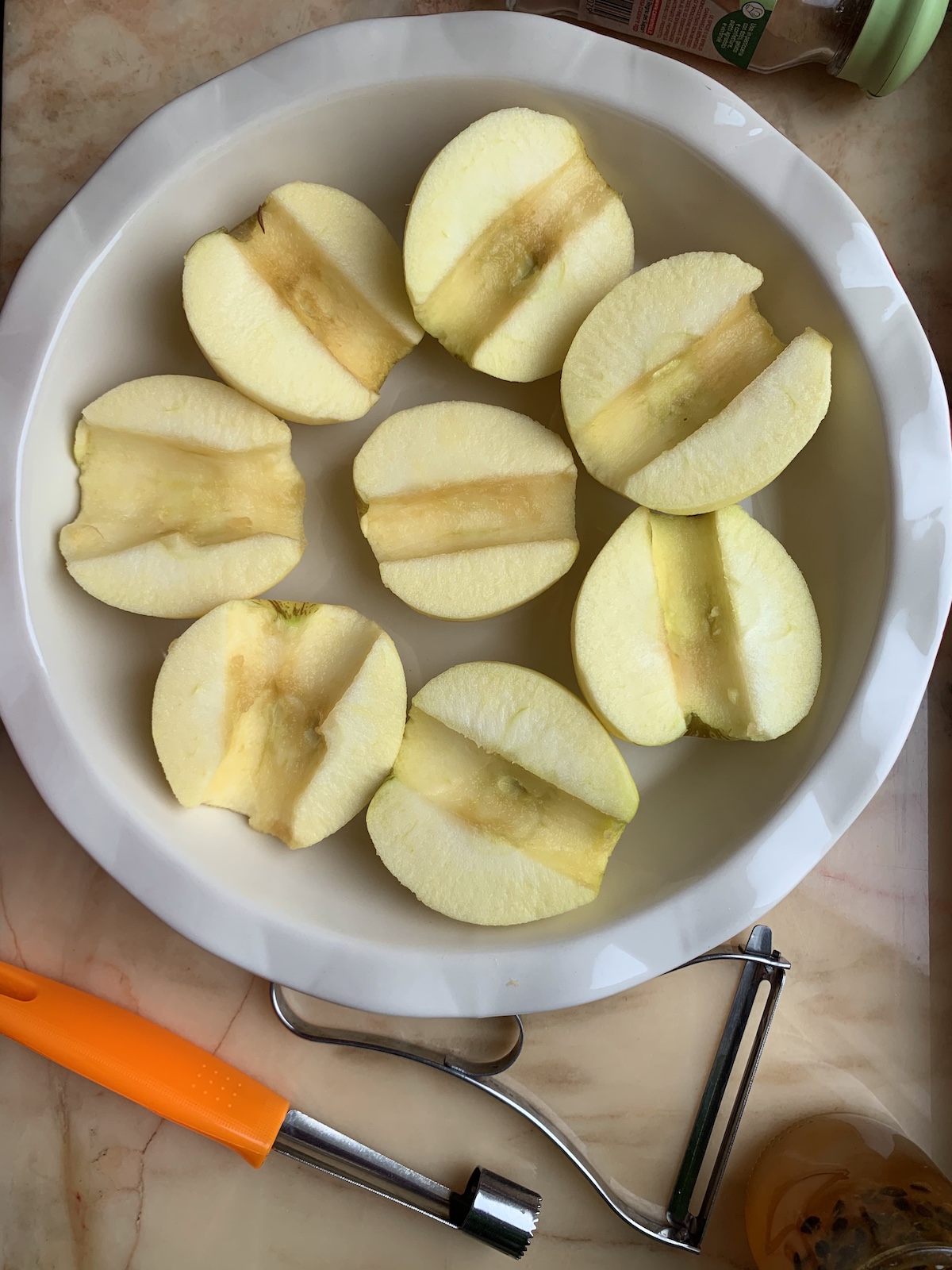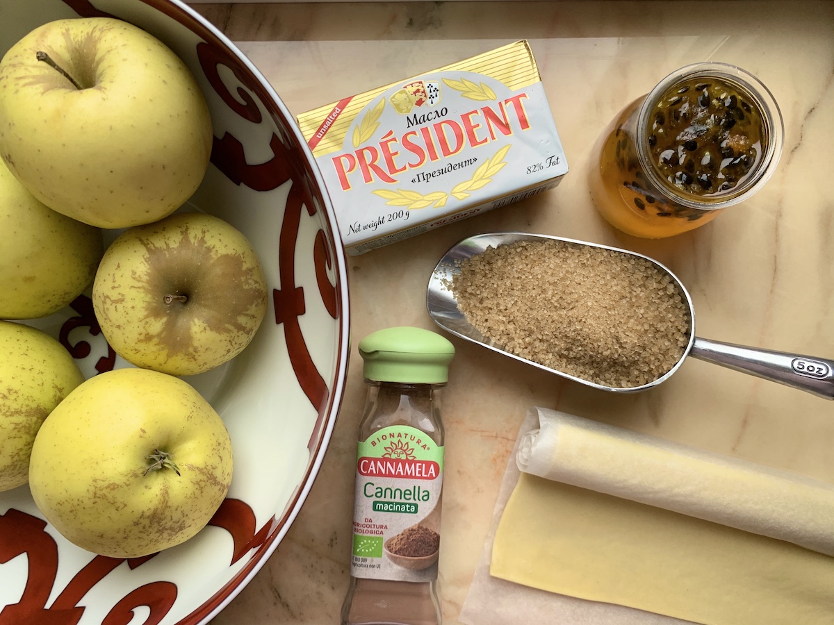 Итак, берем 1 лист живого слоеного теста, 4 средних яблока сорта «голден делишез», 100 г сахара, 20 г сливочного масла, 1 плод маракуйи или 50 г варенья из маракуйи (сиропа), немного корицы.