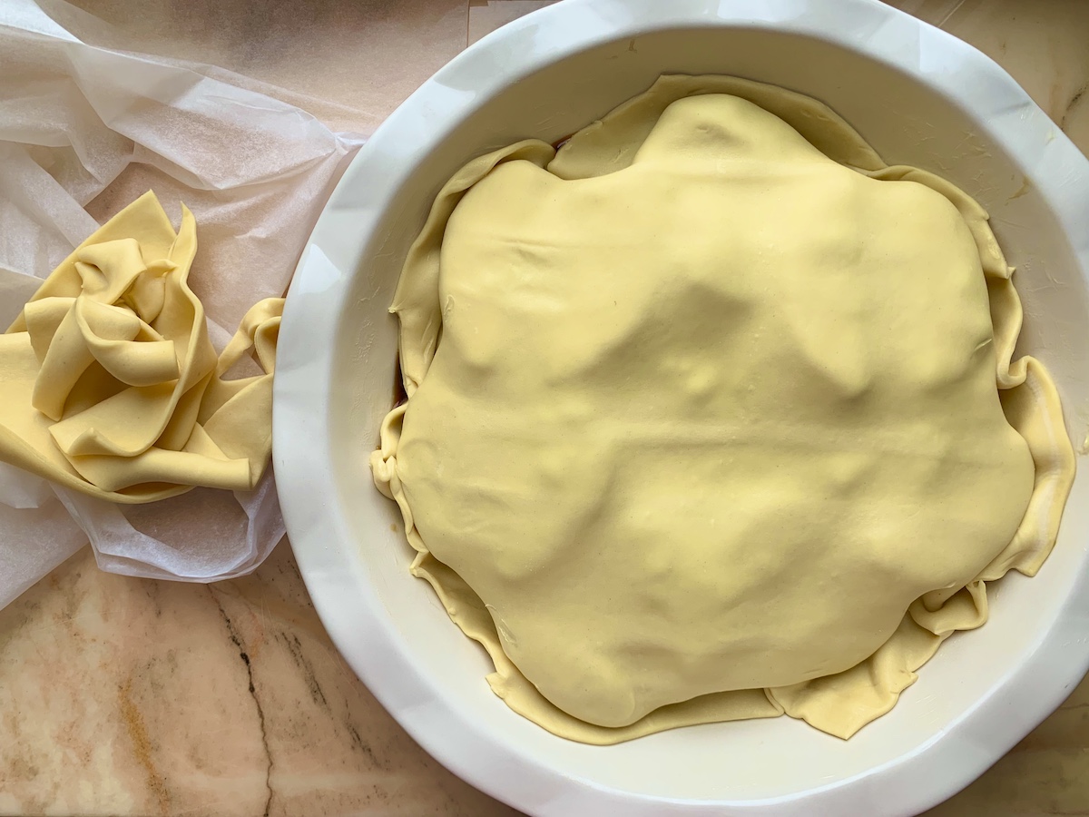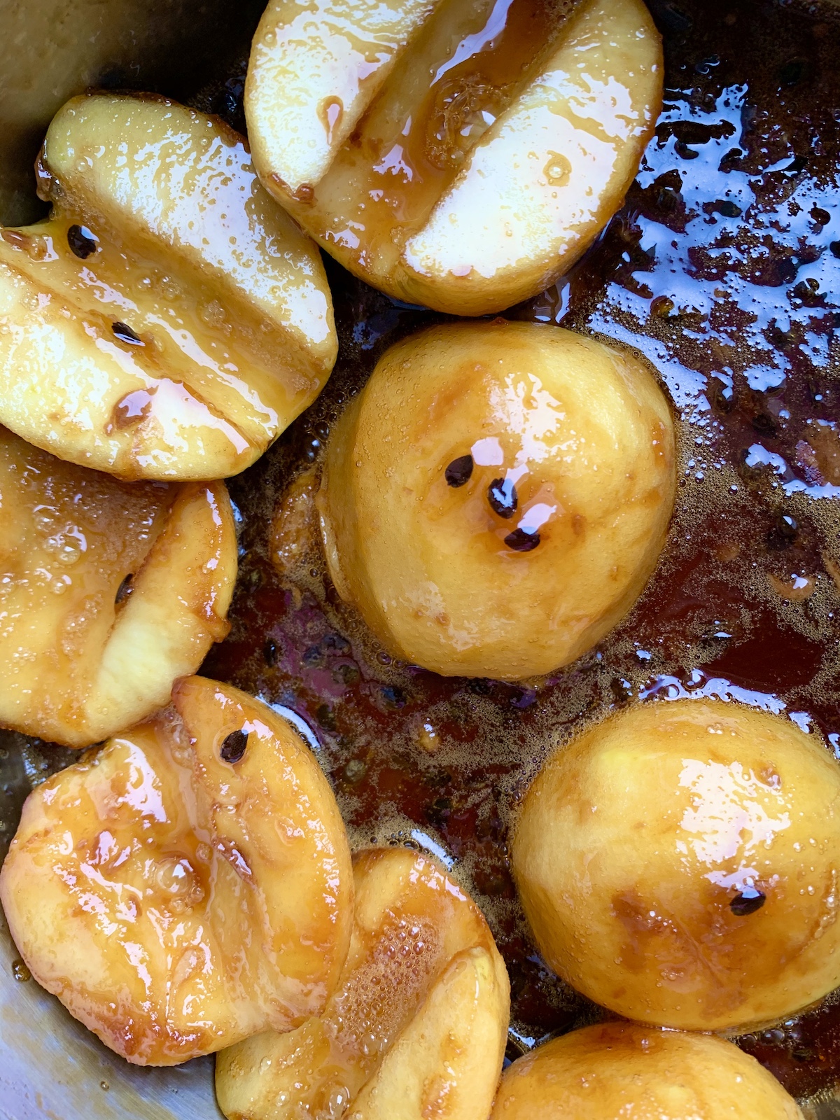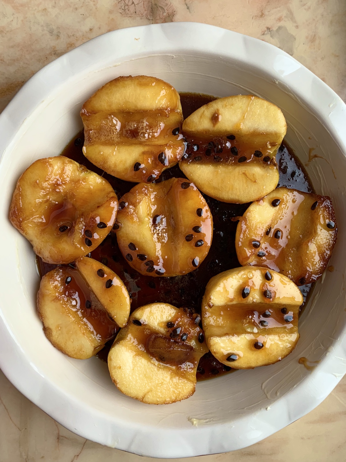 Яблоки очистить от кожуры, сердцевины и разделить на половинки. В сковороде расплавить сахар, положить в него яблоки и карамелизировать их. Добавить маракуйю, хорошо перемешать. Форму для запекания смазать сливочным маслом, выложить яблоки, накрыть листом теста, заправив края.