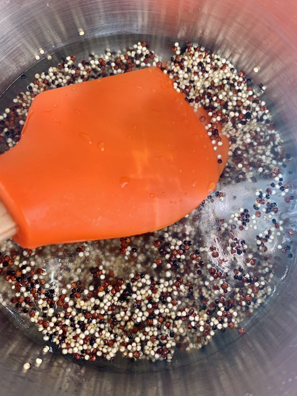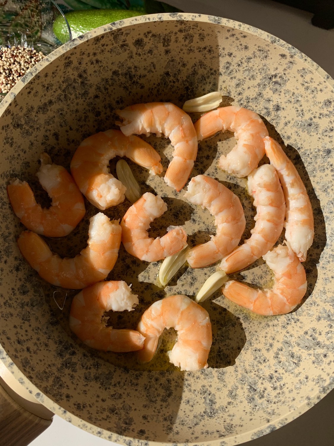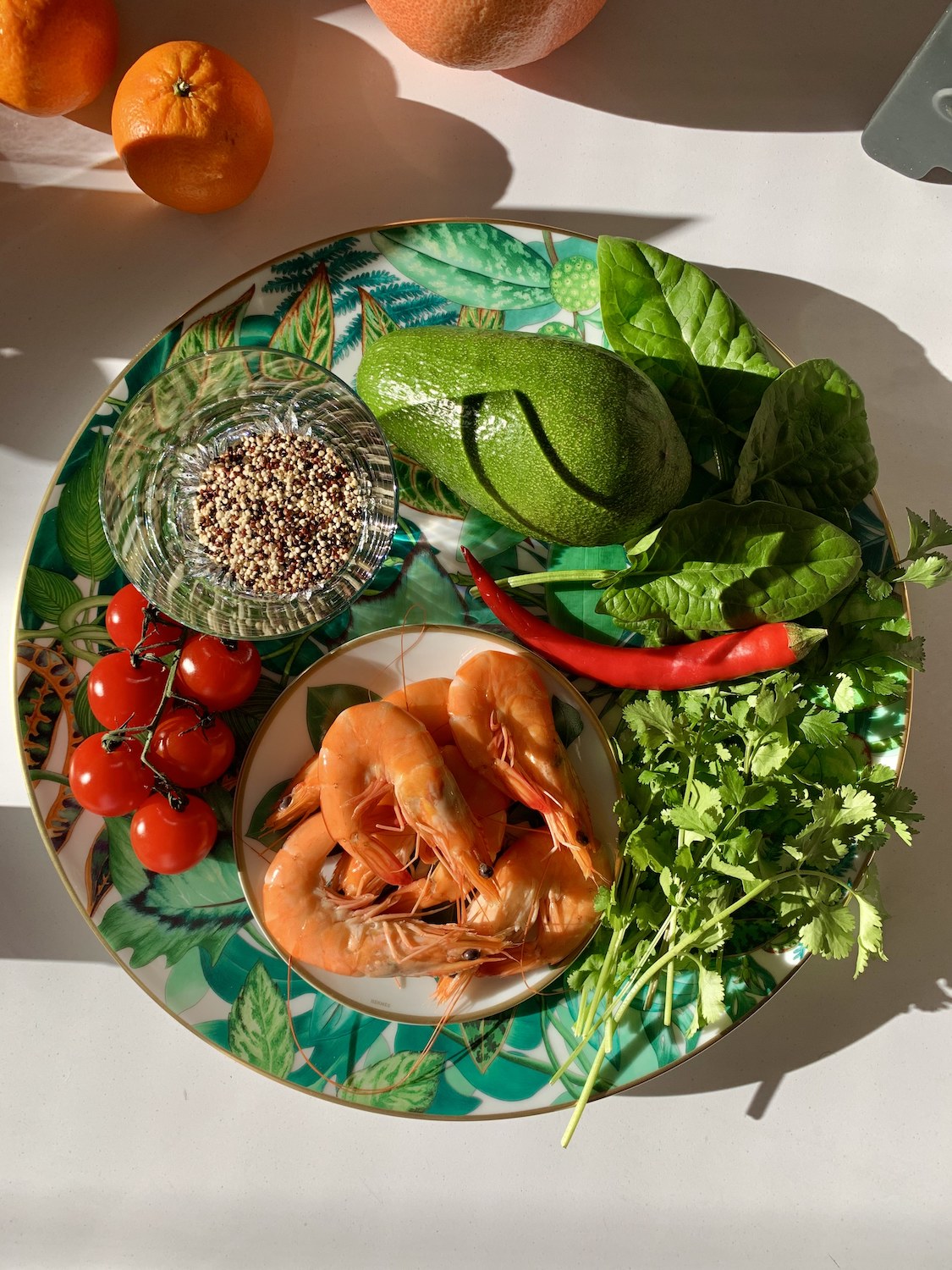 Итак, берем 50 г киноа (у меня смесь из трех видов – белой, черной и красной), 100 мл теплой воды, 3 столовые ложки оливкового масла, горсть шпината и кинзы, горсть помидоров черри, ¼ авокадо, соевый соус, зубок чеснока, немного свежего чили, дюжину средних креветок.