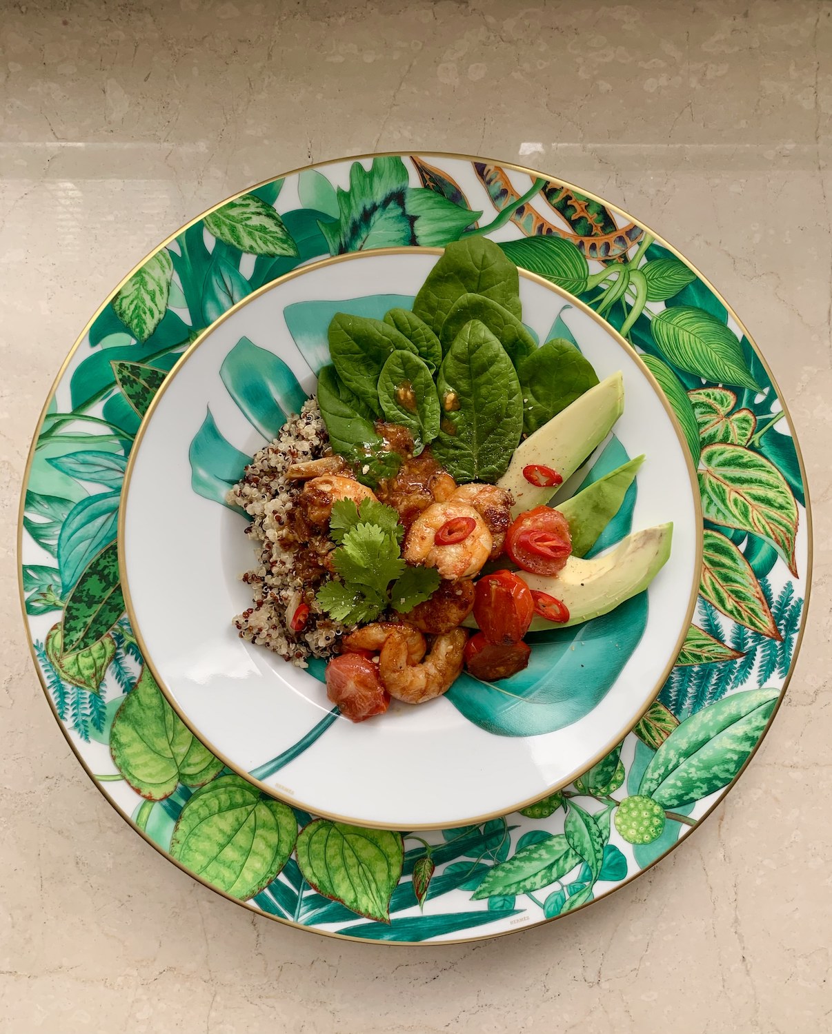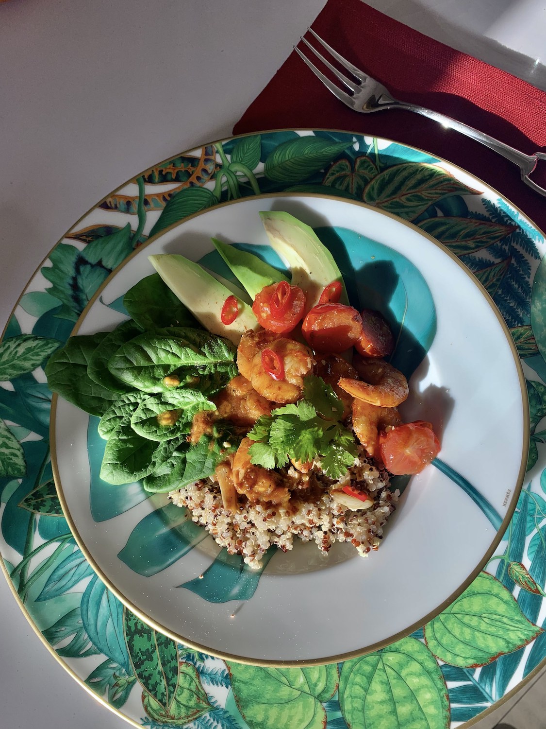 Получившаяся жидкость – заправка к нашему салату. В глубокую тарелку выложить киноа, добавить шпинат, ломтики авокадо, сверху выложить креветки, помидоры, немного чили и кинзу. Все полить соусом и немедленно подать.