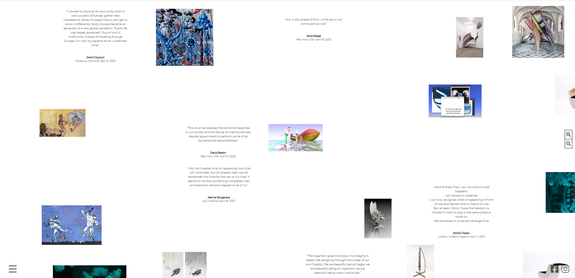 Сегодня проект включает в себя раздел выставки, в котором работы и цитаты художников двигаются по экрану монитора как под микроскопом. При добавлении новых работ поле автоматически увеличивается, принимая в себя новых мастеров. Также проект имеет раздел участников выставки, в котором собран структурированный архив всех авторов с кратким и понятным описанием их творческой деятельности, их произведений и размышлений относительно странного времени, как они его воспринимают и что они чувствуют. В разделе «3 вопроса – 3 ответа» собраны эксклюзивные интервью с художниками, которые отвечают на очень важные и личные вопросы, все эти тексты размещены на общем экране. Таким образом можно читать разные мнения, сравнивать и иметь представления о мироустройстве через призму художественного взгляда.
