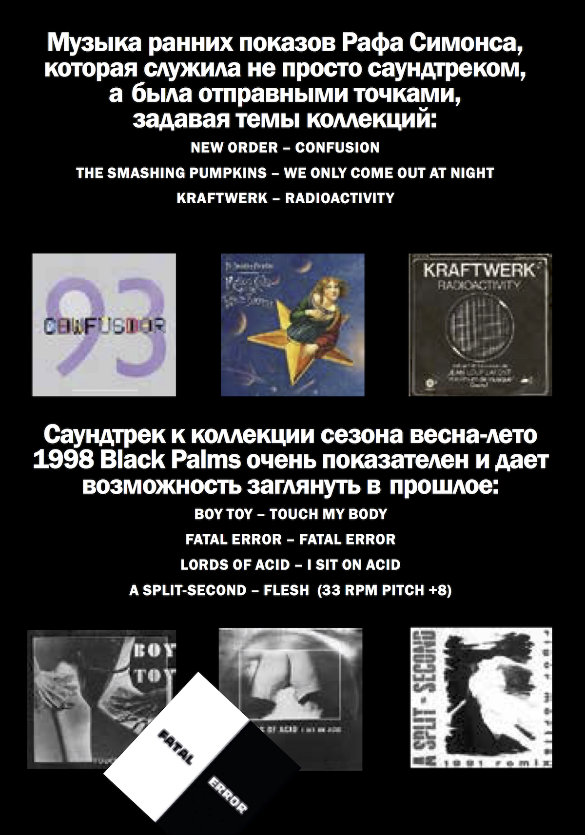 Симонс стажировался в студии как раз в период работы над коллекцией весна-лето 1990 под названием «Мода – мертва!» Приглашением на показ служила поддельная газета с рекламой несуществующего парфюма «Излишества = выбор его Господина», флакон которого и маску с заглавной фотографии создал именно Раф.