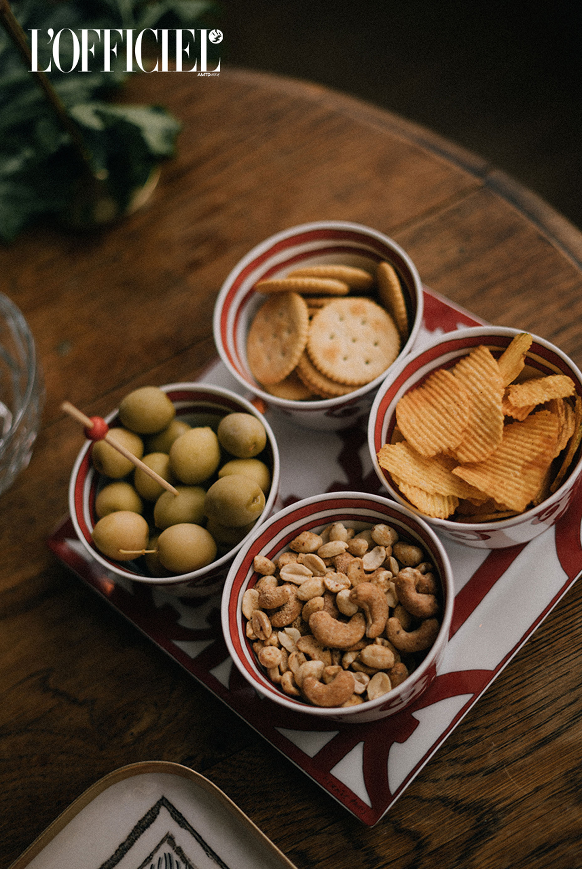 Подаю коктейль з аксесуарами: оливки, крекери, горішки та чипси.