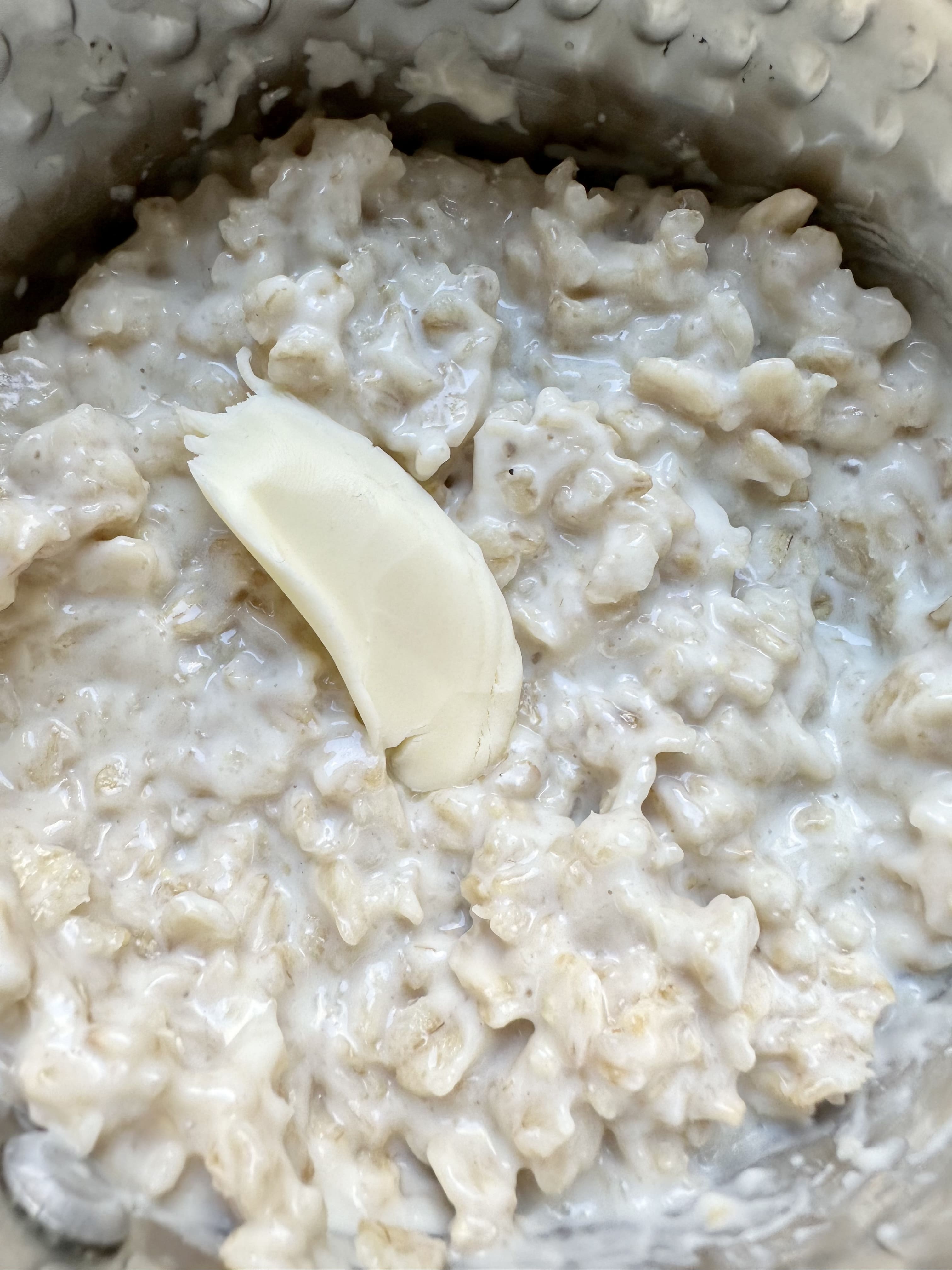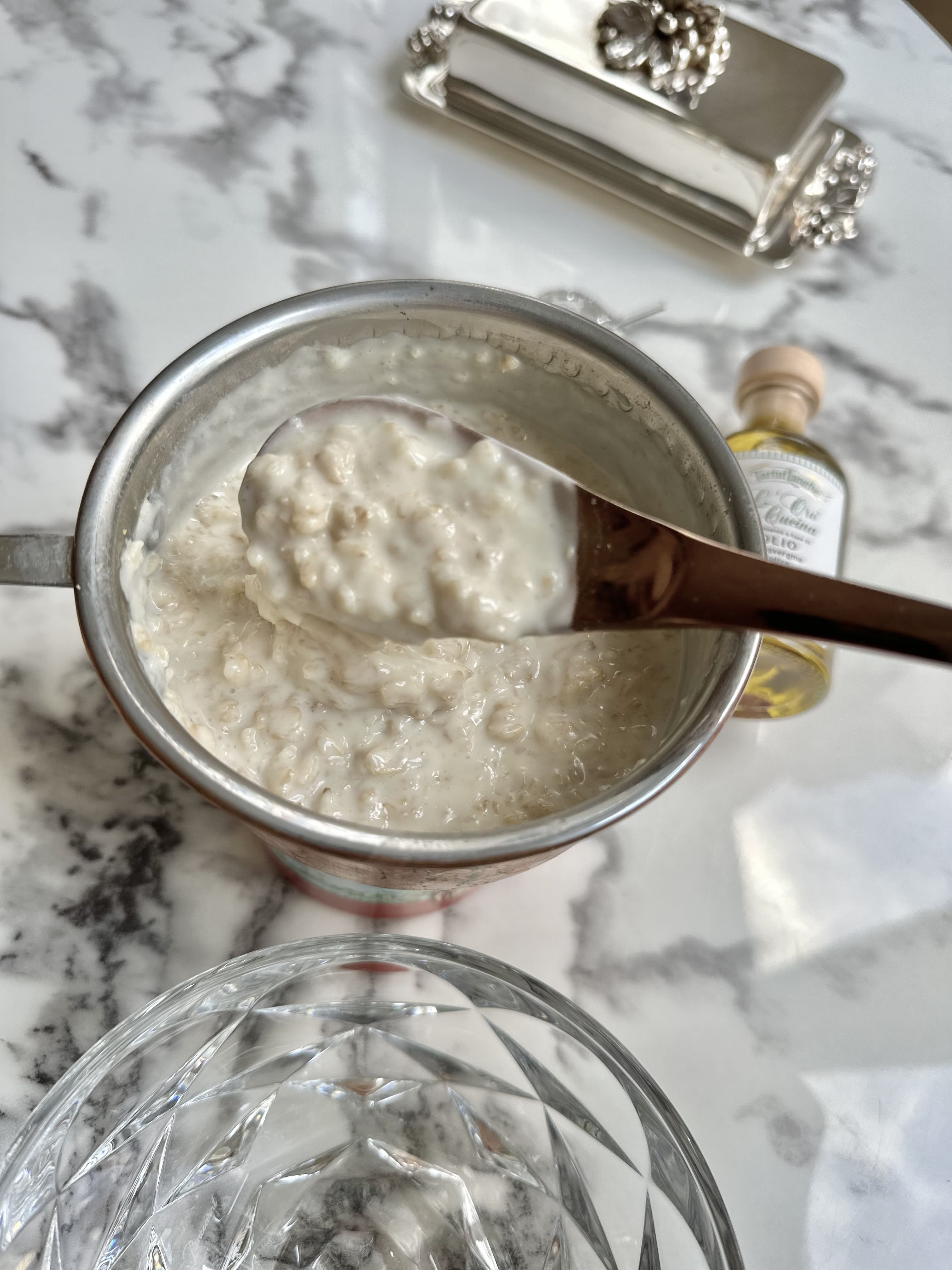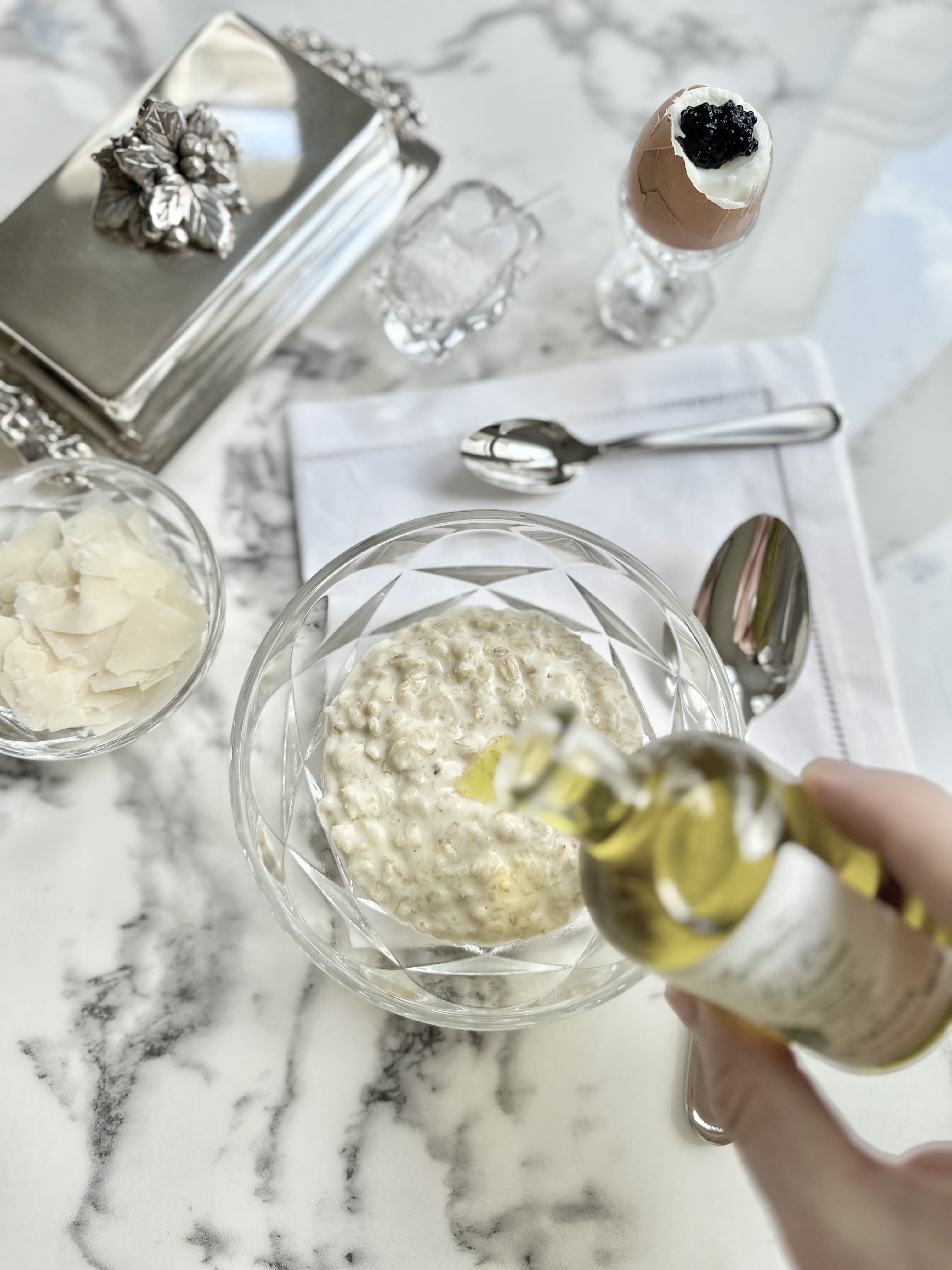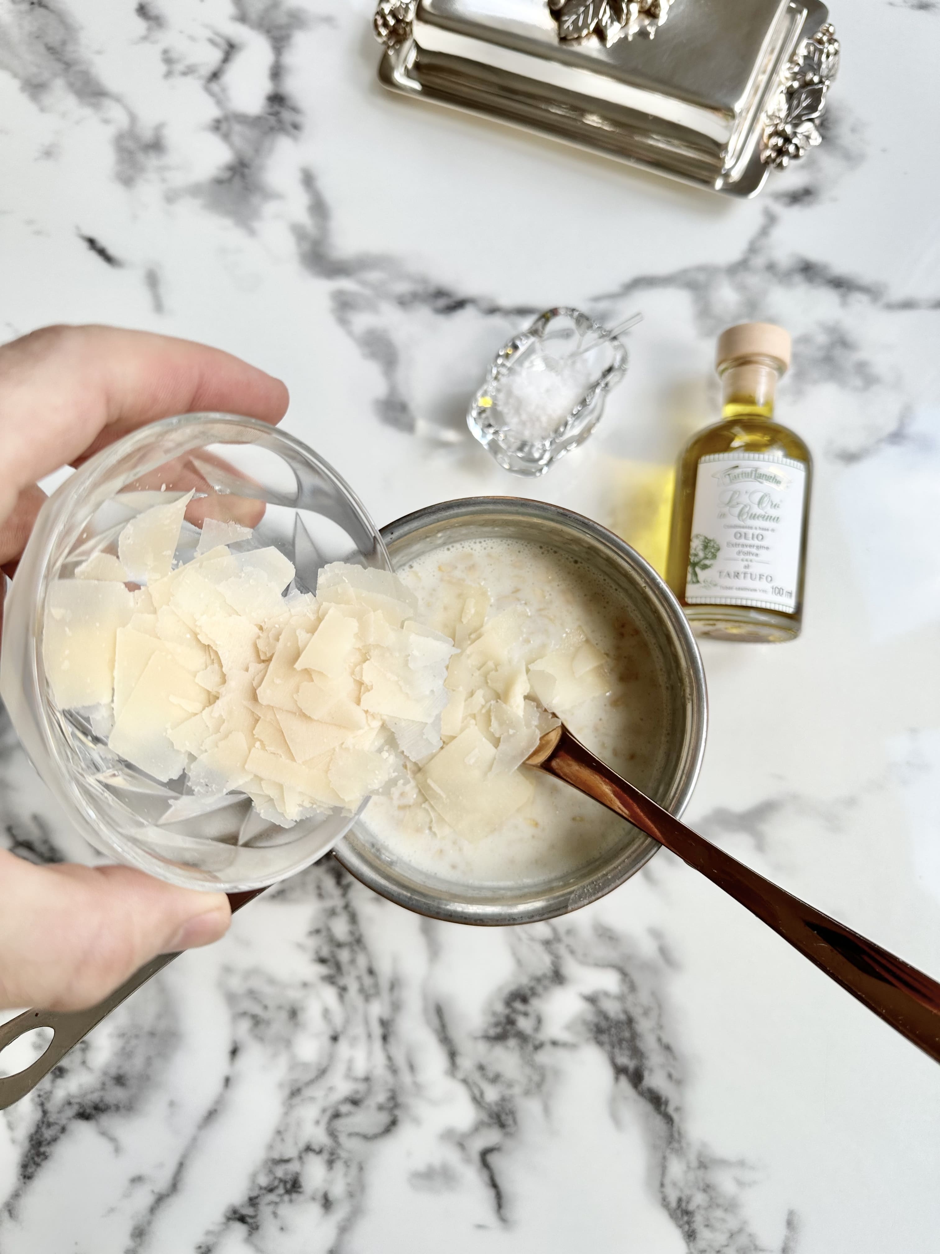 Отже, на одну порцію беремо: 3 столові ложки вівсяних пластівців із гіркою, 230 мл молока, щіпку солі, 20 г пармезану, чайну ложку трюфельної олії.