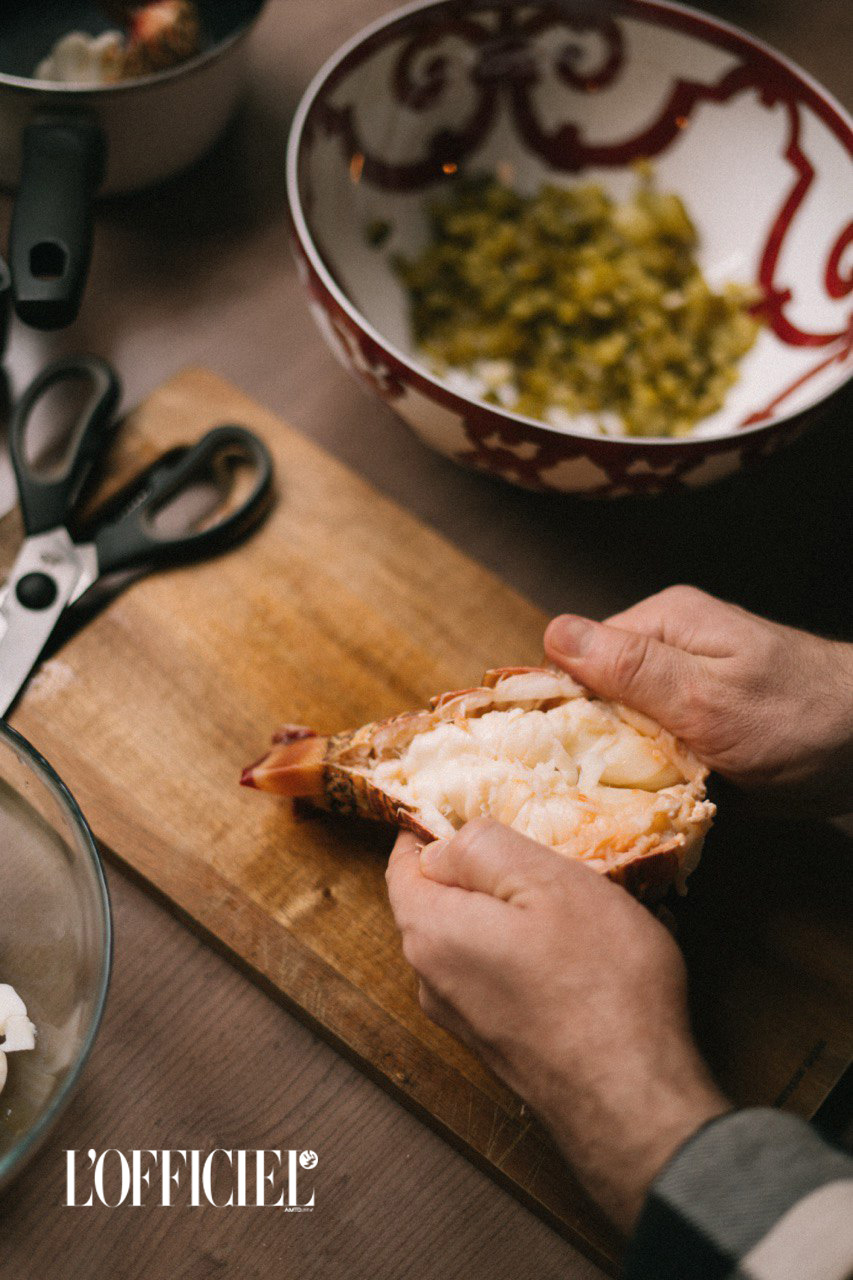 Хвости лобстера скласти в каструлю, залити водою і довести до кипіння. Злити гарячу воду, знову залити холодною, довести до кипіння, прибрати з вогню та залишити під кришкою на 10 хвилин. Очистити хвости від панцирів за допомогою ножиць та нарізати м'ясо.
