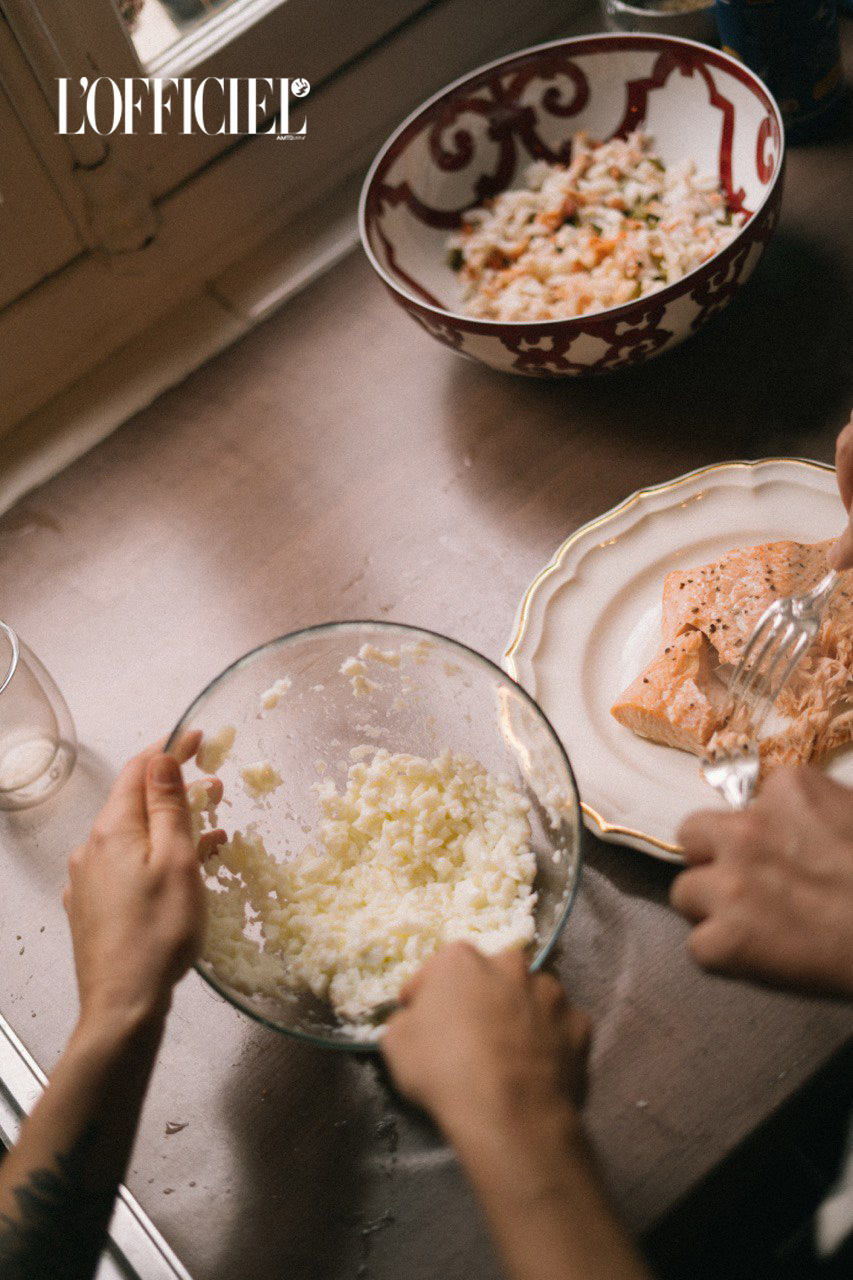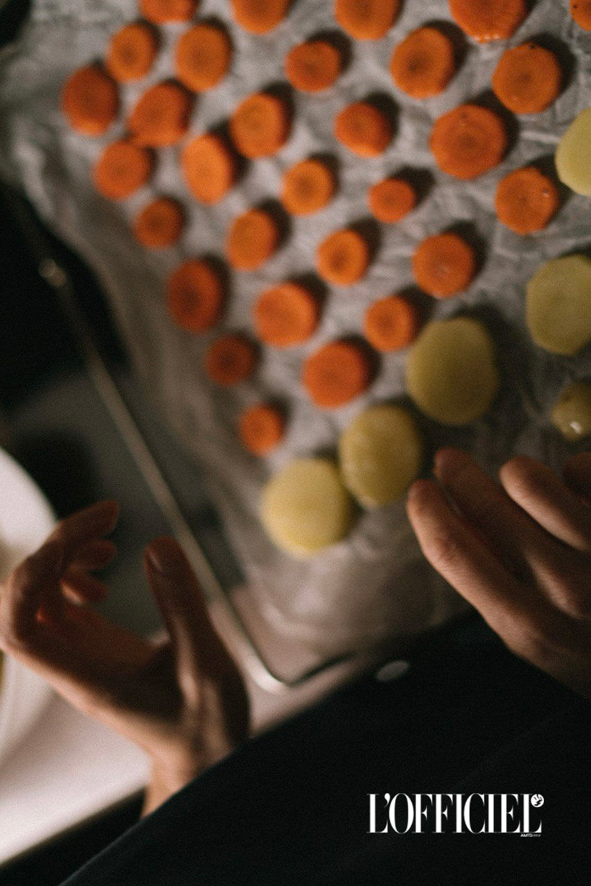 Духовку розігріти до 180 градусів. Картоплю і моркву очистити, нарізати кільцями товщиною 5 мм, збризкати оливковою олією, приправити сіллю і перцем, викласти рівними рядами на деко і відправити в духовку до появи рум'яної скориньки  (до 30 хвилин). Туди ж відправити приправлений сіллю та перцем шматок лосося.
