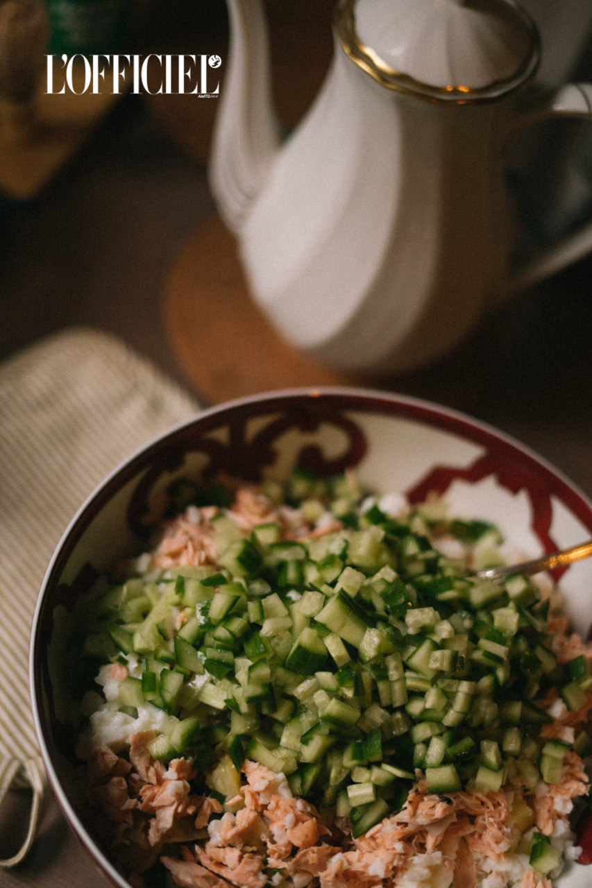 300 г свіжого лосося, 2 хвоста лобстера, 6 яєць, 4 великі картоплини, 2 середні моркви, 2 середні свіжі огірки, 6 невеликих солоних огірків, пучок шніт-цибулі, сіль, свіжомелений перець, майонез, червону iкру та трохи оливкової олії.