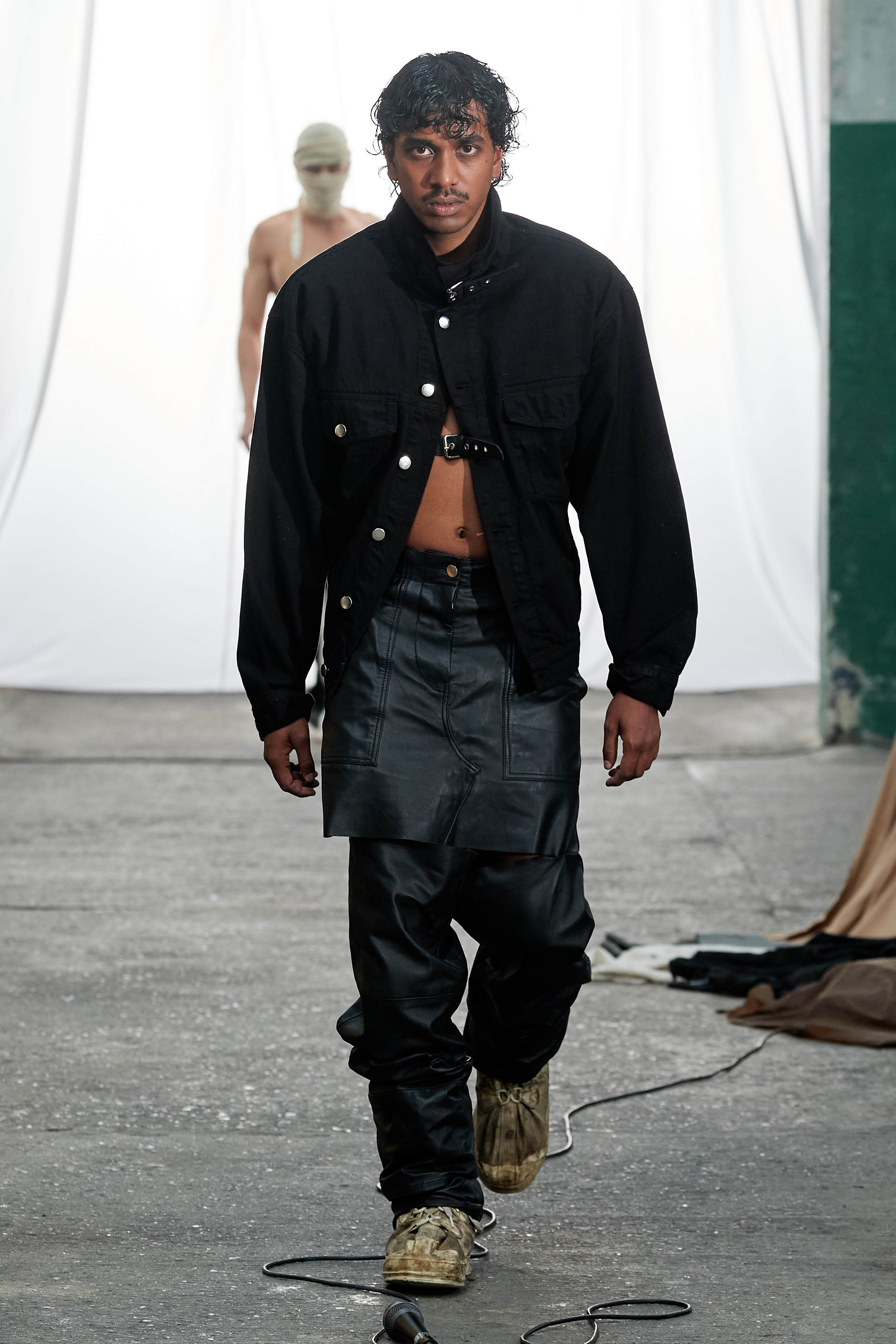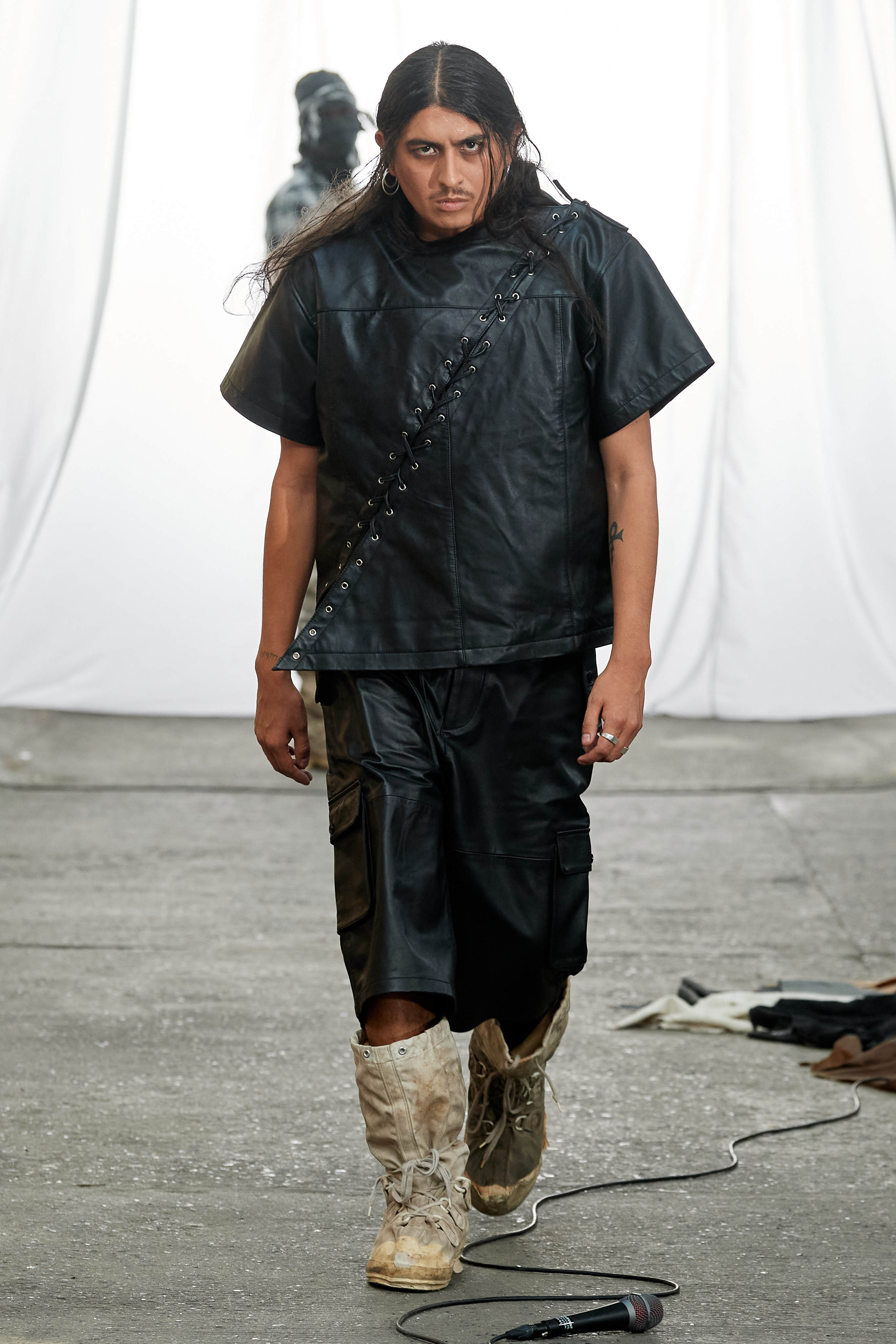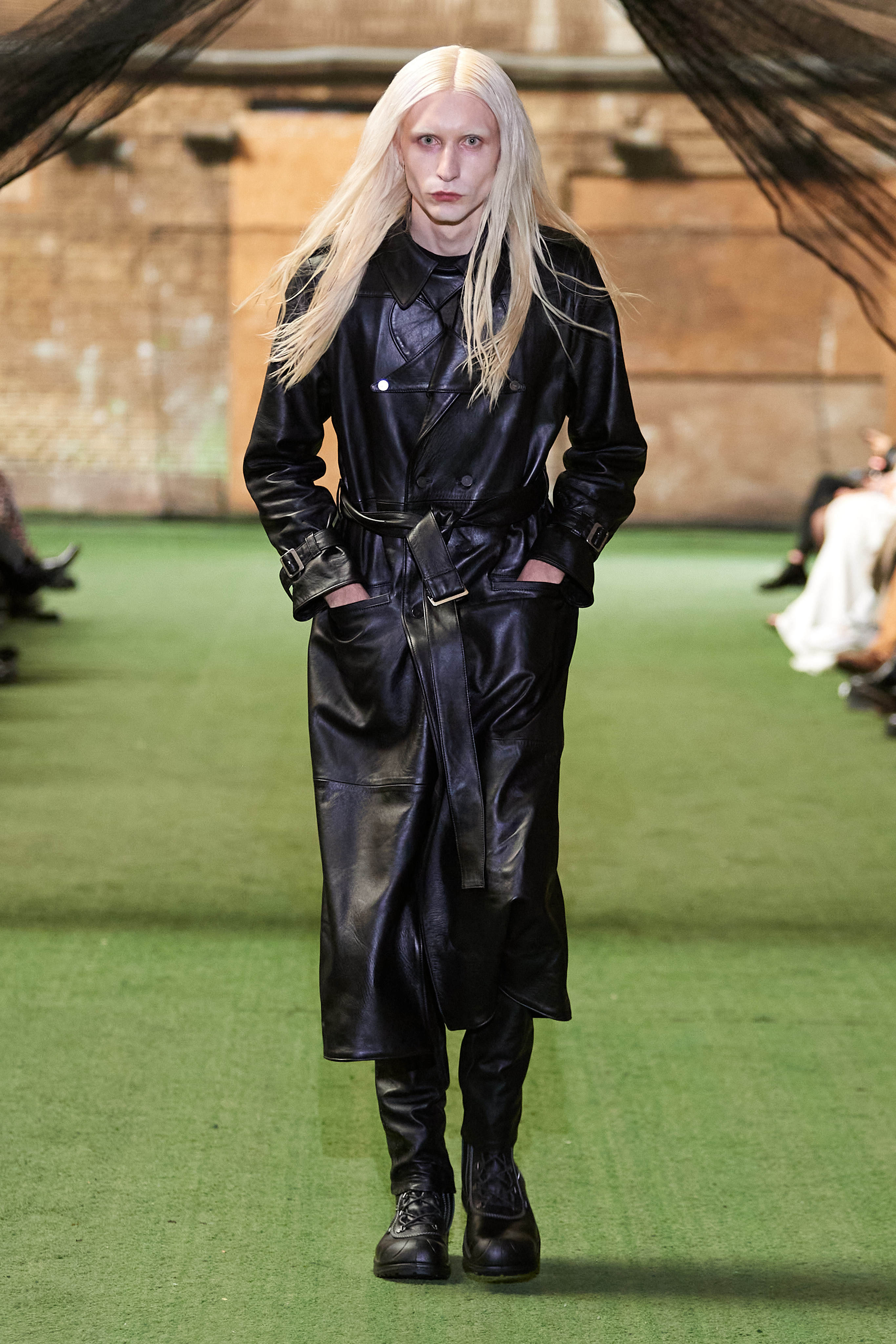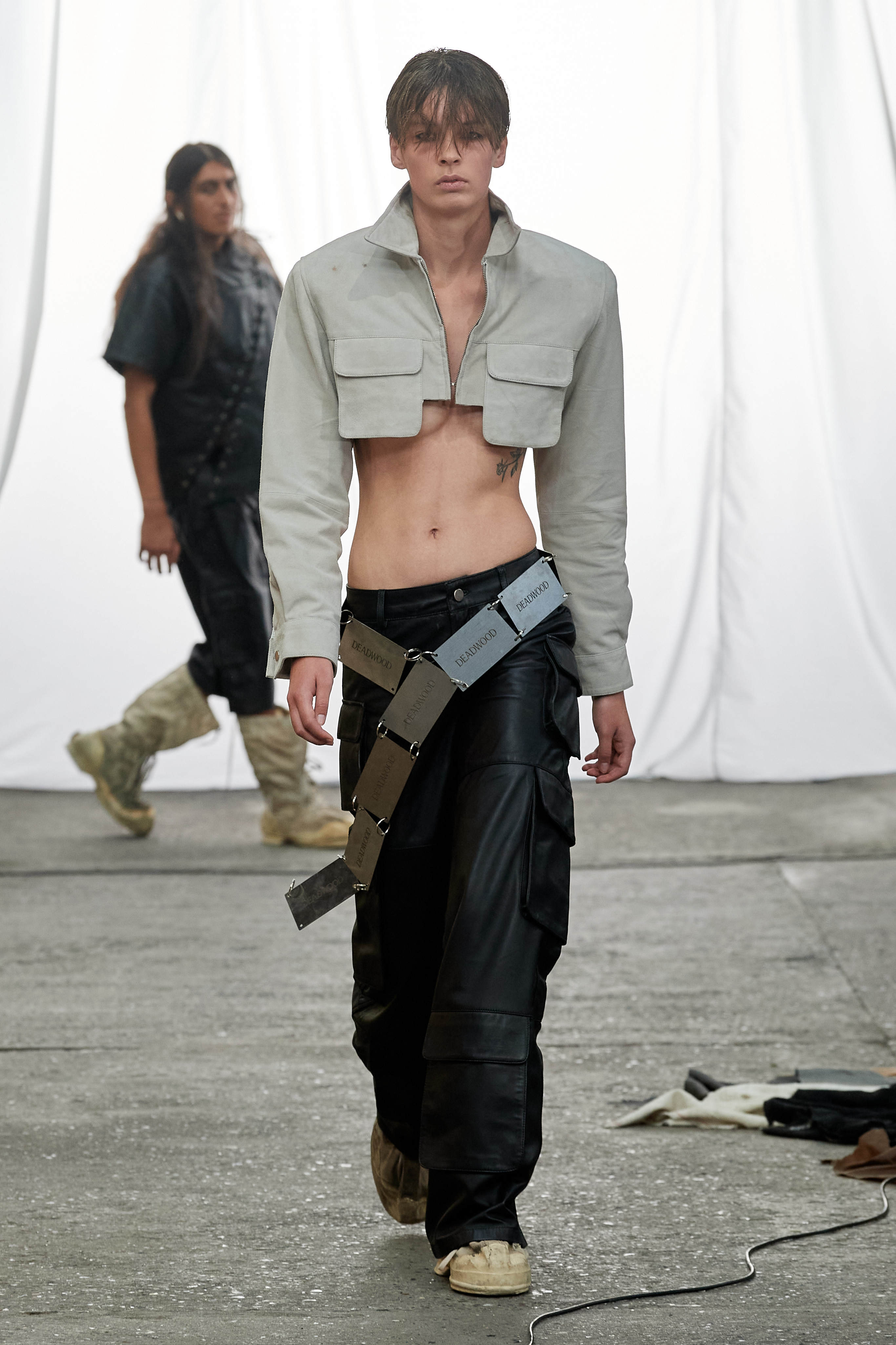 Специфіка шведської марки Deadwood - рокерські образи з перероблених матеріалів, які мають вигляд як нові (засновники марки Карл Оллсон і Фелікс фон Вахдер збирають їх у вінтажних крамницях по всьому світу). За 11 років існування бренду - це було їхнє перше шоу, на якому дует показав, як майстерно вміє працювати не тільки з переробленою шкірою, а й з інноваційними веганськими матеріалами, як-от шкіра з листя кактуса.