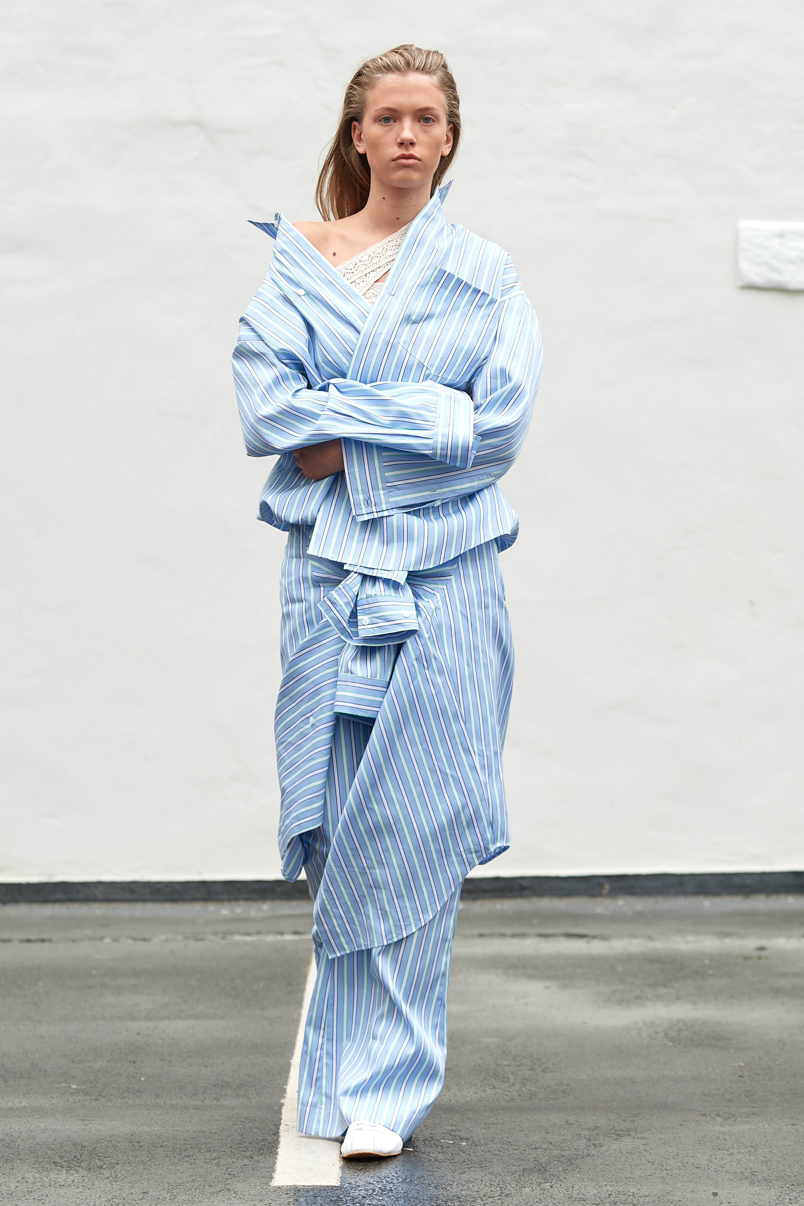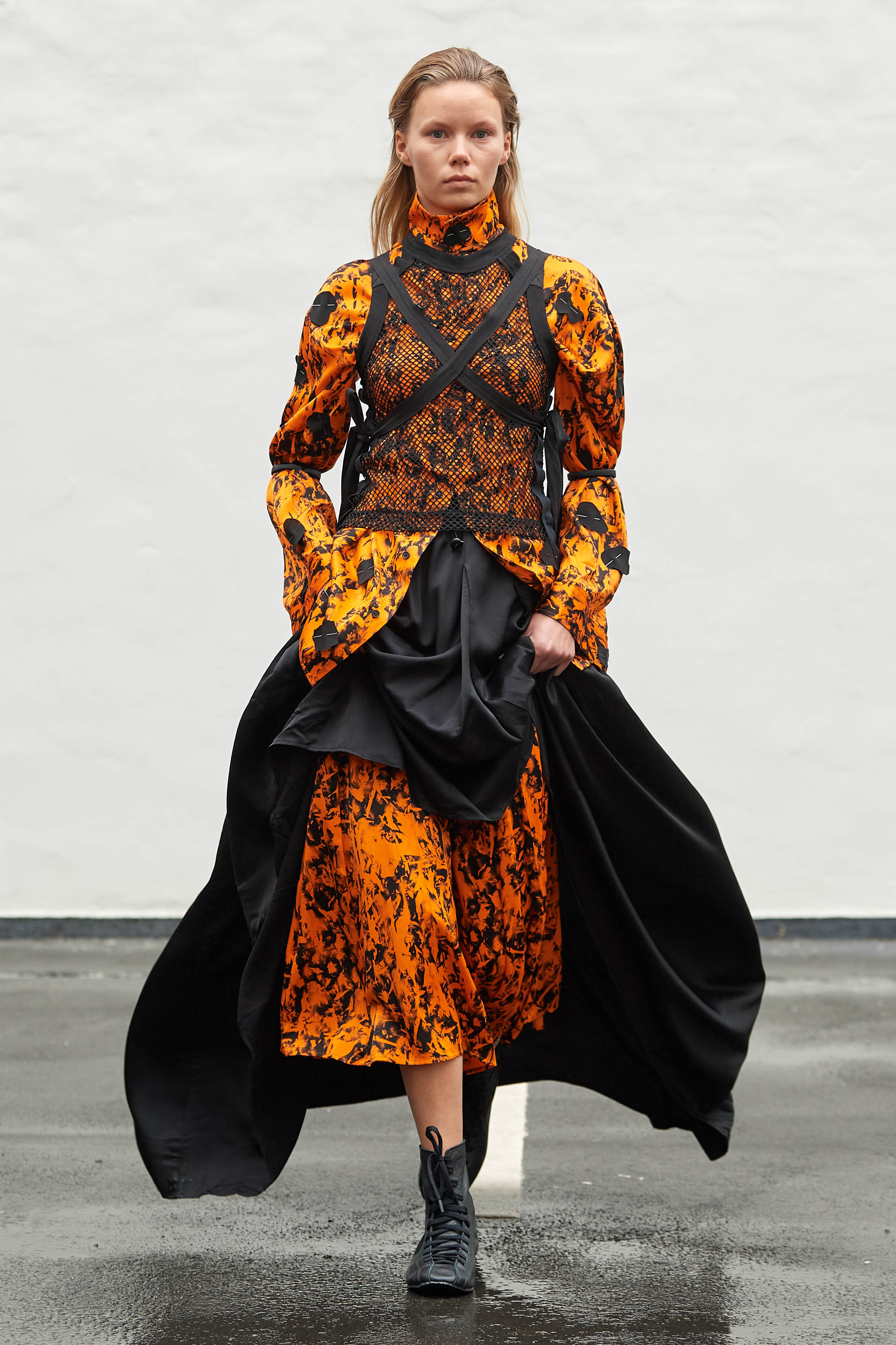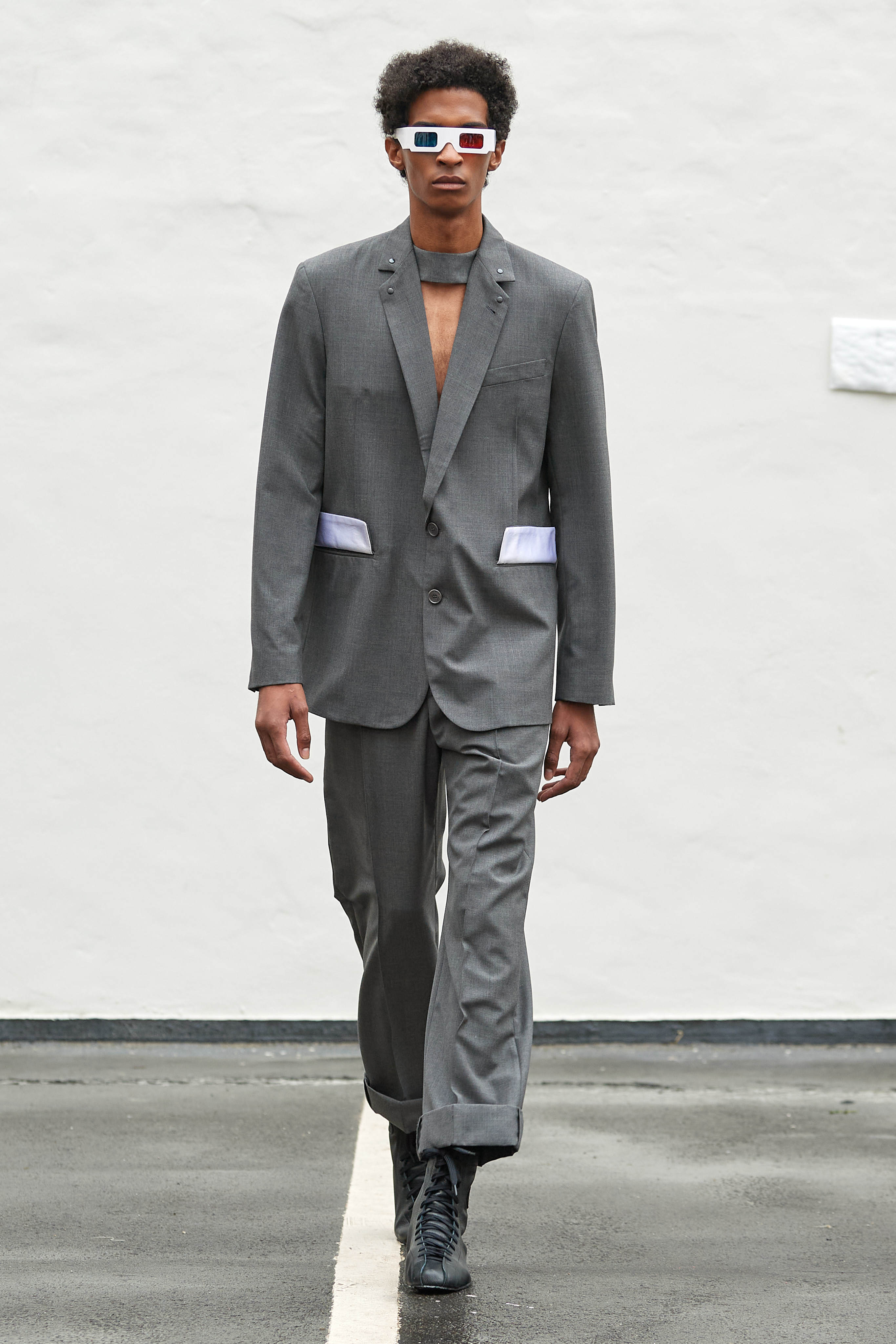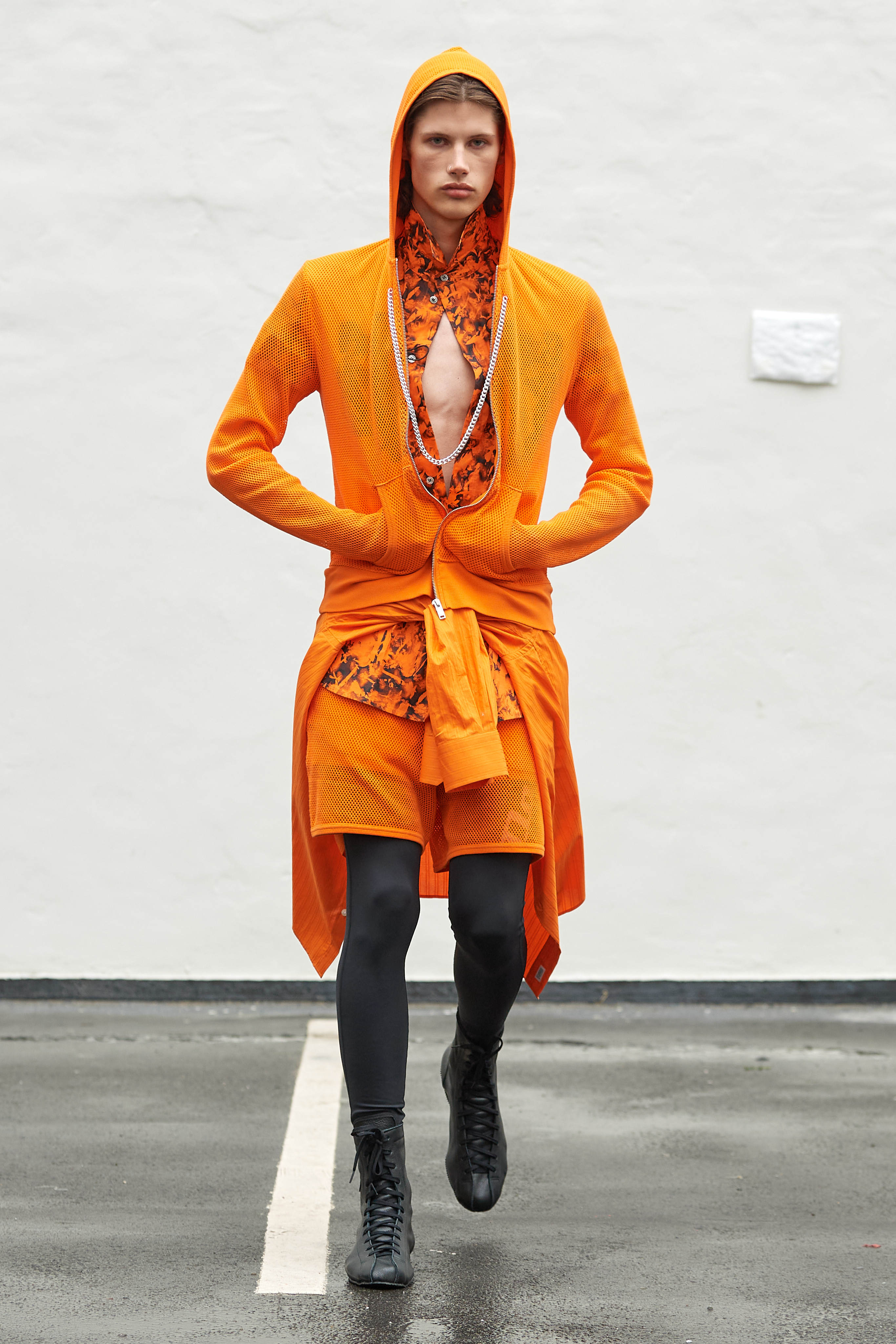 Коли Ервін Латімер відкрив свій показ-присвяту "Вовку з Волл-Стріт" у конференц-залі готелю Radisson Blu несподіваним драг-перформансом у ролі свого альтер его Анни Кондо, більшість глядачів не впізнала його (насправді це давнє хобі дизайнера, в Гельсінкі у нього є свій клуб драг). Але коли він вибіг на уклін у тому ж образі - таємниця була розкрита, а гості заусміхнулися великими посмішками. У його замальовках на тему офісного співробітника шукайте - деконструйовані чоловічі сорочки, треніки, трикотаж із червоними зиґзаґами-біржовими індексами і фантазійні чоботи-ботфорти, оздоблені костюмною тканиною.