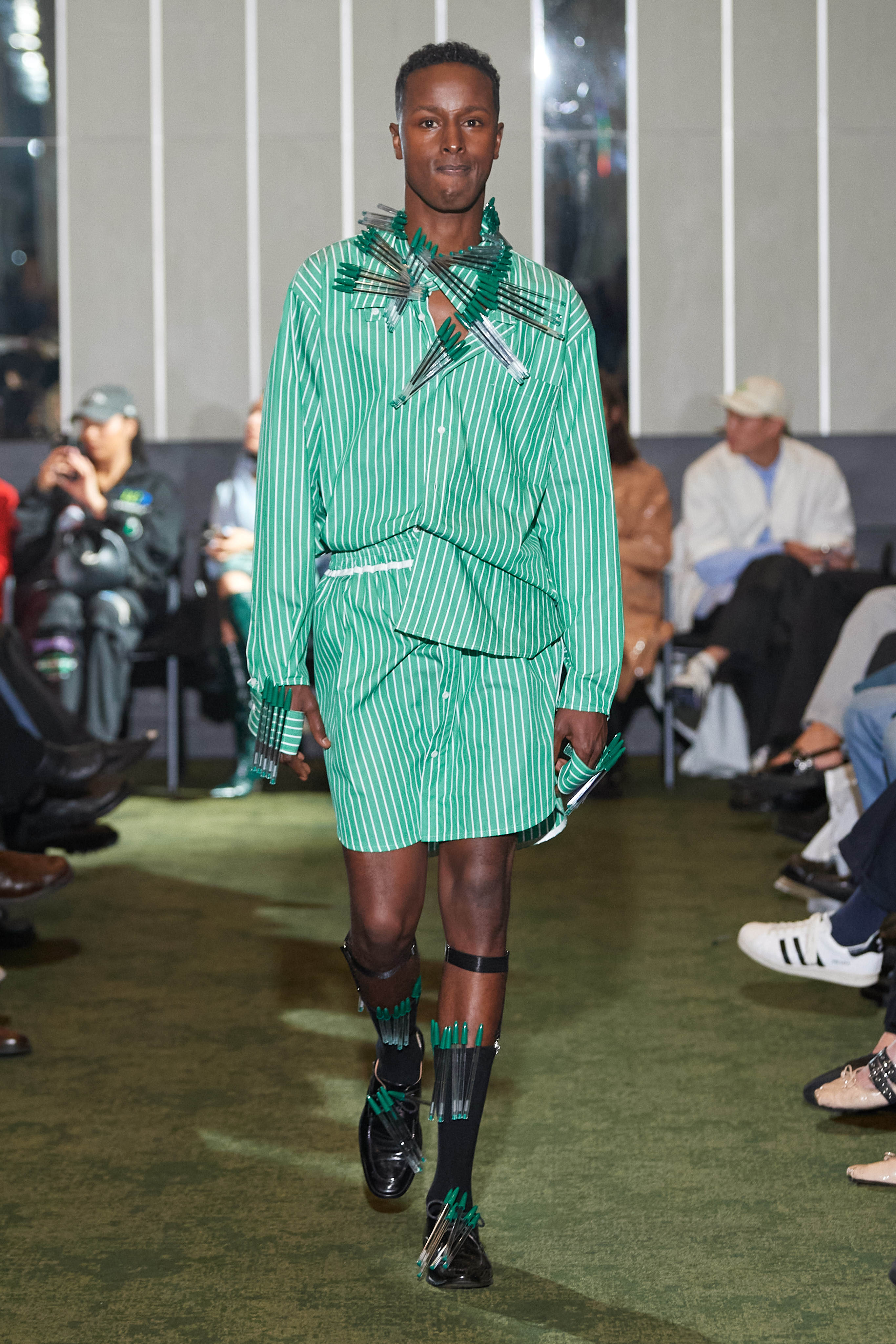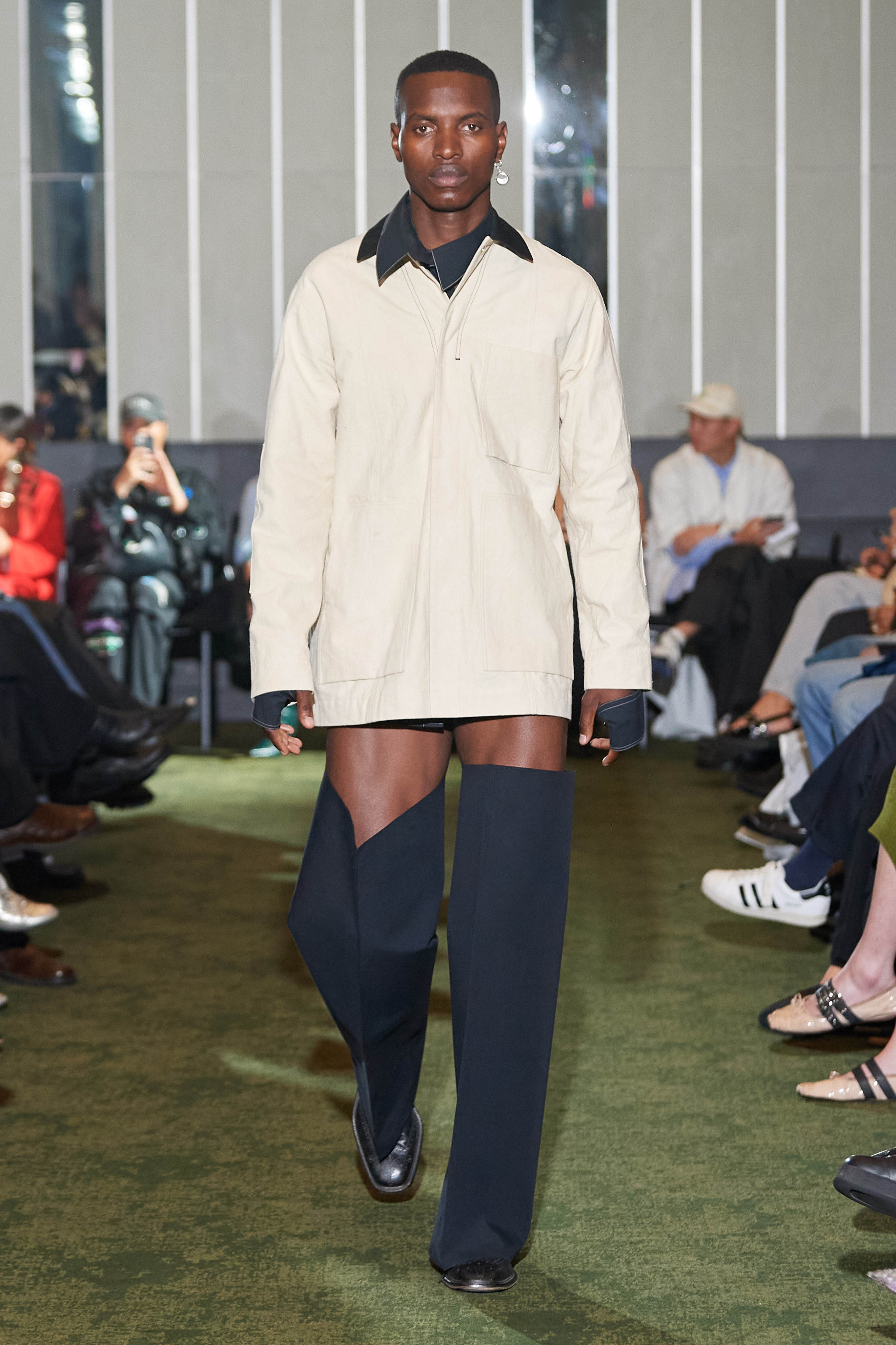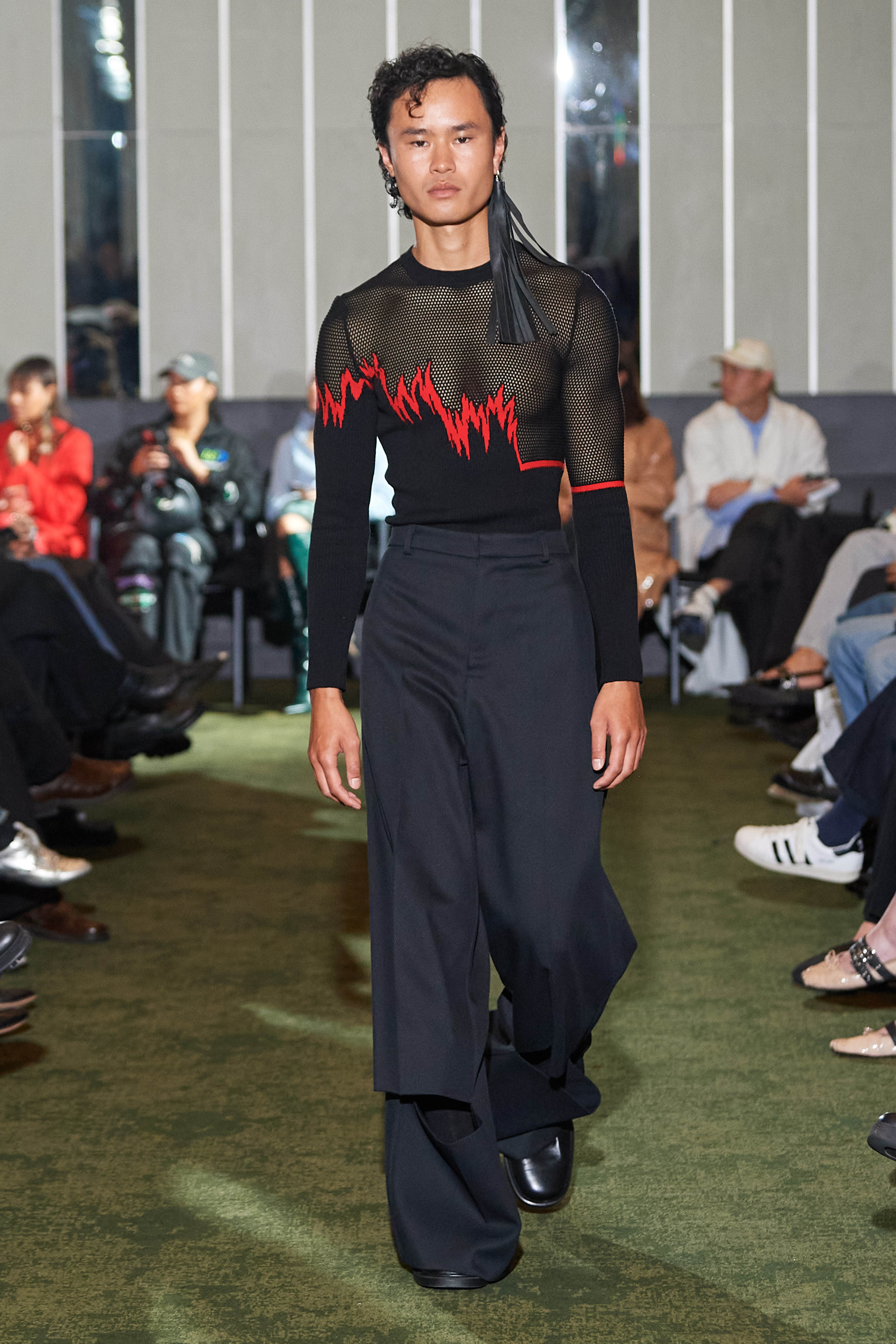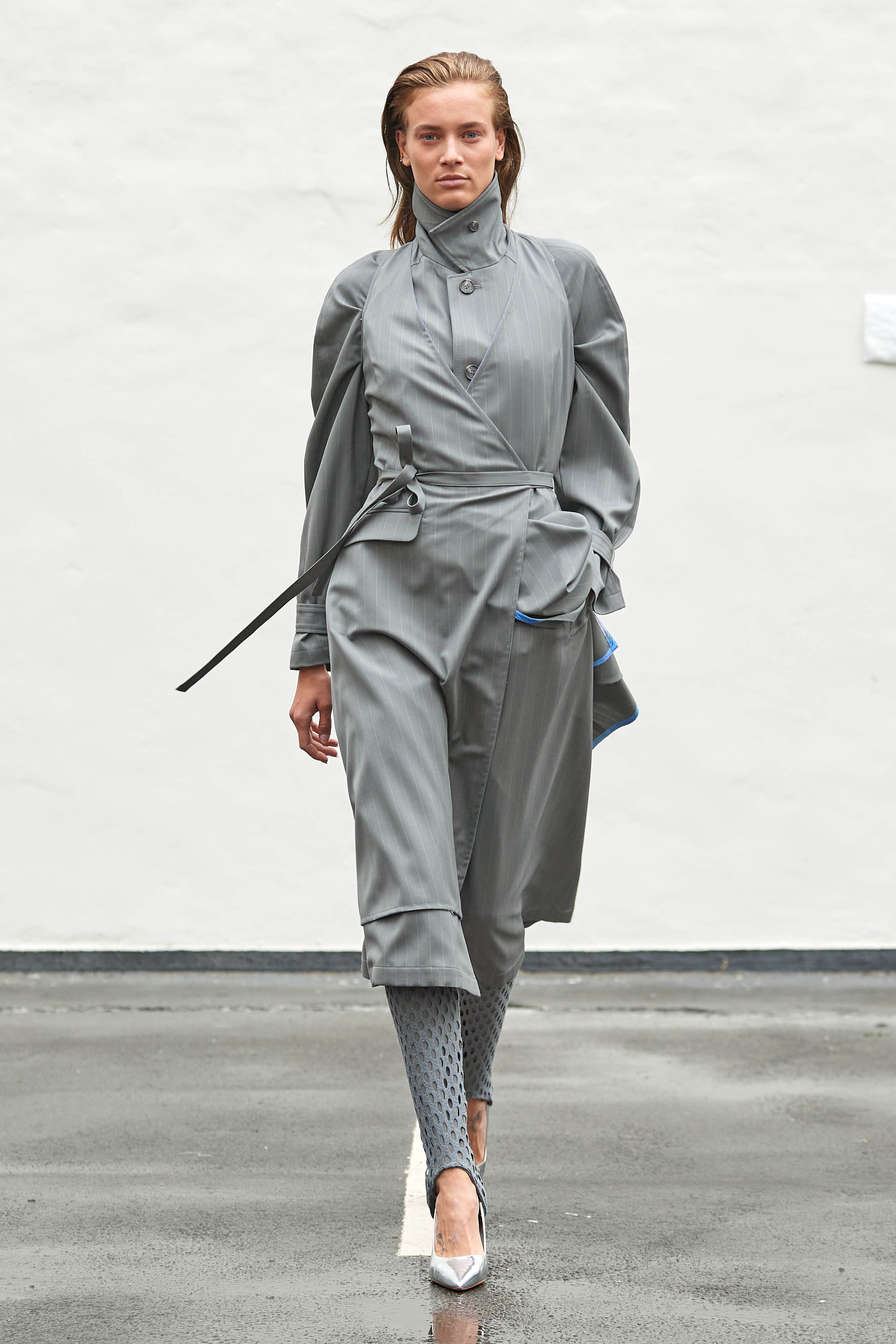 Коли Ервін Латімер відкрив свій показ-присвяту "Вовку з Волл-Стріт" у конференц-залі готелю Radisson Blu несподіваним драг-перформансом у ролі свого альтер его Анни Кондо, більшість глядачів не впізнала його (насправді це давнє хобі дизайнера, в Гельсінкі у нього є свій клуб драг). Але коли він вибіг на уклін у тому ж образі - таємниця була розкрита, а гості заусміхнулися великими посмішками. У його замальовках на тему офісного співробітника шукайте - деконструйовані чоловічі сорочки, треніки, трикотаж із червоними зиґзаґами-біржовими індексами і фантазійні чоботи-ботфорти, оздоблені костюмною тканиною.