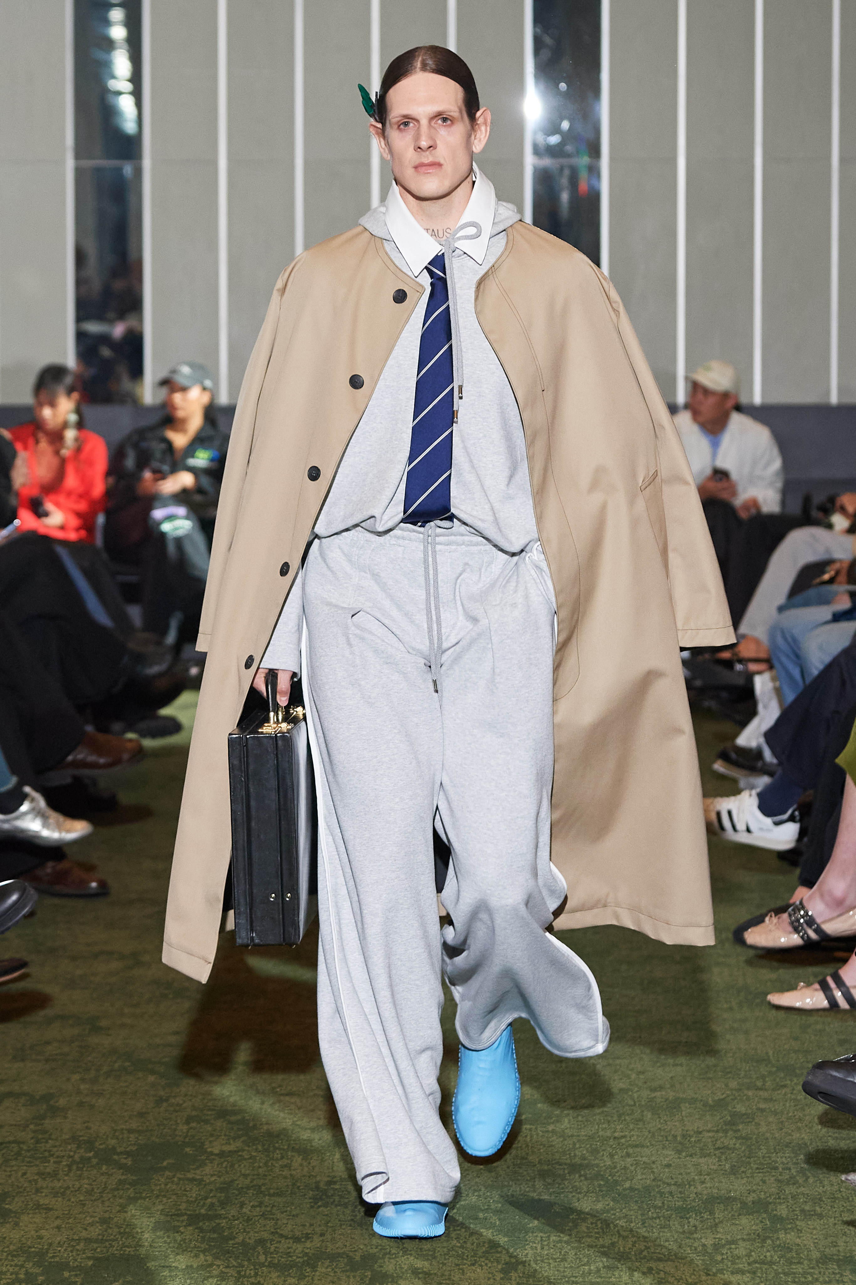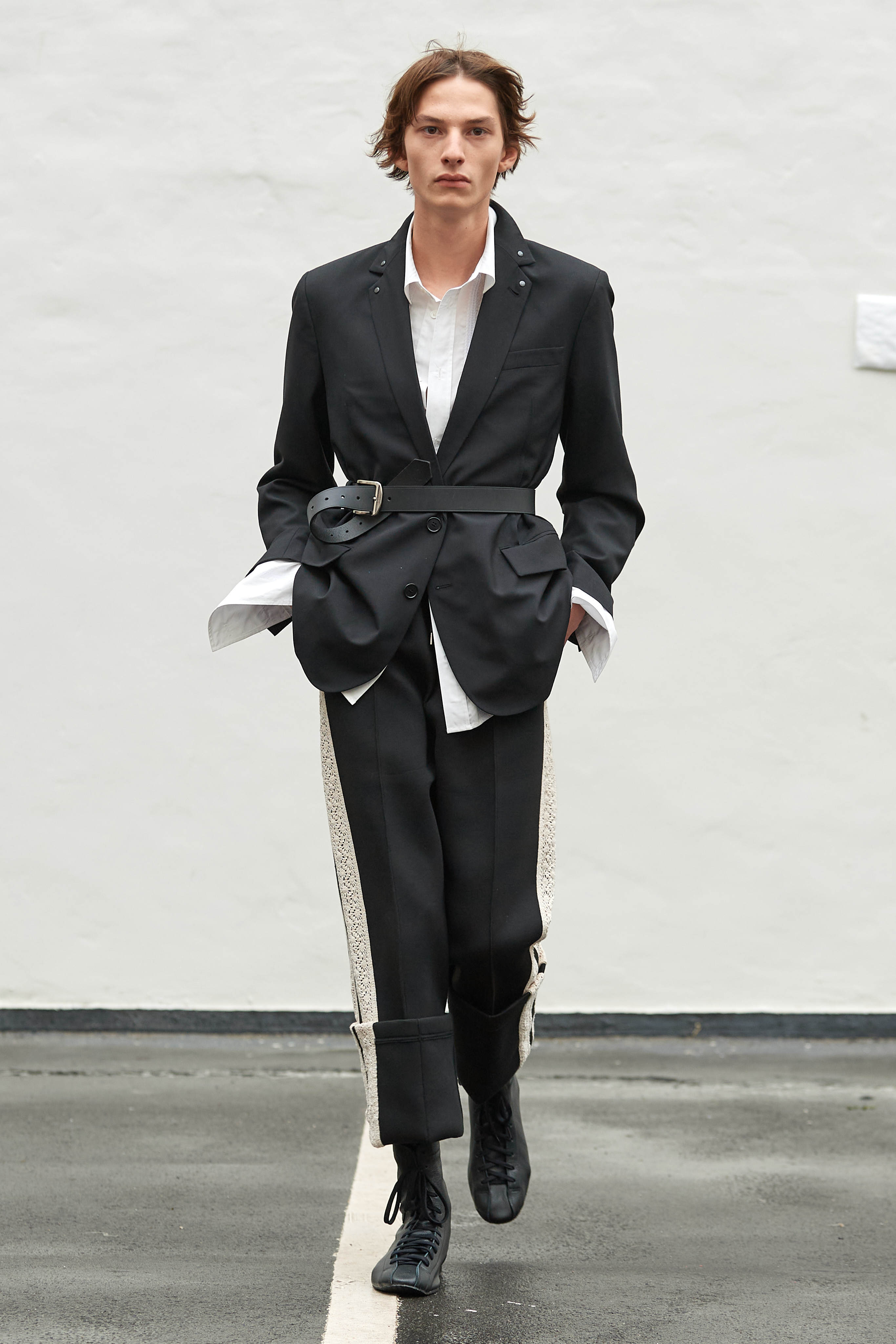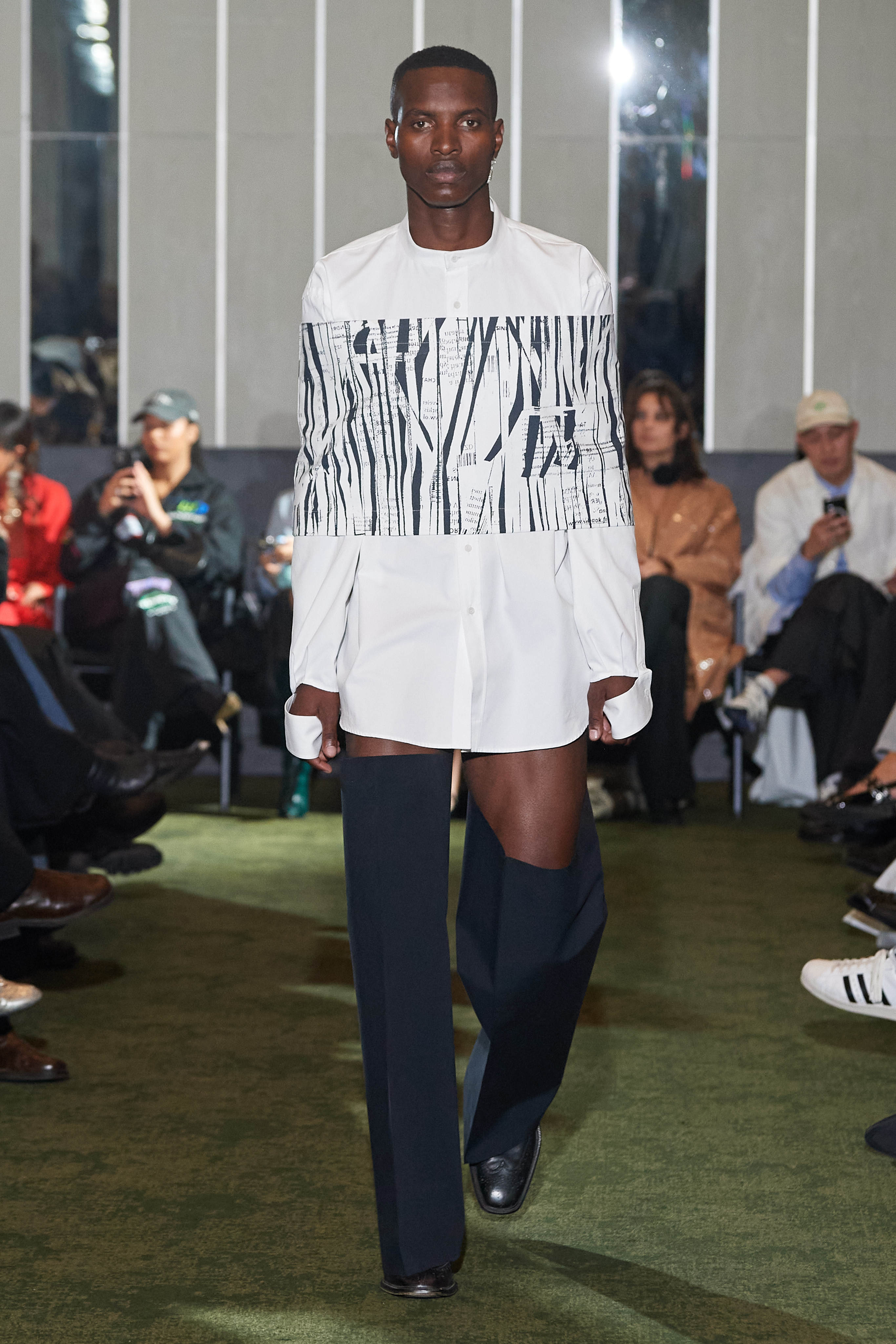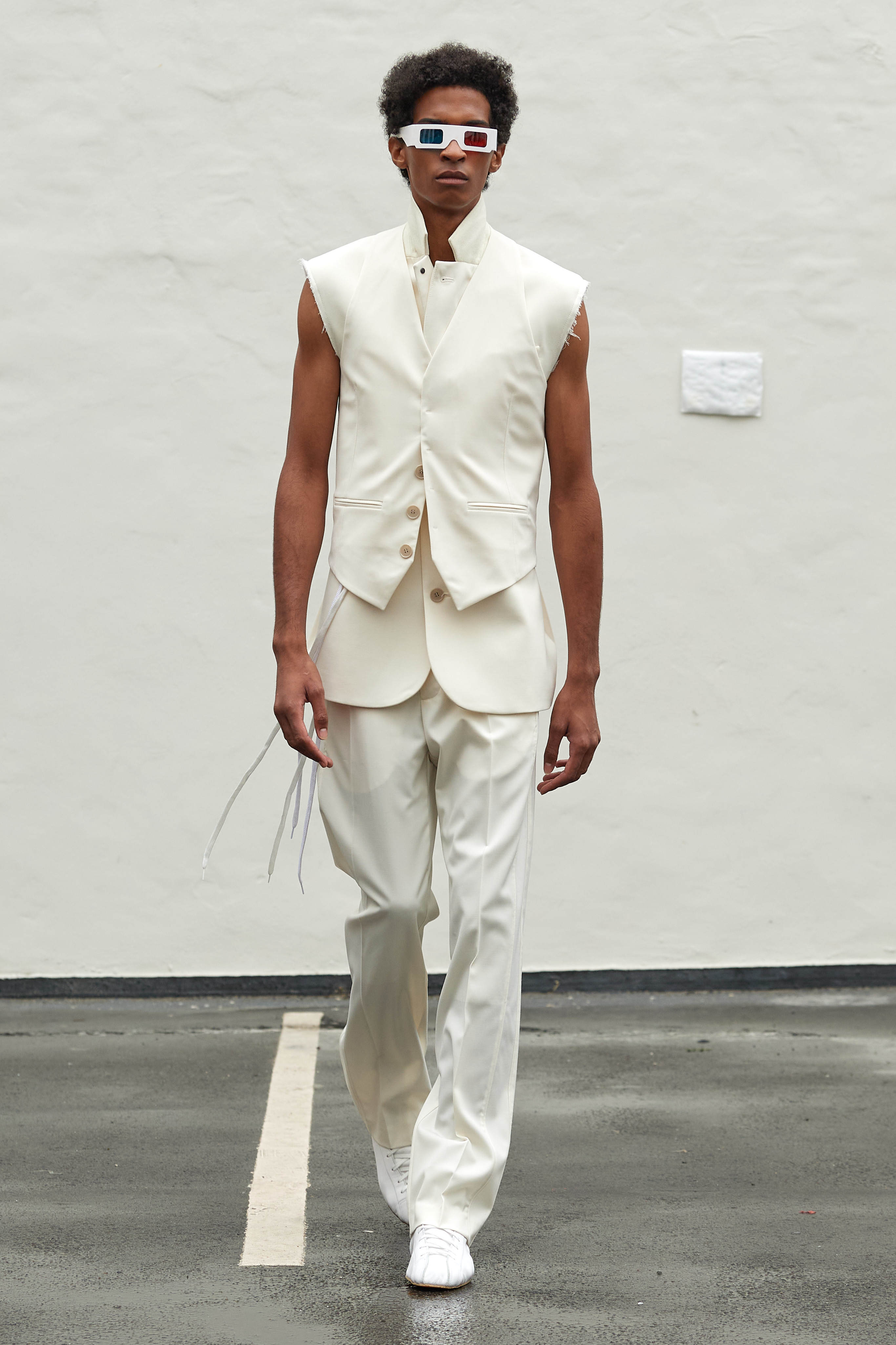 Коли Ервін Латімер відкрив свій показ-присвяту "Вовку з Волл-Стріт" у конференц-залі готелю Radisson Blu несподіваним драг-перформансом у ролі свого альтер его Анни Кондо, більшість глядачів не впізнала його (насправді це давнє хобі дизайнера, в Гельсінкі у нього є свій клуб драг). Але коли він вибіг на уклін у тому ж образі - таємниця була розкрита, а гості заусміхнулися великими посмішками. У його замальовках на тему офісного співробітника шукайте - деконструйовані чоловічі сорочки, треніки, трикотаж із червоними зиґзаґами-біржовими індексами і фантазійні чоботи-ботфорти, оздоблені костюмною тканиною.