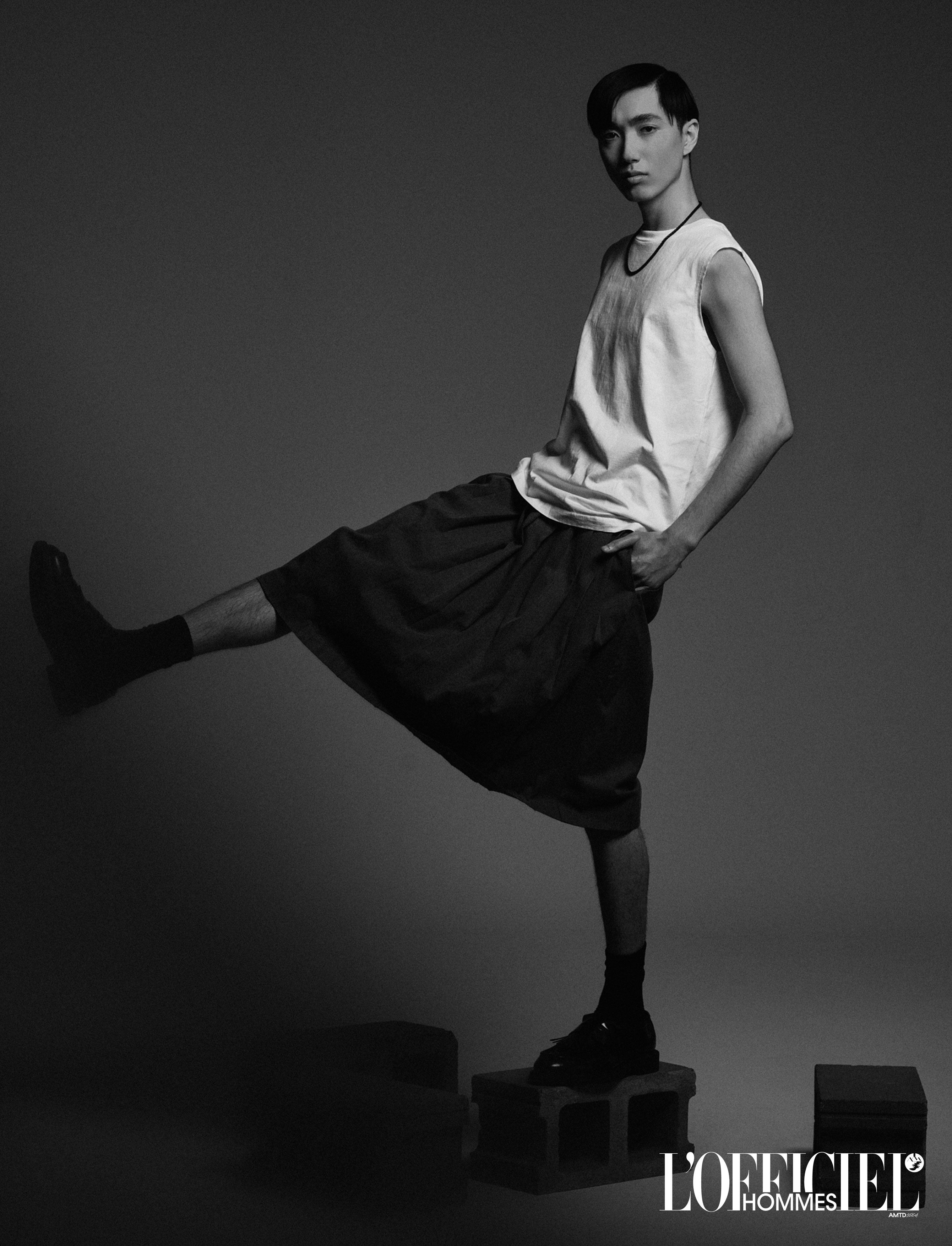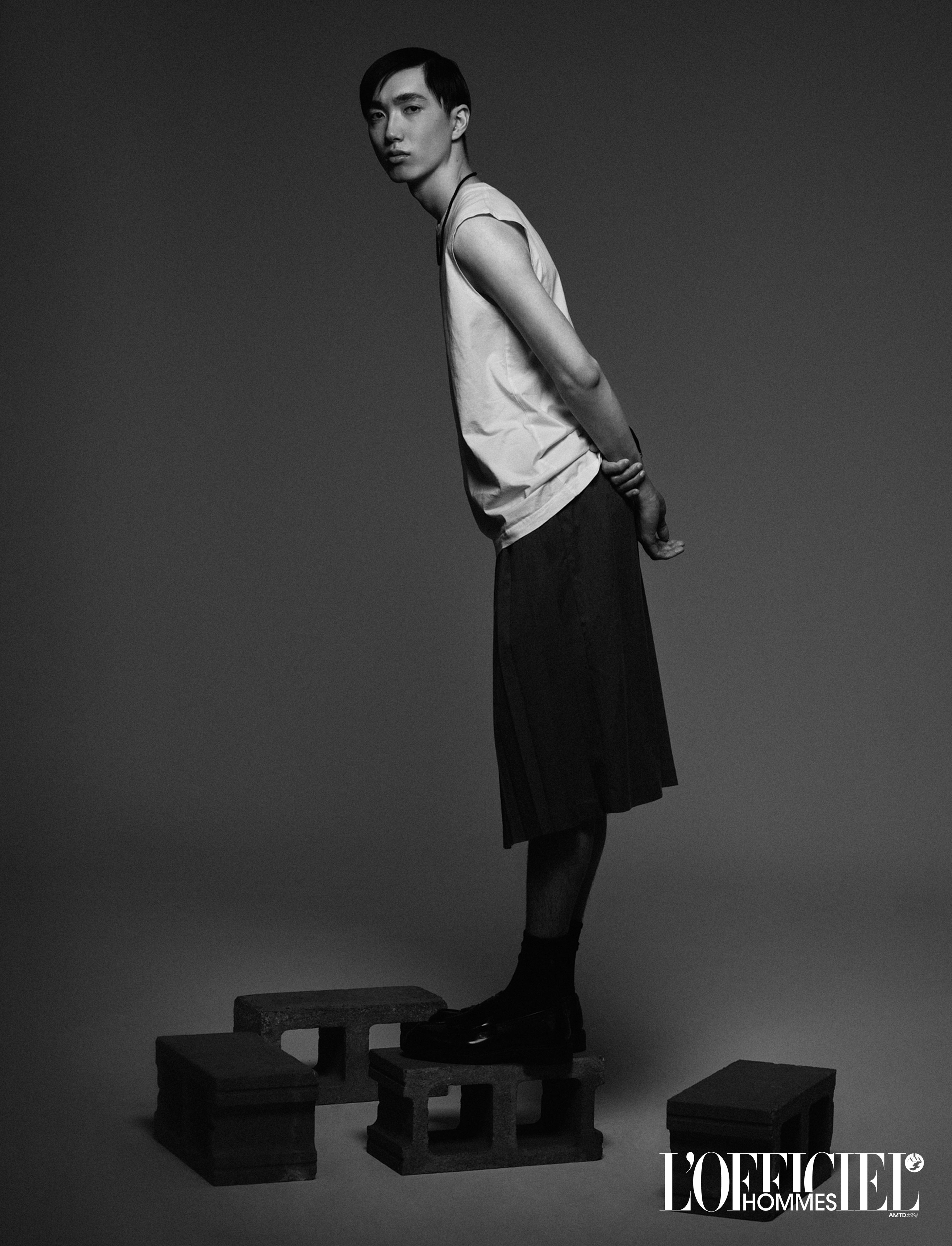 Топ Acne Studios; спідниця Junya Watanabe; шкарпетки Rick Owens; взуття Prada; прикраса Vitaly