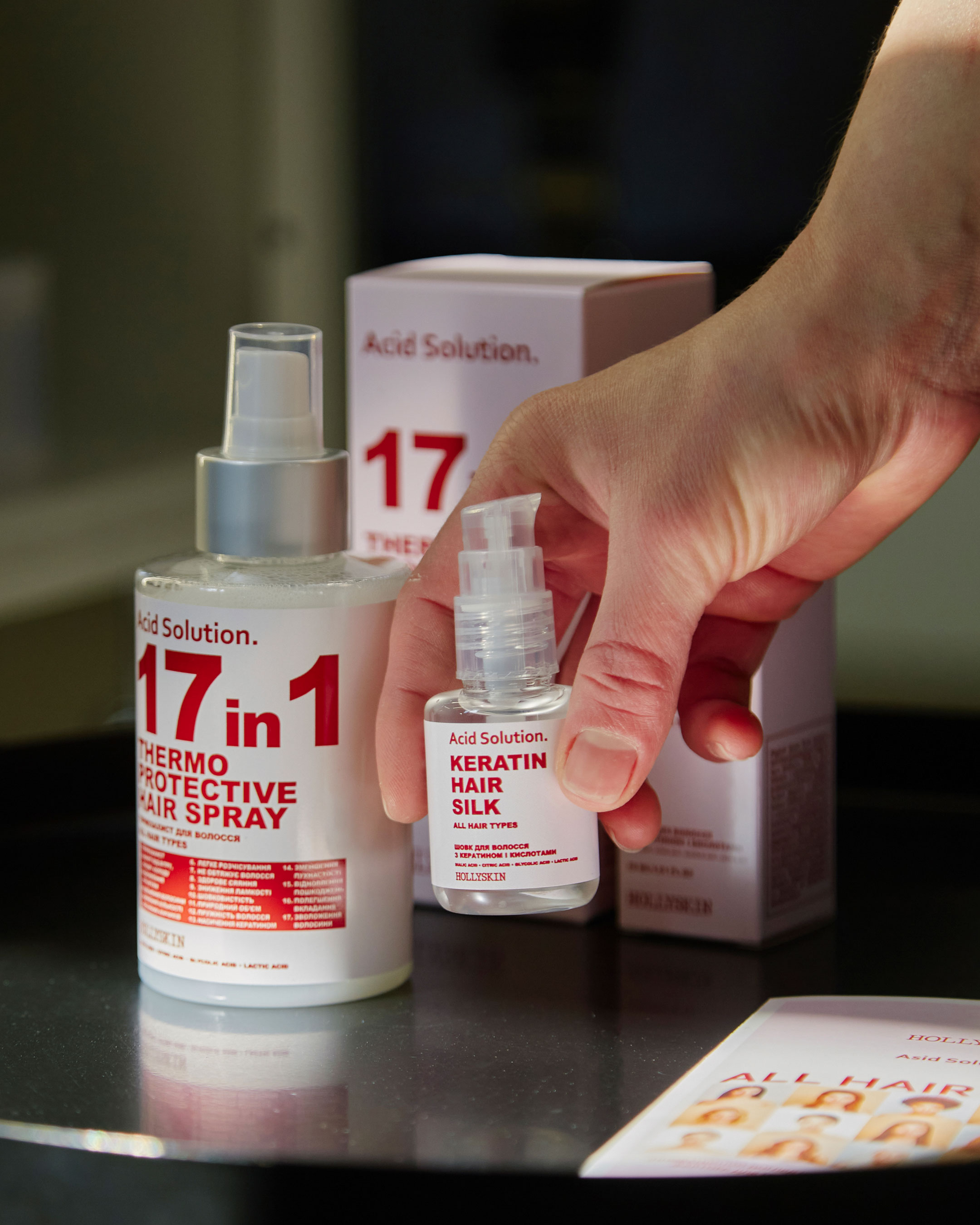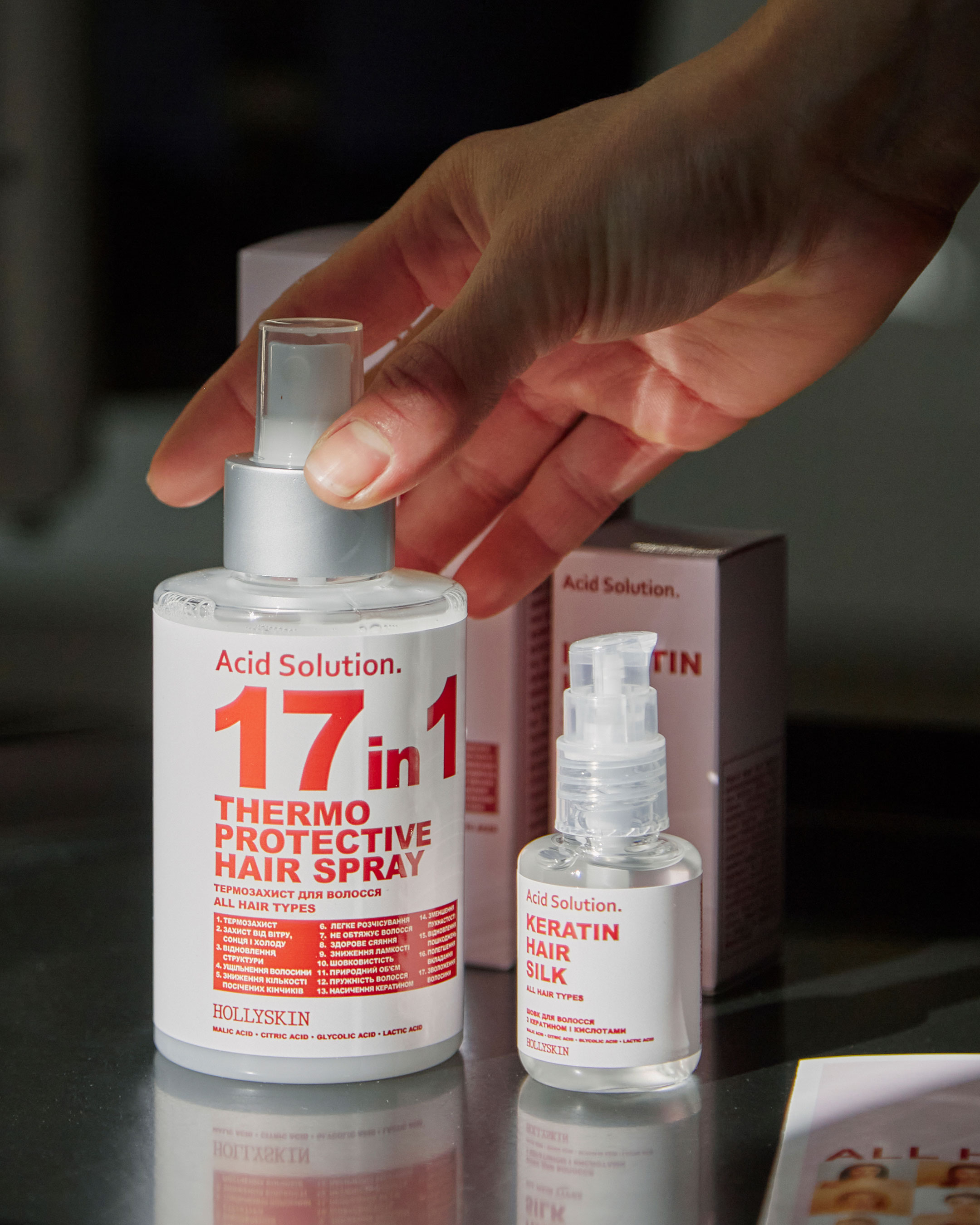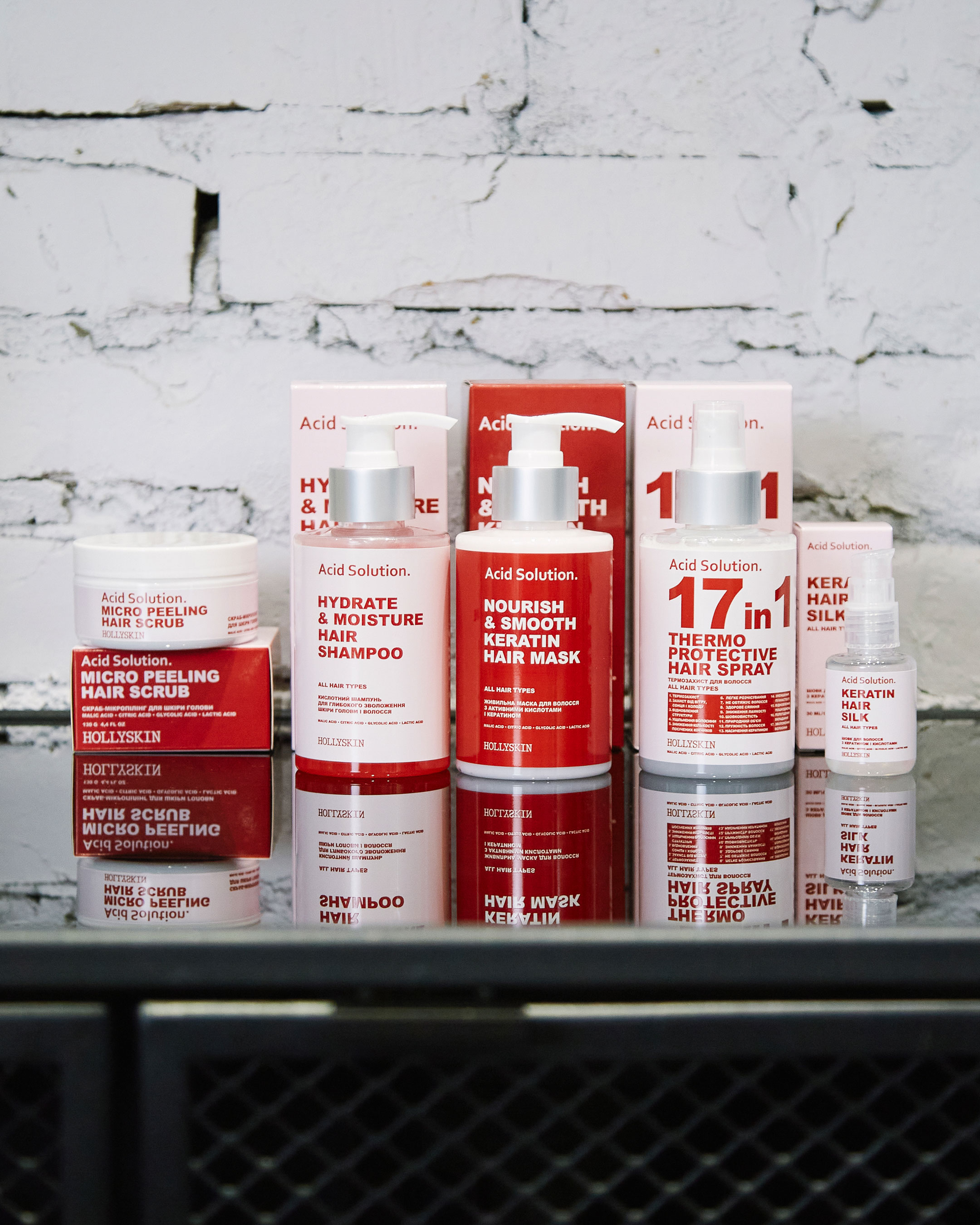 В основі лінійки Acid Solution. інноваційний зволожувальний фактор, який складається з сечовини, амінокислот і AHA-кислот. Кожен із компонентів працює і посилює дію одне одного. AHA-кислоти ретельно і м'яко очищують від всіх видів забруднень, у тому числі стайлінгових засобів, сприяють регенерації тканин. Сечовина – природний і надзвичайно ефективний зволожувач. Висока гігроскопічність компонента запобігає випаровуванню вологи протягом дня. Амінокислоти – це будівельний матеріал волосся і шкіри, вони проникають всередину волосини, роблять її міцною й еластичною, зменшують ризик травмування під час розчісування. В кожному засобі HOLLYSKIN – більше трьох активних компонентів, щоб результат був вражаючим і помітним уже після першого використання комплексу.