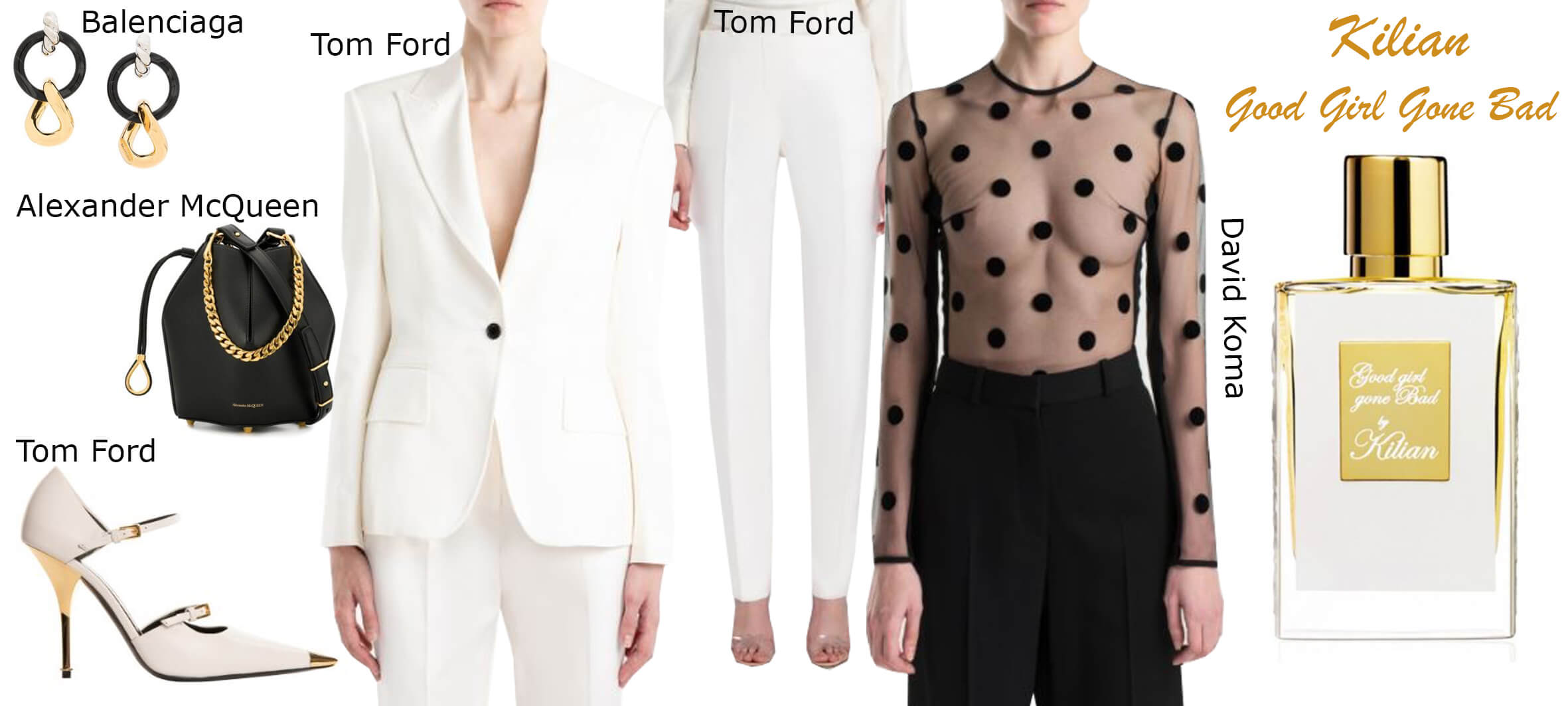 Оптимальным решением в таком случае станет сливочно-белый брючный костюм поверх интригующего полупрозрачного боди с декором polka-dot, остроносые светлые лодочки с контрастным золотым каблуком и лаконичные серьги, задающие тон богемного шика всему образу. Кожаная сумка-корзинка позволит чувствовать себя свободно и непринужденно, а ноты жасмина, туберозы и нарцисса в аромате Good Girl Gone Bad привнесут в образ экстравагантность и интеллектуальную сексуальность.