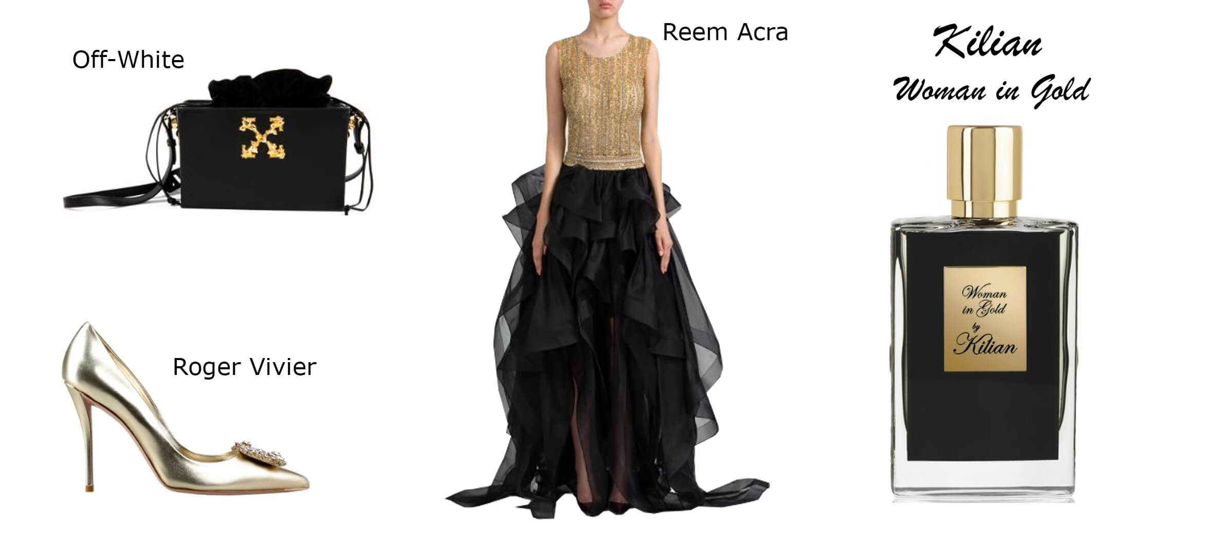 Одно из самых роскошных сочетаний золота и черного станет идеальным решением для вечера с дресс-кодом Black Tie. В таких случаях не стоит бояться чрезмерности в фактурах — минодьер с золотым крестом, сияющие лодочки с ажурными пряжками и мерцающие кристаллы на платье сбалансированы тёмным, сотканным будто из вечерних теней, подолом платья. Околдовывающий эффект усилит аромат Woman in Gold, в котором ноты розы, бергамота, белой фрезии и пачулей раскрываются роскошным и таинственным узором.