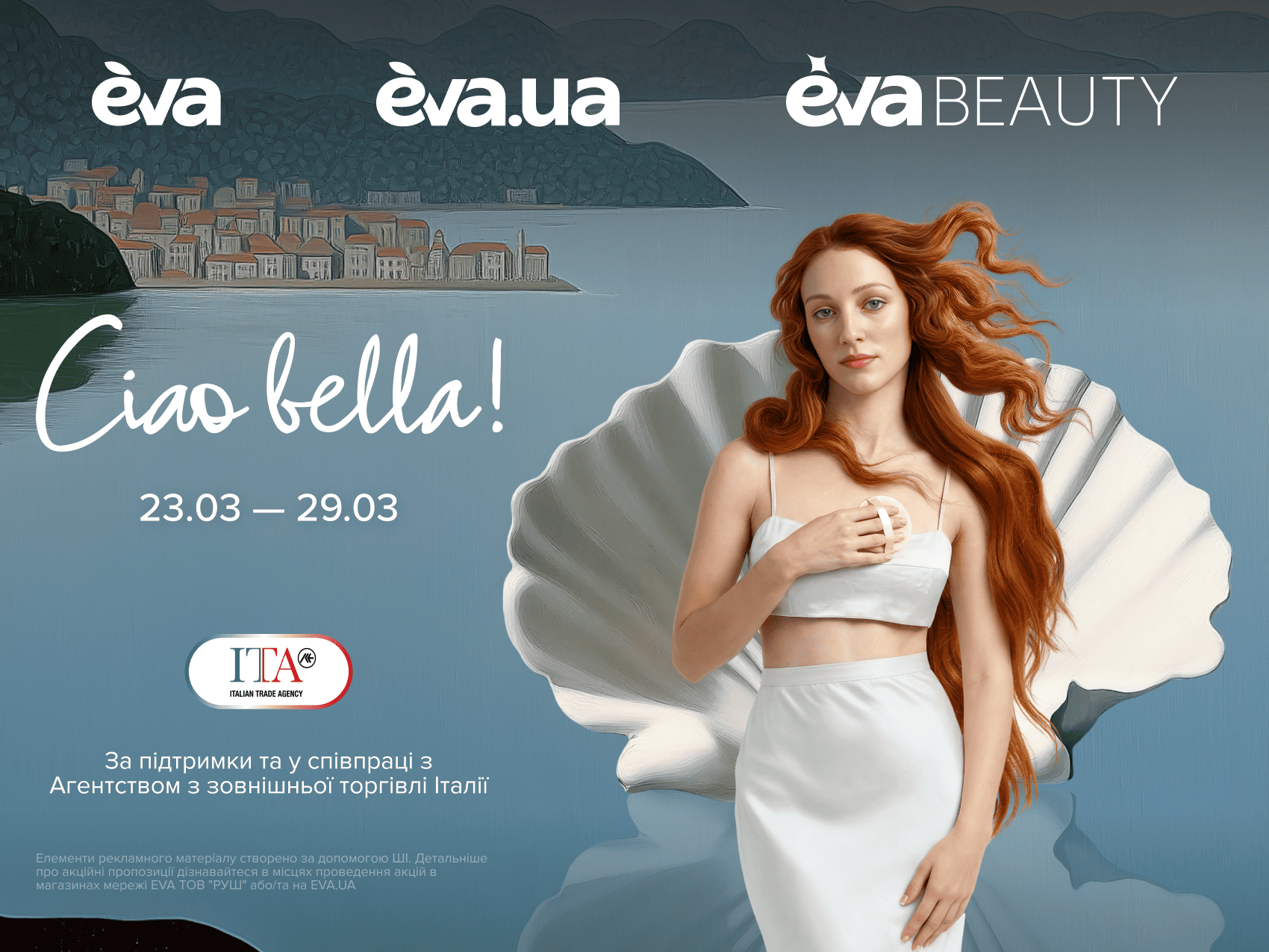 Венера — символ краси, гармонії та жіночності. Саме цей образ, увічнений у знаменитій картині Сандро Боттічеллі «Народження Венери», став натхненням для нової б’юті-кампанії Ciao Bella, яку запустила мережа EVA разом з Агентством з зовнішньої торгівлі Італії (Italian Trade Agency) в межах спільного проєкту «Італійські тижні».