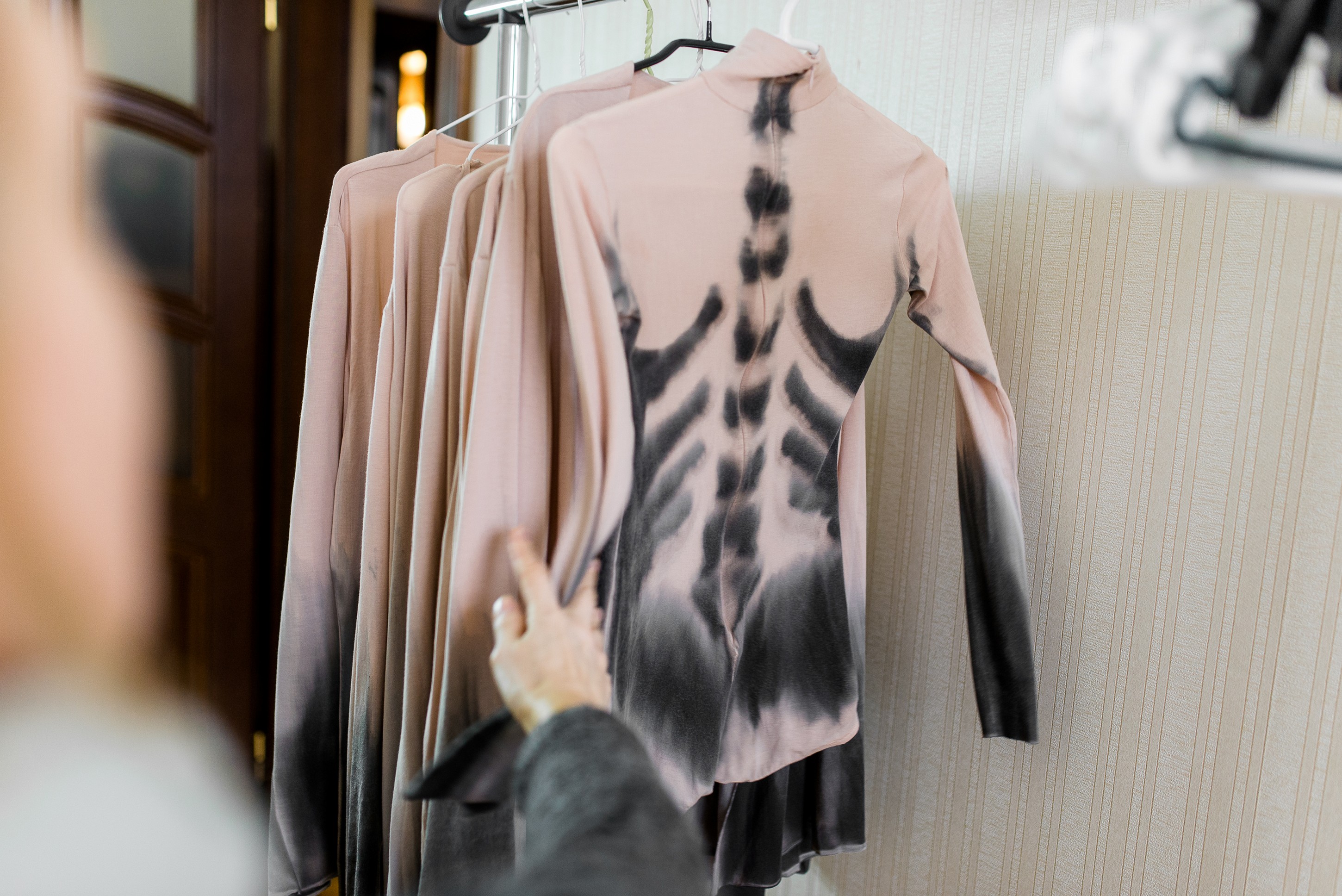 «У нас получилась такая немецко-украинская коллаборация, - говорит Кухар. - Но наша команда столкнулась со многими сложностями в процессе: мы не всегда могли найти те ткани, которые хотелось бы, чего-то в Украине вообще не нашлось, поэтому у нас постоянно был такой творческий поиск. Мы брали ткань, везли в Берлин, художница смотрела ее, трогала, потому что было сложно, скажем, передать градацию цвета, сделать эти натуральные «подтеки» на ткани, создать даже не имитацию, а по-настоящему оголенное тело, потому что на сцене это действительно выглядит, словно мы обнажены, при этом важно, что все смотрится достаточно эстетично».
