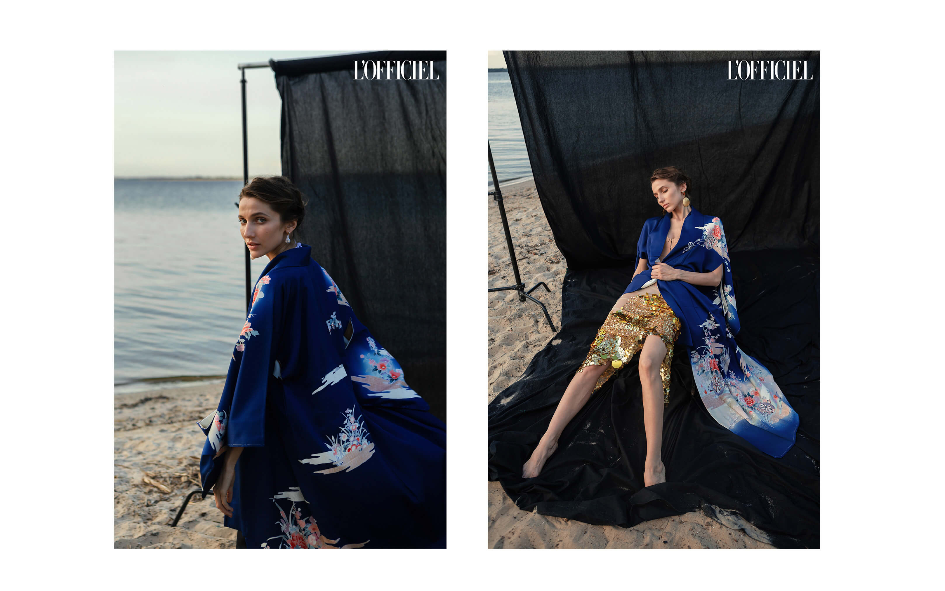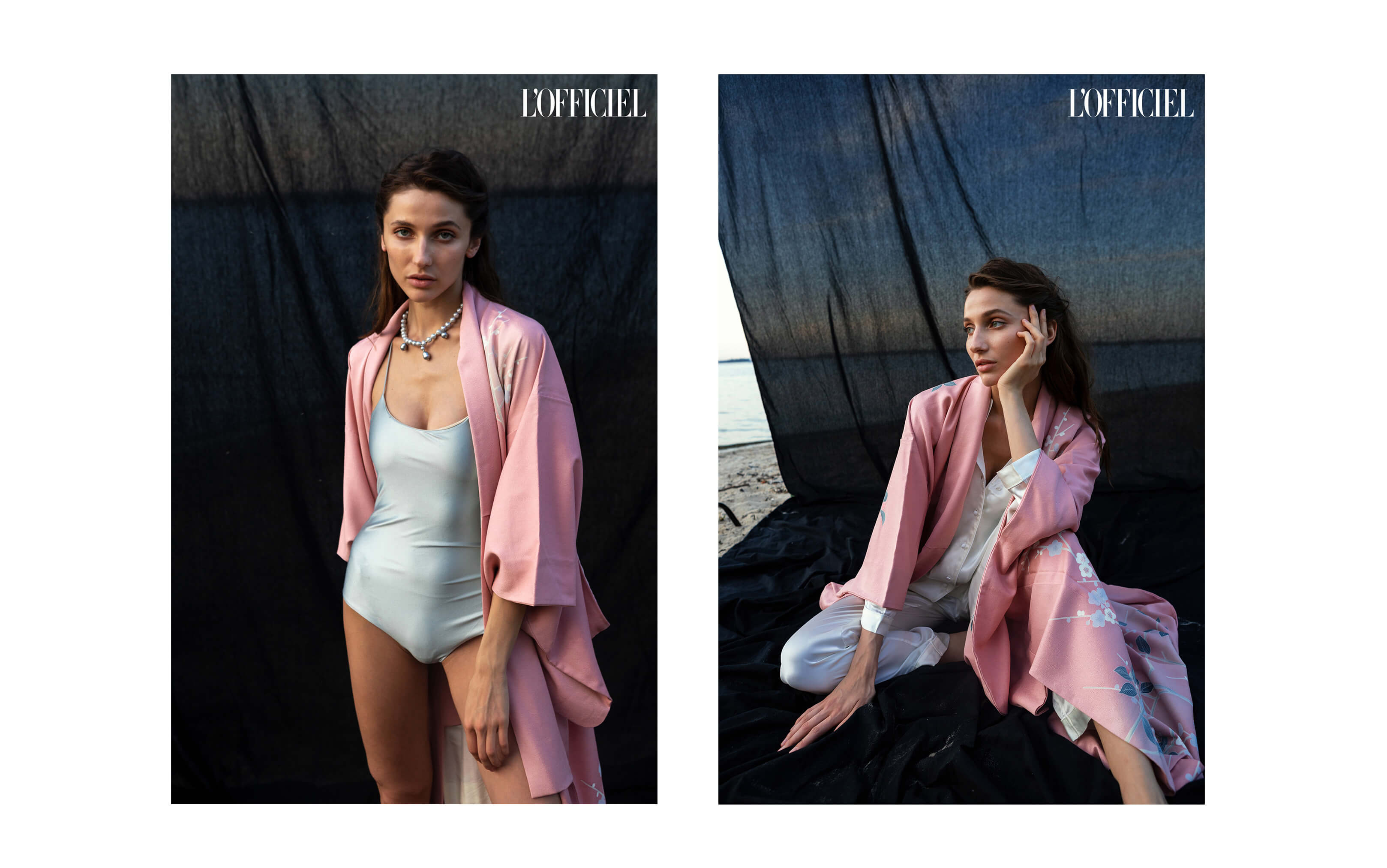 Слева: винтажное кимоно ShopKimono, купальник URSO Garment, колье Accentuate Jewelry. Справа: винтажное кимоно ShopKimono, брюки и рубашка Tezenis