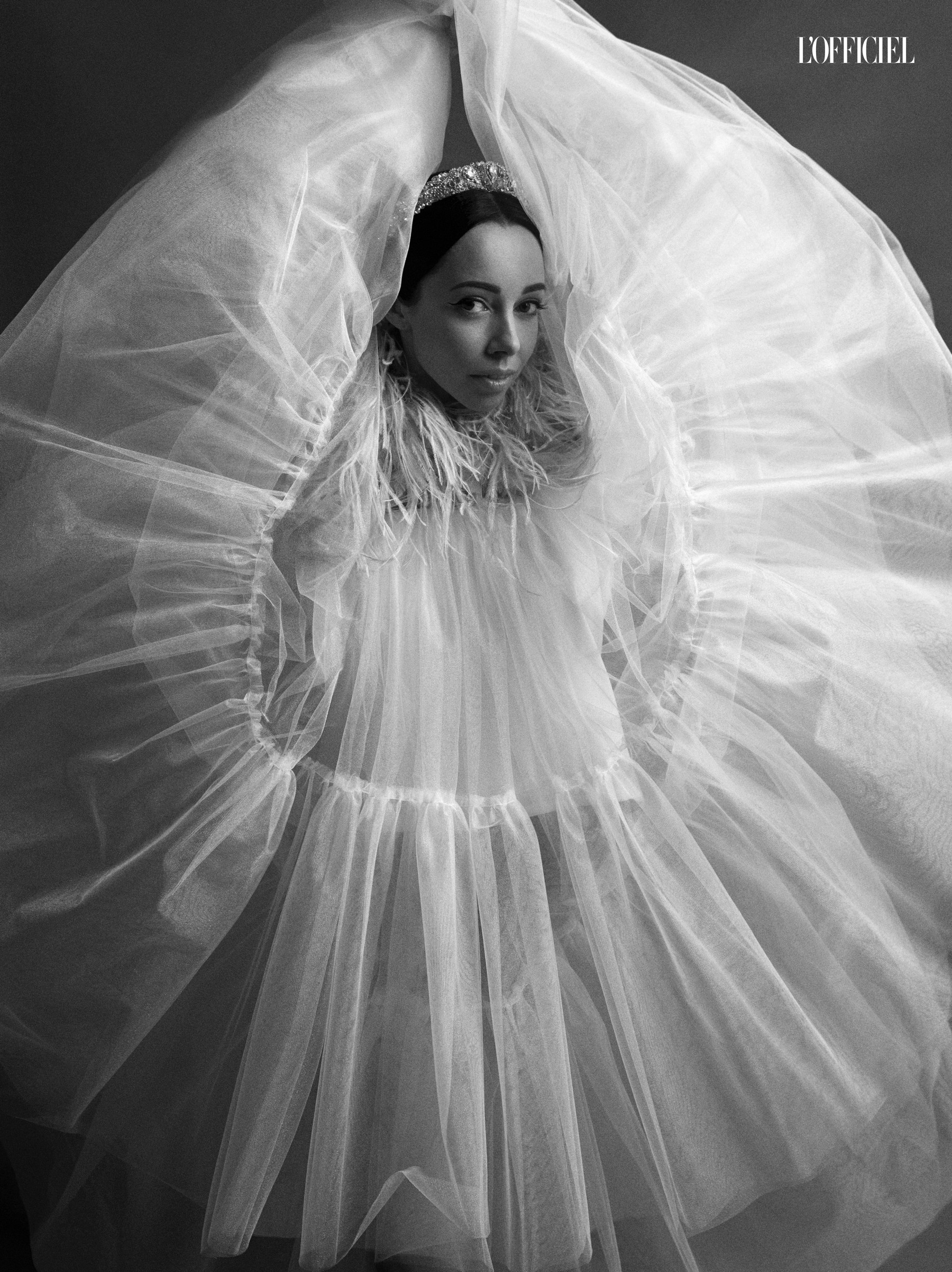 Обруч из ткани с декором из камней Helena Romanova, накидка из страусиных перьев BHLDN, юбка из фатина Katerina Kvit for Concept Bride