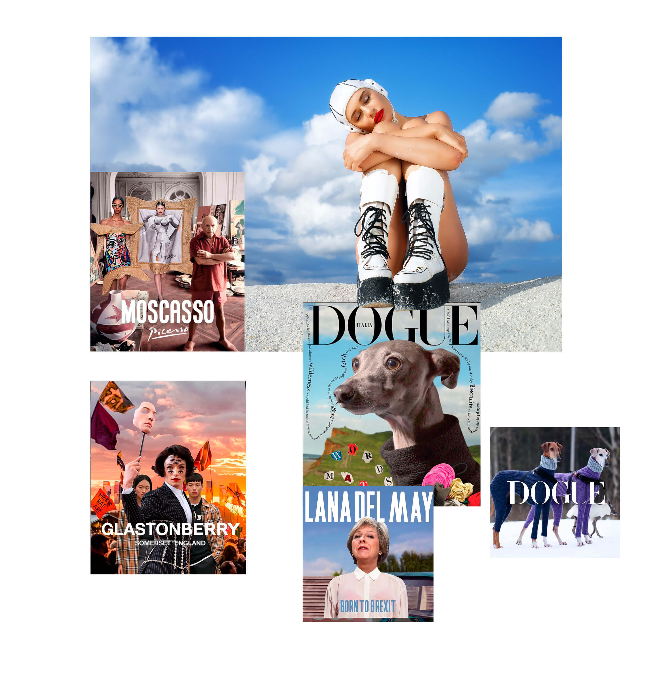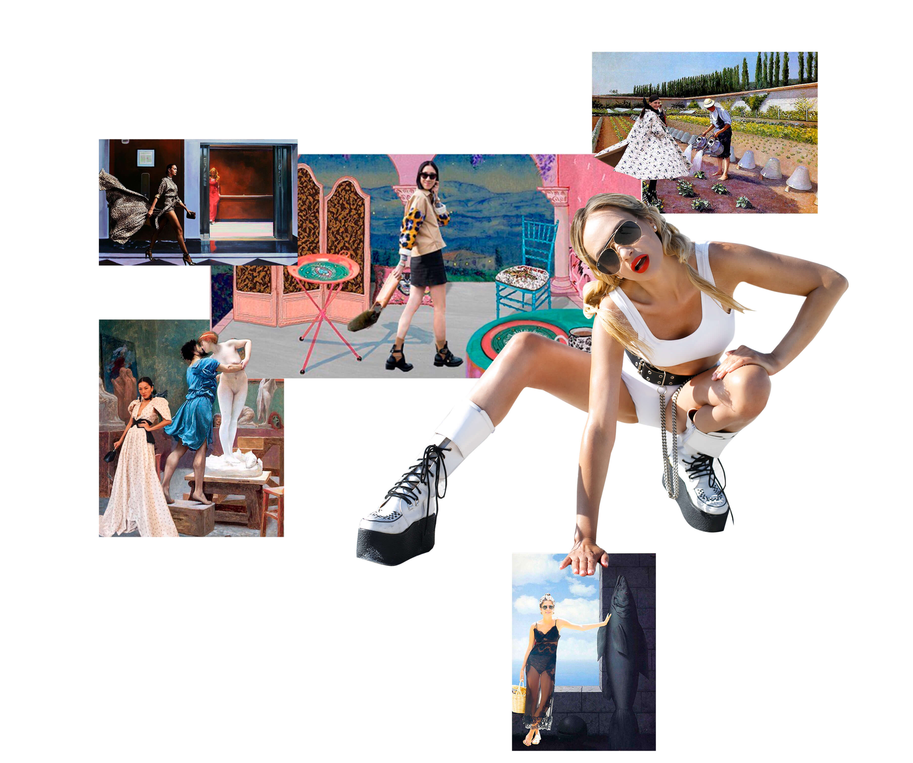 С развитием поп-культуры коллажи становятся основным визуальным сообщением. На страницах глянца, который раньше служил материалом для коллажей, эти самые коллажи появились взамен иллюстраций и одиночных фотографий. Мода проникает в искусство на всех уровнях именно эту идею развивает художница Мария Шелия Миани. На ее работах модели и блогеры появляются на картинах импрессионистов и в мастерских современных художниц. Одна из последних ее серий модный редактор Леандра Медин на полотнах сюрреалиста Рене Магритта.