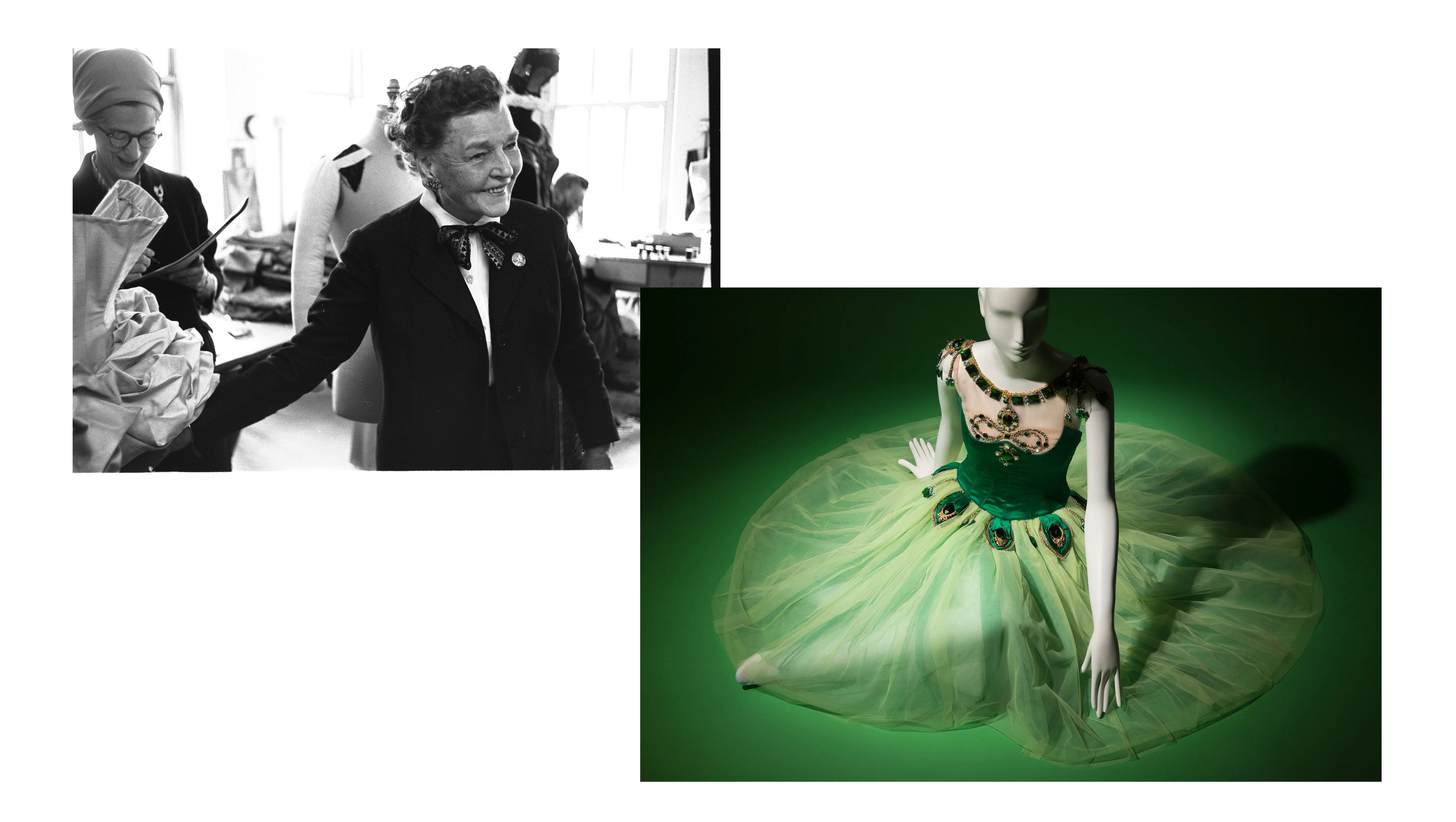 Фото Каринської на примірці костюмів для балетної постановки «Дон Кіхота» хореографії Джорджа Баланчина. Нью-Йорк, 1965 р. Фото: Марта Своуп. Костюм авторства Варвари Каринської «Смарагди» для New York City Ballet, 1967 р