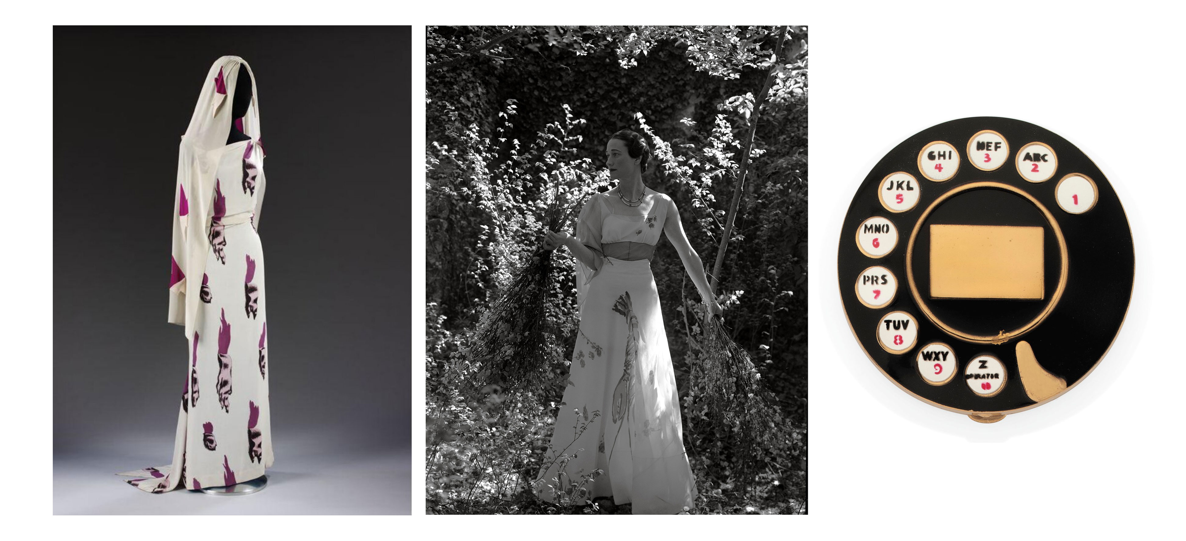 Співпраці Сальвадора Далі й Ельзи Скіапареллі. Зліва направо: The Tear Dress, Волліс Сімпсон у сукні з принтом лобстера, пудрениця у формі телефону