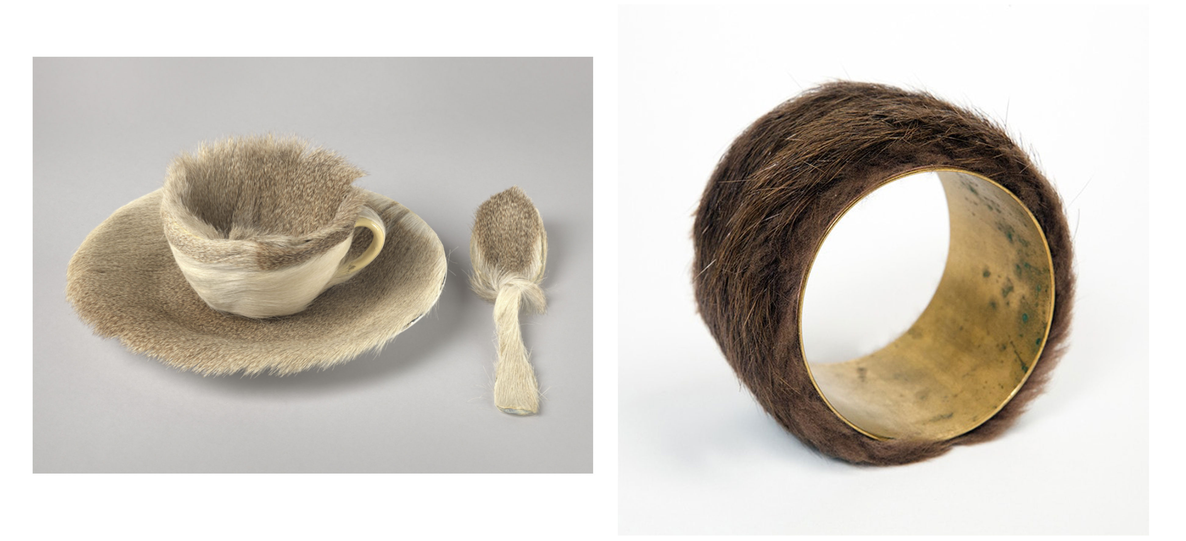Зліва направо: «Сніданок з хутра» Мерет Оппенгейм, браслет за дизайном Мерет Оппенгейм для Ельзи Скіапареллі