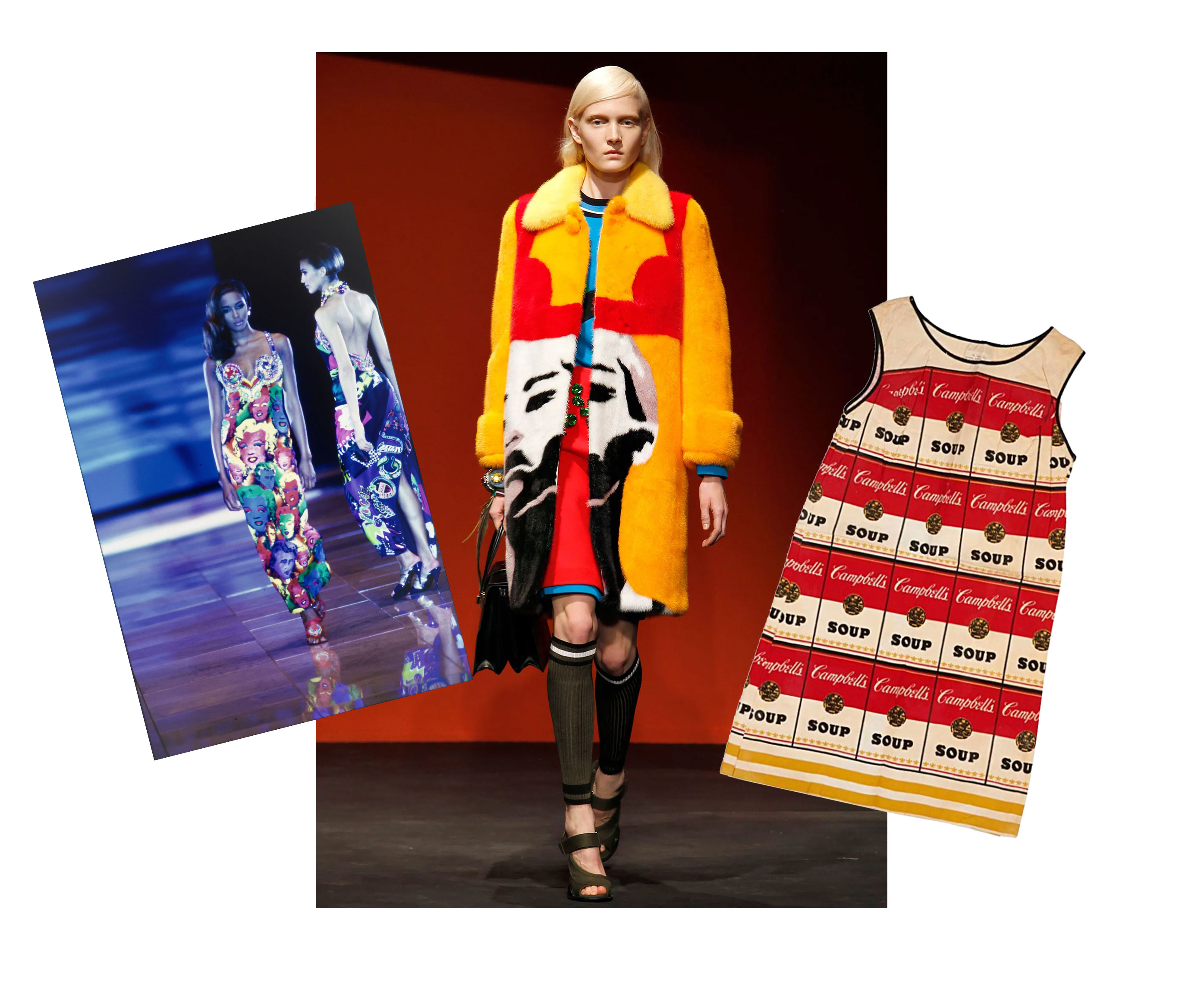Зліва направо: сукня з колекції Versace весна-літо 1991, натхненна роботами Енді Воргола; колекція Prada весна-літо 2014, що відображає елементи попарту; сукня із «суповим» дизайном Енді Воргола