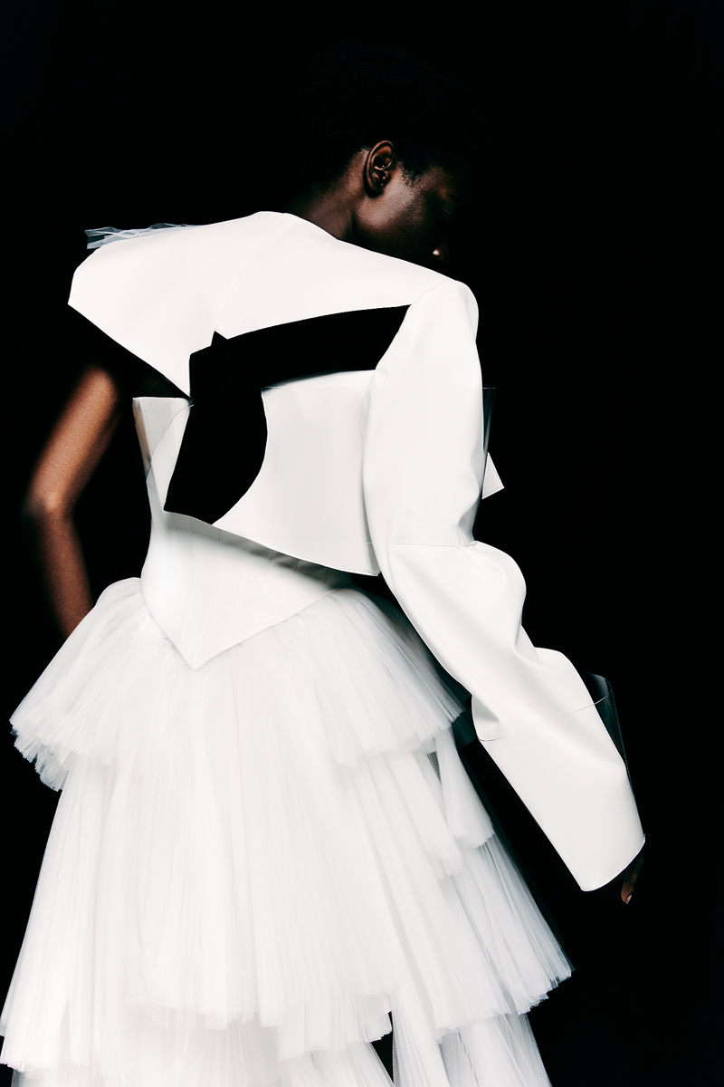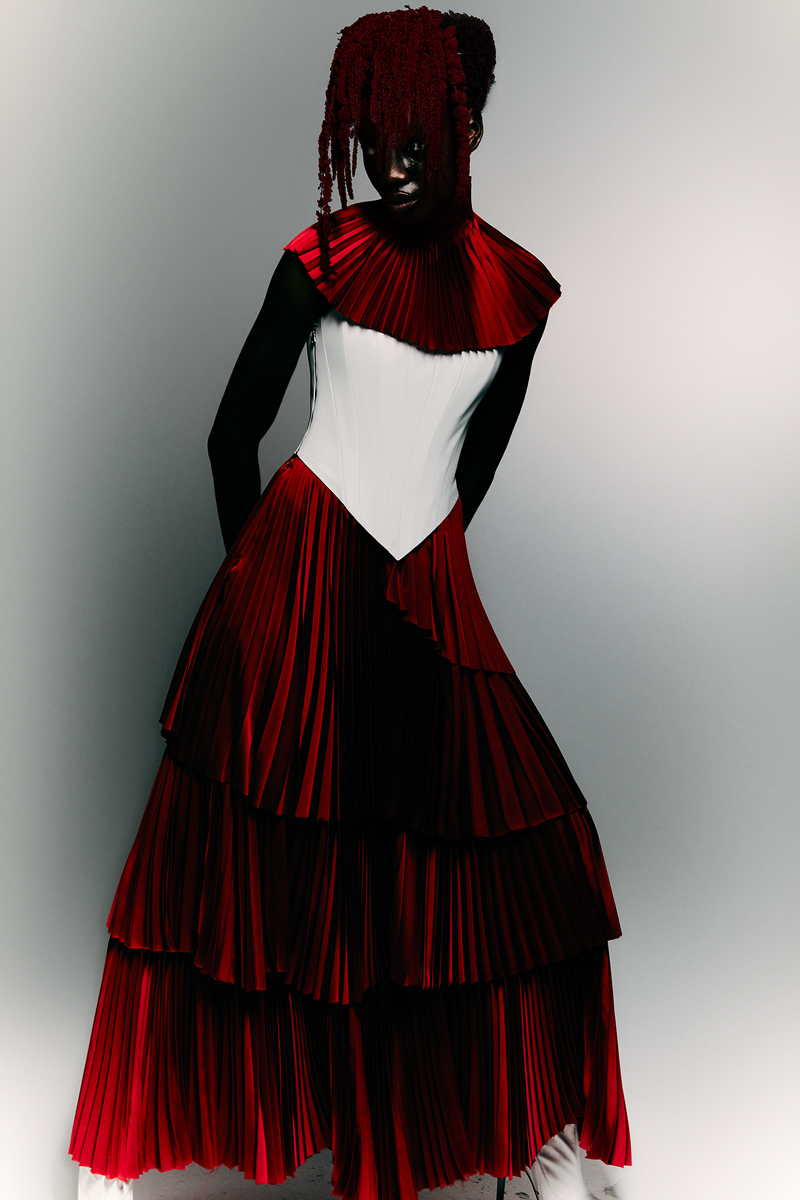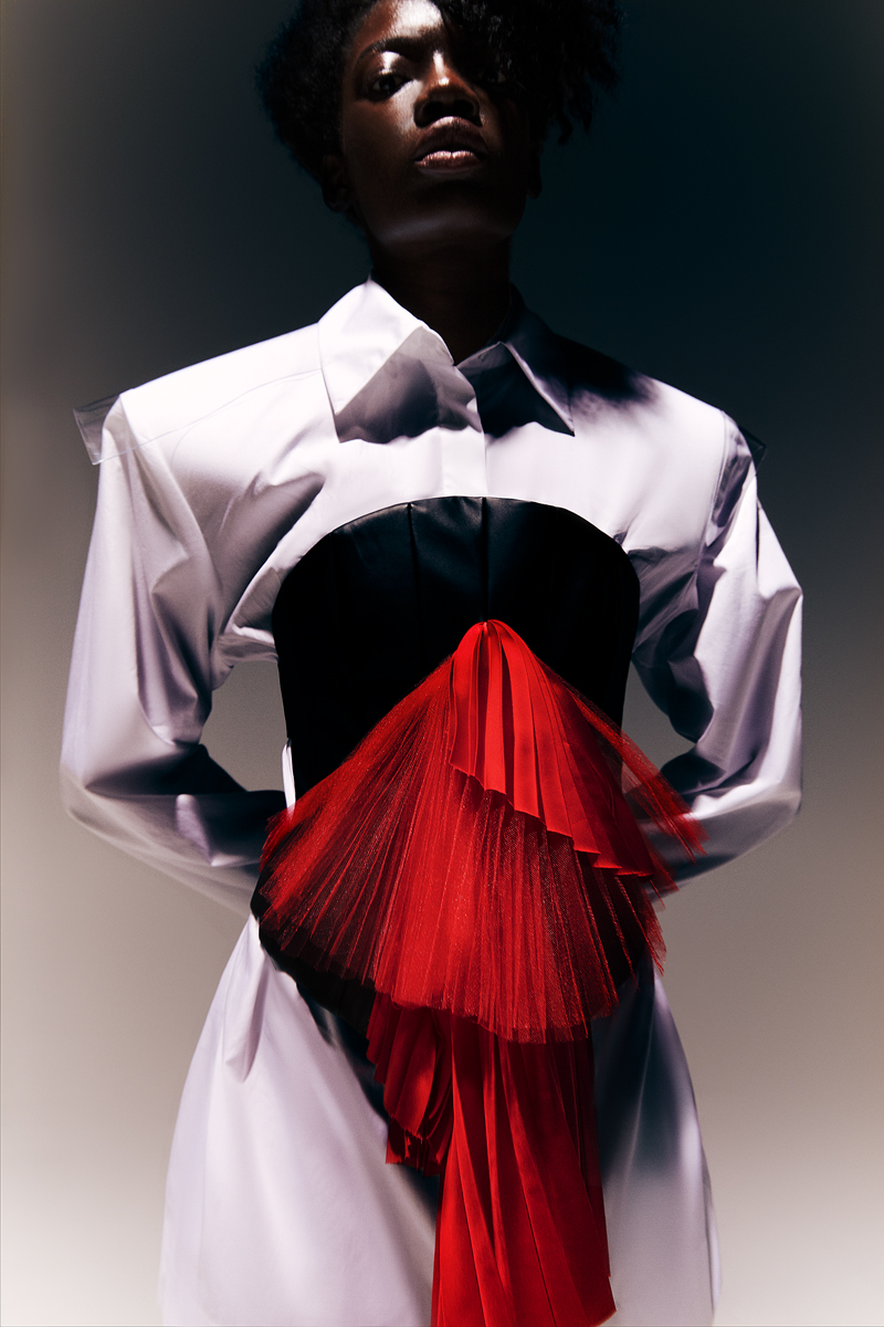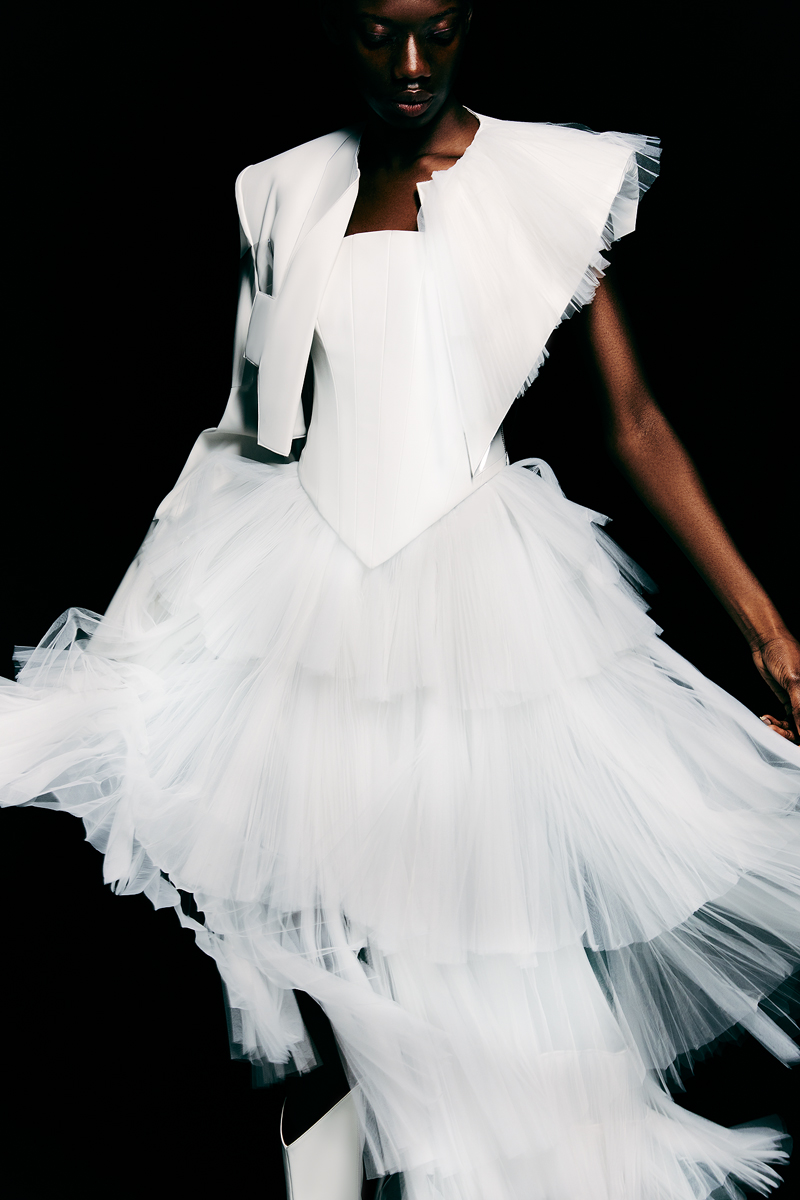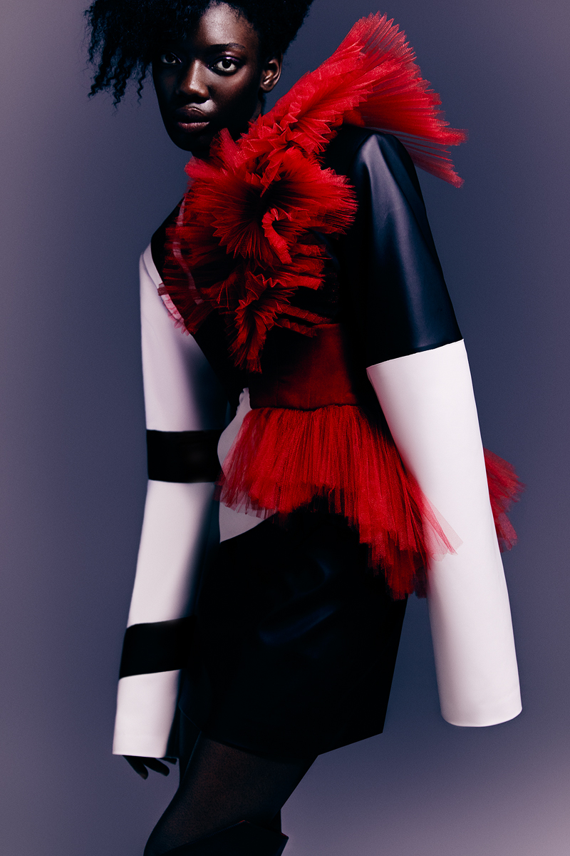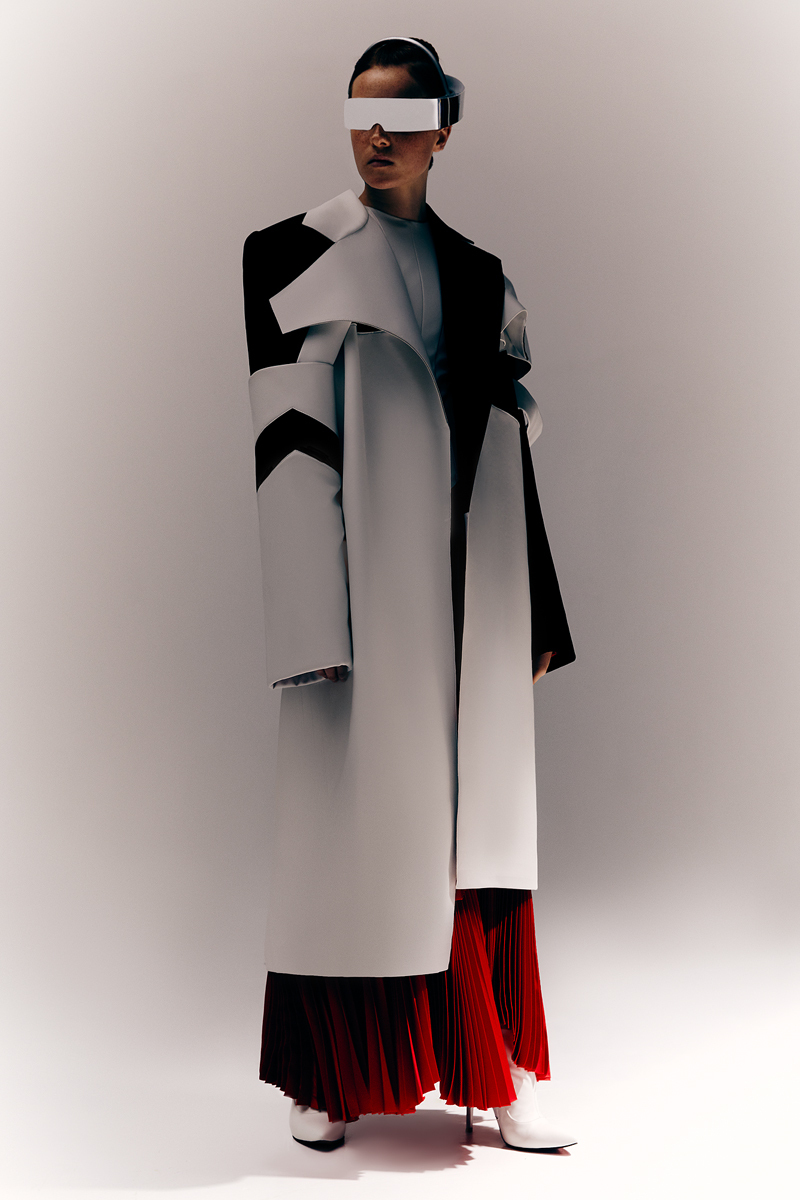 "XXI век, мир технологий, мобильных телефонов, социальные сети появляются чаще, чем новые постановки на Бродвее. Коллекция tech-no-cult о том, как технологии стремительно поглощают культуру и как важно этого не допустить. Не превратить наш мир, с театрами, великими художниками, фотографами и архитекторами, творениями высокой моды, в один большой экран. Этой коллекцией я хочу сказать "НЕТ!" культу технологий и выразить любовь к культуре и искусству, которым технологии должны помогать, например пережить сложное время изоляции. Ведь в один день мы можем пойти на онлайн-экскурсию по творениям Гауди в Барселоне и на диджитал-показ Гарета Пью в Париже. Но я очень хочу, чтобы люди не остались перед своими экранами в тот момент, когда мы сможем вернуться к обычной жизни, и подпитывали культуру своей энергией и эмоциями. В этой коллекции ярко-красный шелк и сатин, а также бархат символизируют культуру, а футуристическая кожа и винил — технологии. Плавные линии шелка противостоят четким и острым углам. Даже основа коллекции — стилизованный корсет XVII века — показывает это".