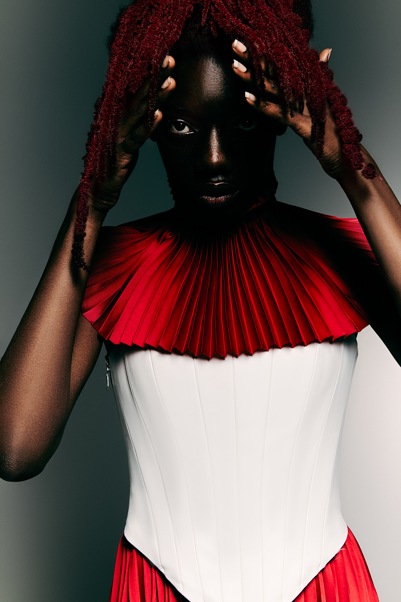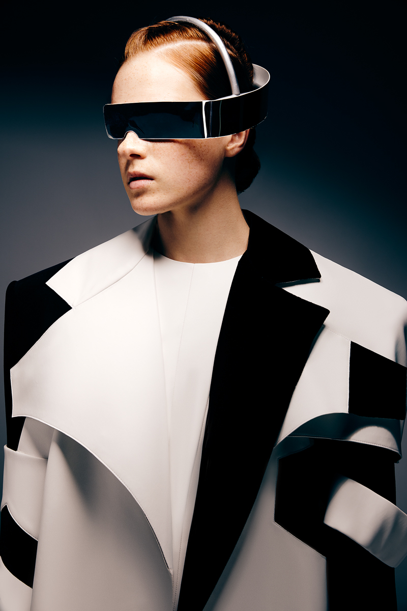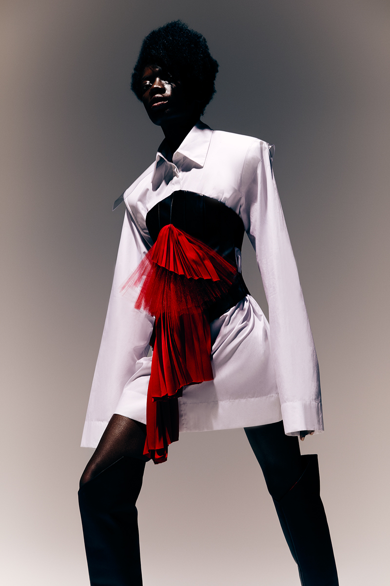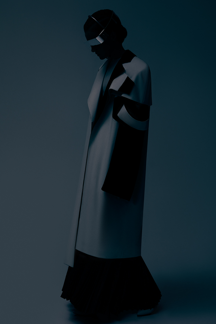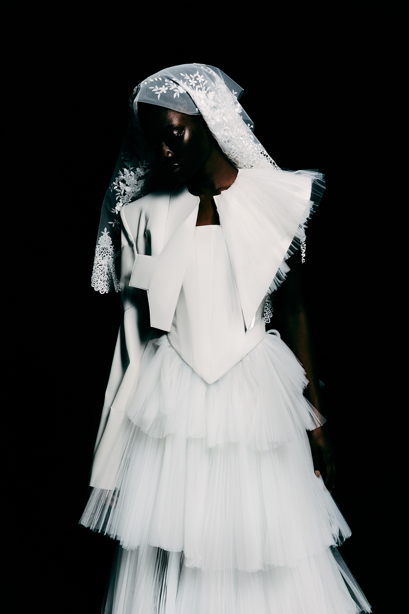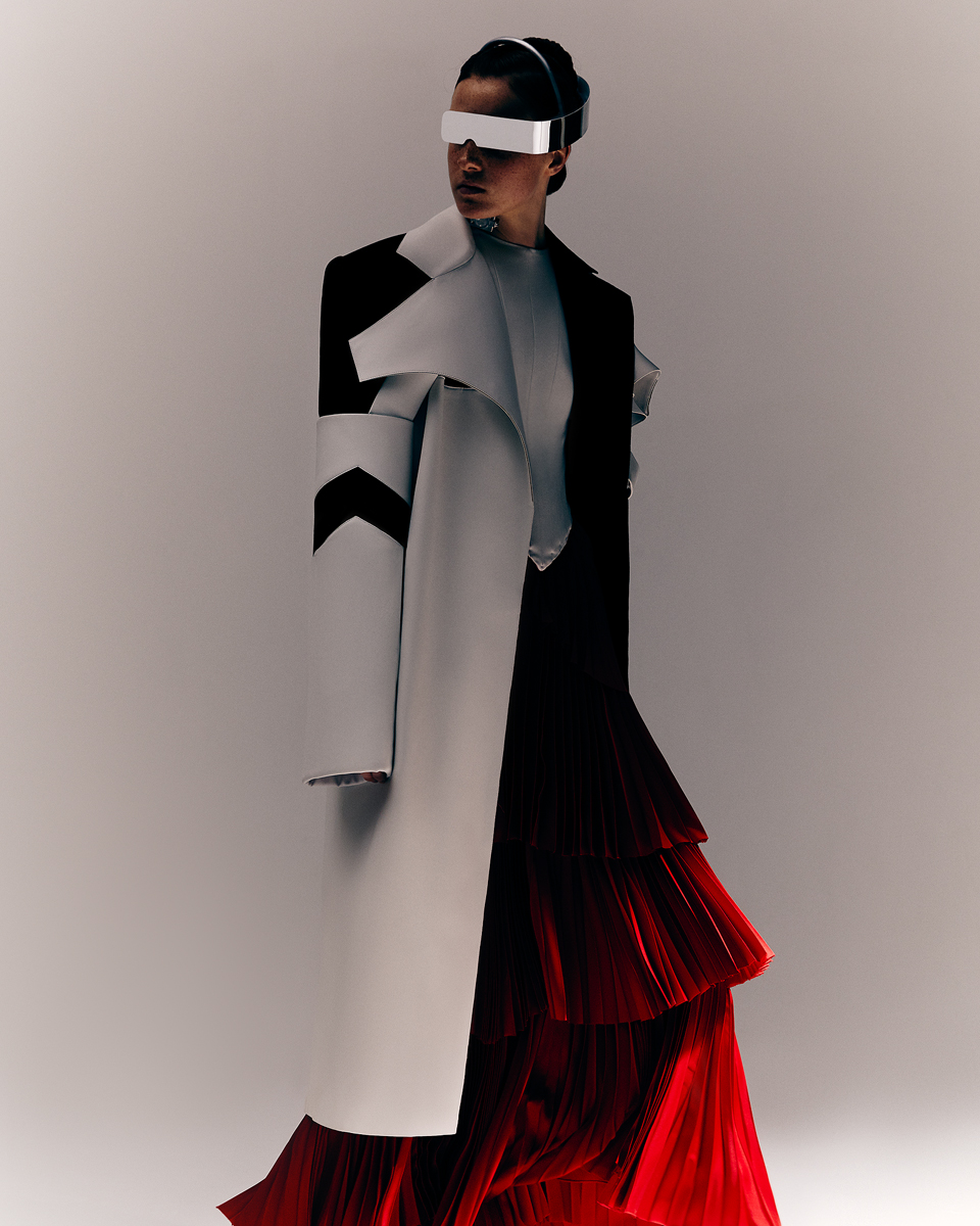 "XXI век, мир технологий, мобильных телефонов, социальные сети появляются чаще, чем новые постановки на Бродвее. Коллекция tech-no-cult о том, как технологии стремительно поглощают культуру и как важно этого не допустить. Не превратить наш мир, с театрами, великими художниками, фотографами и архитекторами, творениями высокой моды, в один большой экран. Этой коллекцией я хочу сказать "НЕТ!" культу технологий и выразить любовь к культуре и искусству, которым технологии должны помогать, например пережить сложное время изоляции. Ведь в один день мы можем пойти на онлайн-экскурсию по творениям Гауди в Барселоне и на диджитал-показ Гарета Пью в Париже. Но я очень хочу, чтобы люди не остались перед своими экранами в тот момент, когда мы сможем вернуться к обычной жизни, и подпитывали культуру своей энергией и эмоциями. В этой коллекции ярко-красный шелк и сатин, а также бархат символизируют культуру, а футуристическая кожа и винил — технологии. Плавные линии шелка противостоят четким и острым углам. Даже основа коллекции — стилизованный корсет XVII века — показывает это".