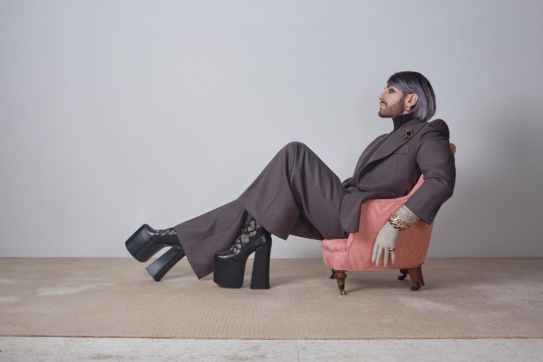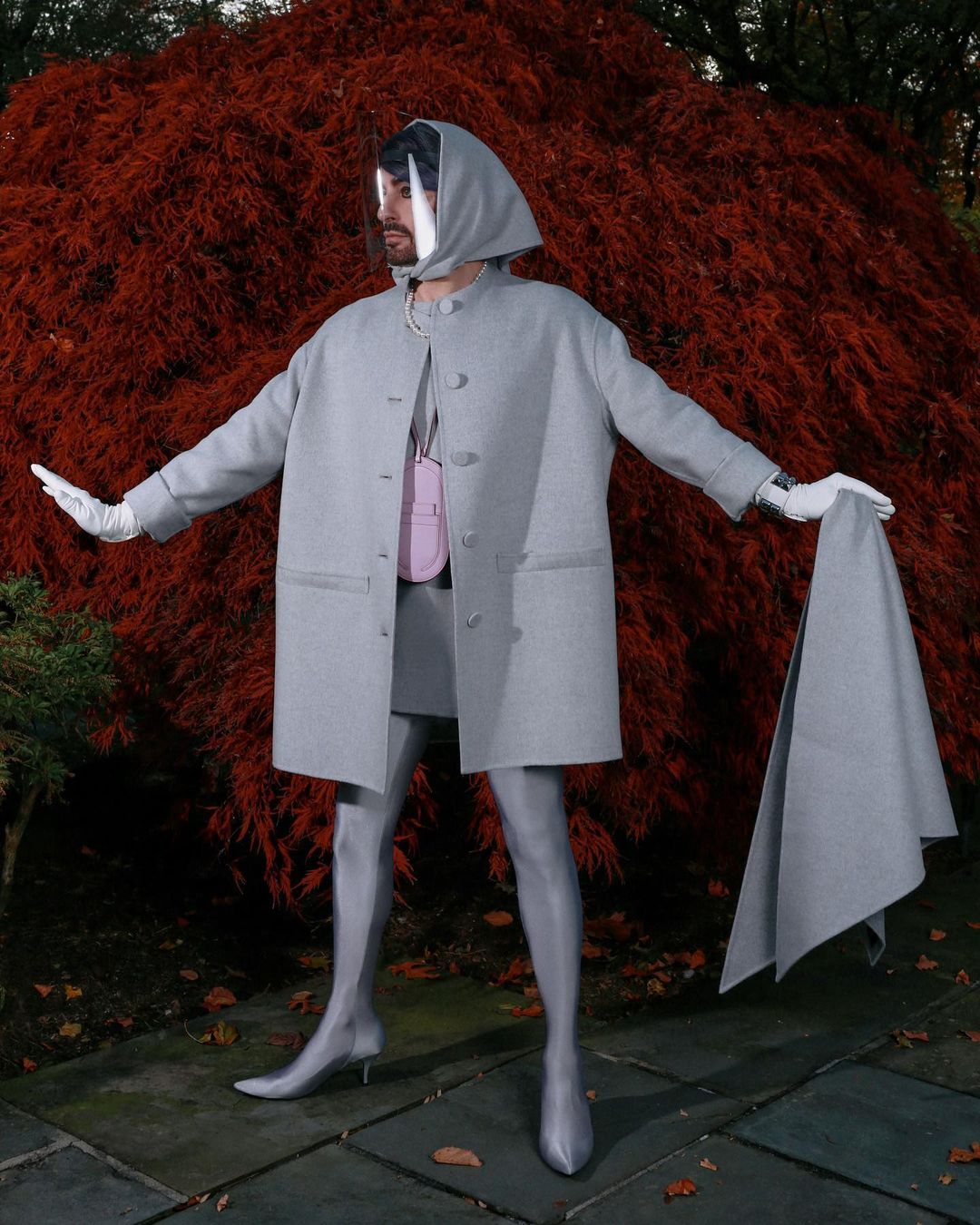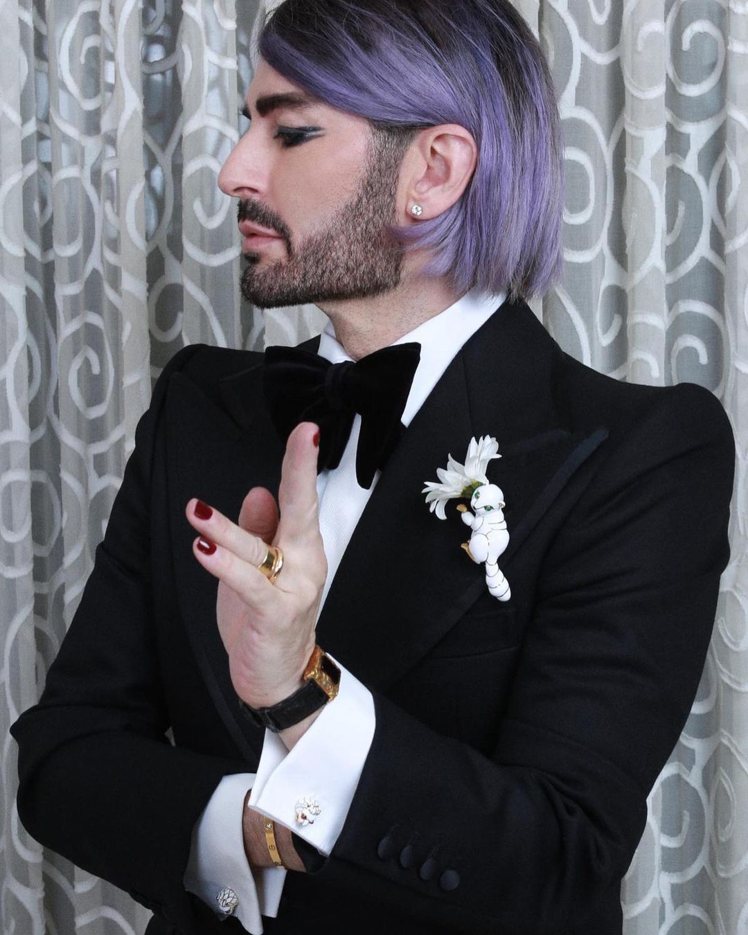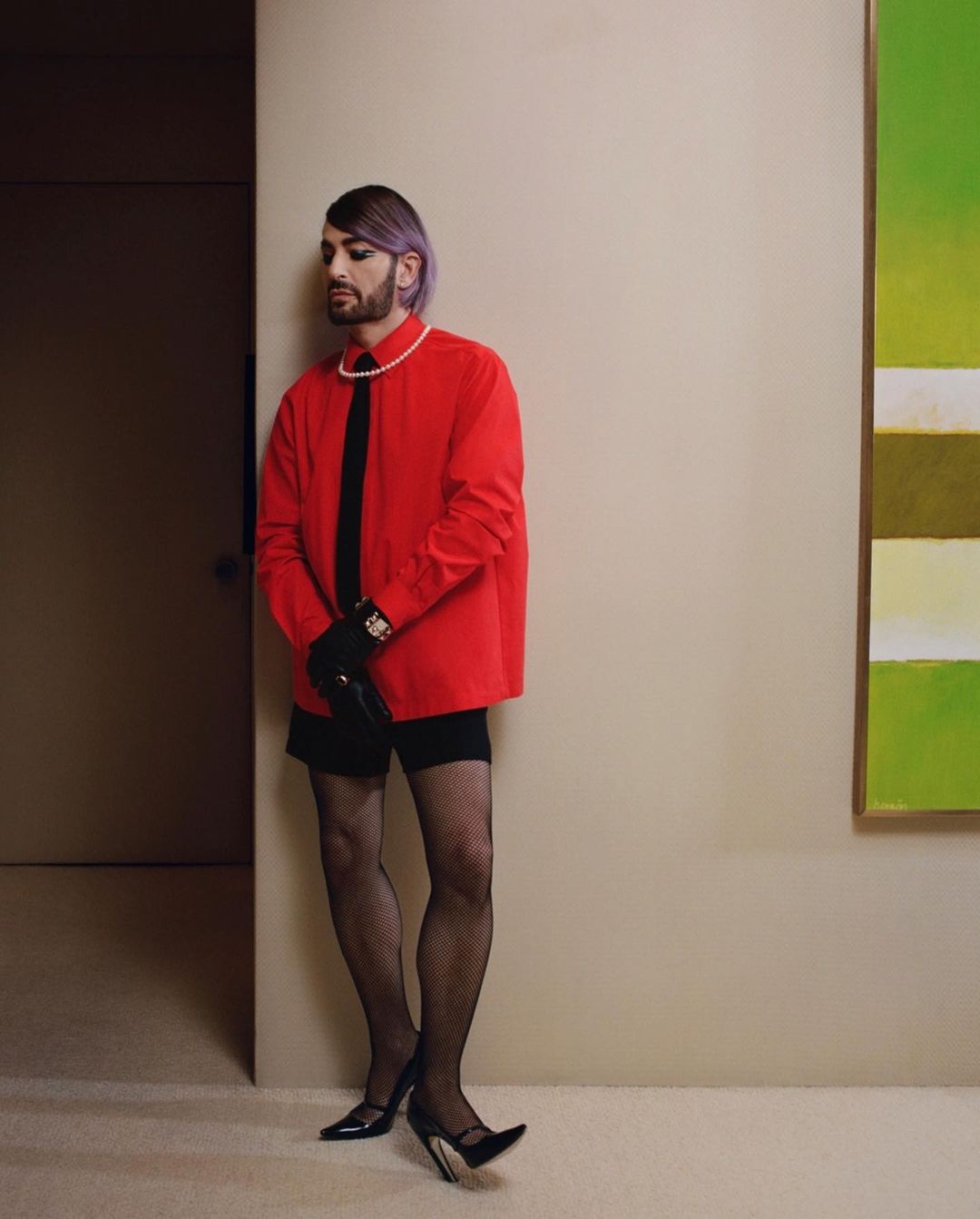 Он с легкостью дополняет костюм-тройку из серой шерсти парой жемчужных заколок и блестящими ботфортами на танкетке, а на вакцинацию отправляется в розовой юбке. Свитеры с забавными рисунками дизайнер смешивает в коктейле с колготками в сетку, облегающими платьями, серьгами из кристаллов, шейными платками и яркими комбинезонами, а к смокингу добавляет угольно-черные стрелки и нежную лилию в лацкане.