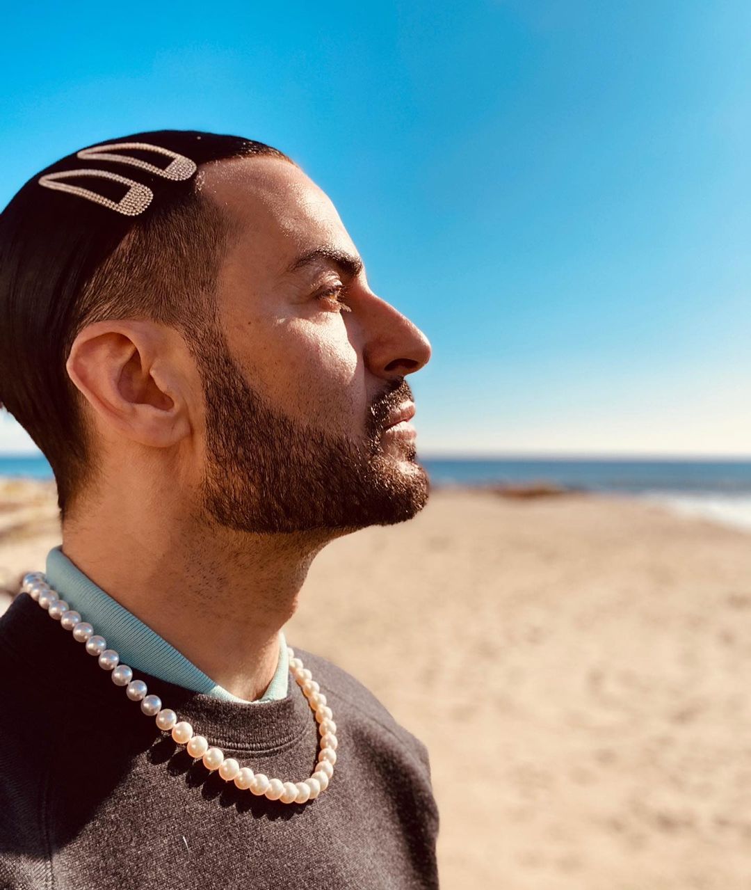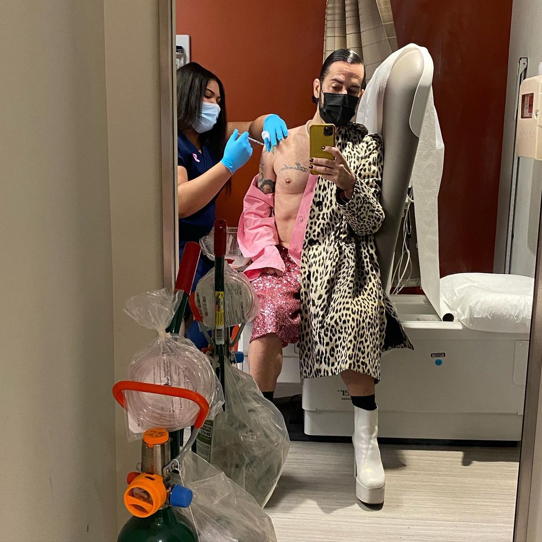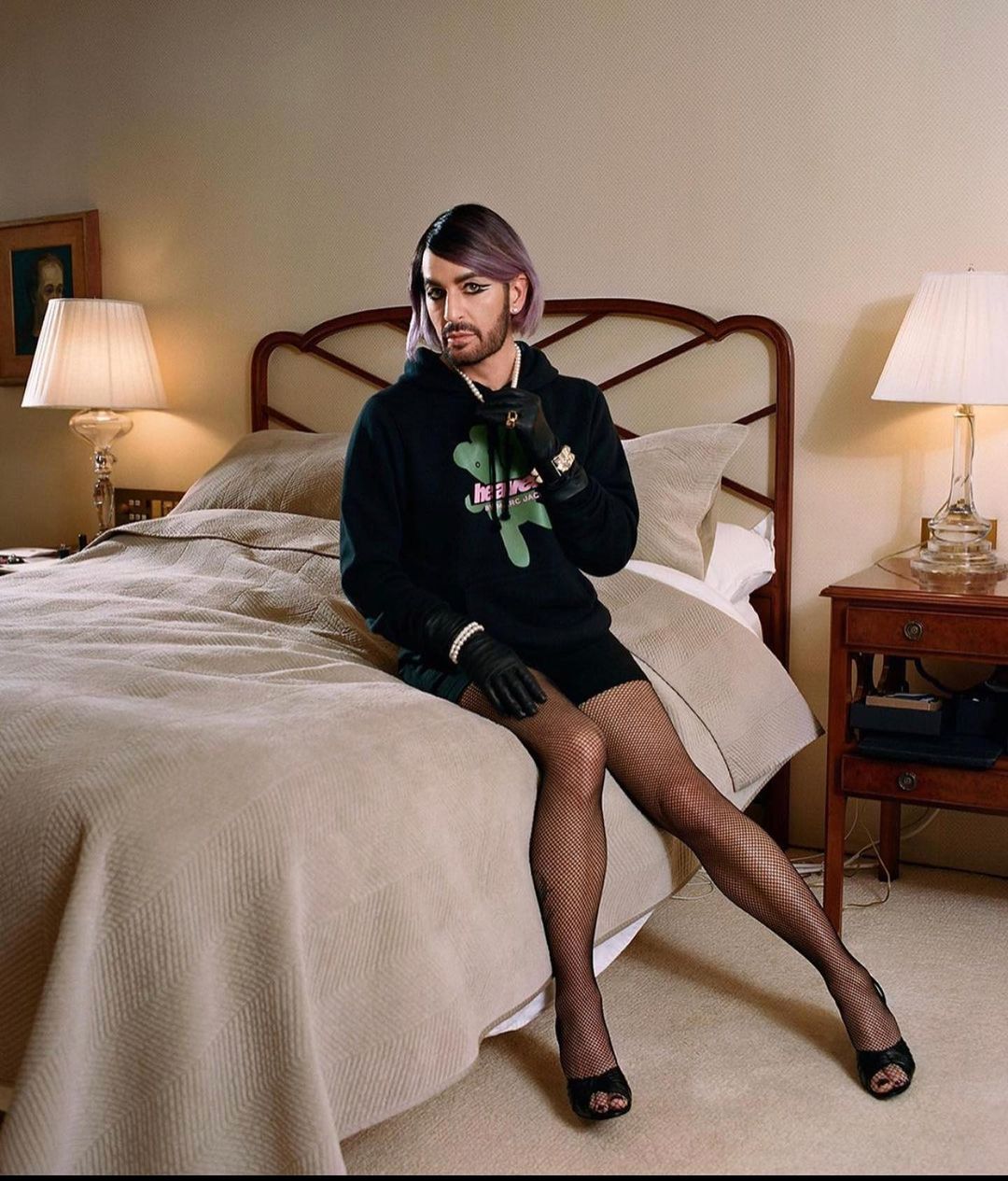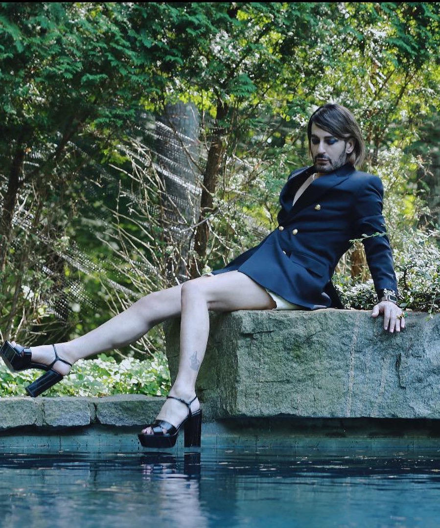 Он с легкостью дополняет костюм-тройку из серой шерсти парой жемчужных заколок и блестящими ботфортами на танкетке, а на вакцинацию отправляется в розовой юбке. Свитеры с забавными рисунками дизайнер смешивает в коктейле с колготками в сетку, облегающими платьями, серьгами из кристаллов, шейными платками и яркими комбинезонами, а к смокингу добавляет угольно-черные стрелки и нежную лилию в лацкане.