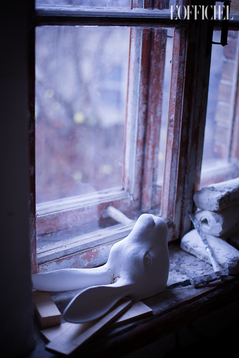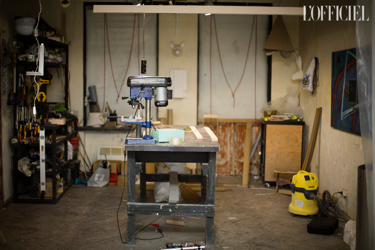 На підвіконні та по стінах, наче загублені іграшки, розкидані невеликі гіпсові фігури робочих інструментів: серед них легко впізнати шпателі та молотки. З цих речей і починається «мистецька рутина», тільки, правда, зі справжніх. В окремому закутку кімнати виростає широкий, заповнений дрібничками стіл, а вже тут і робочий станок, і справжні моталки, і болгарки, і фрезери, і шуруповерти — словом, всі ті загадкові інструменти, які потрібні скульптору для творчих експериментів. Олексій жартує, що найважливіший предмет у майстерні — пилосос. Жарти жартами, але дуже схоже на правду.