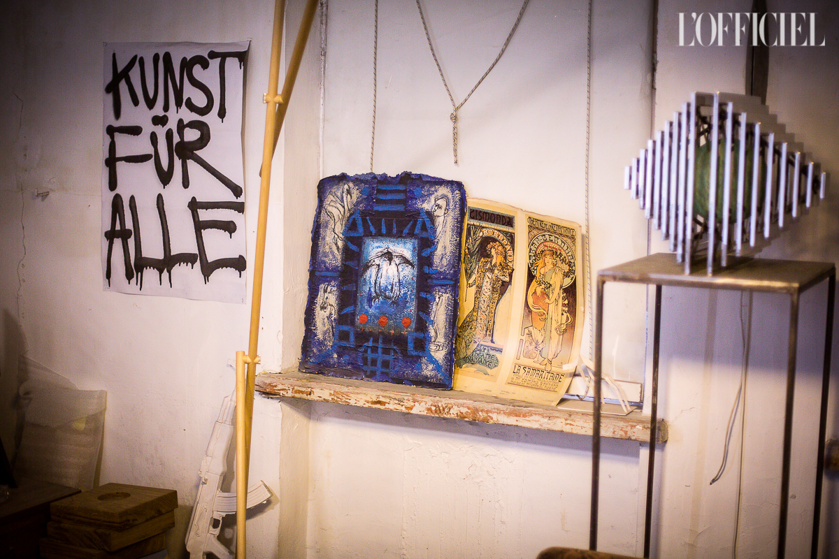 З тих же невиразних стін на частих гостей дивляться плакати, лістівки та фотокартки. З одного боку — робота його мами та професійної художниці Ірини Феддер, яка розповідає про бомбування Дрездену, з іншого — політичний плакат Деніса Боккета Kunst für alle. Гіпсові мордочки зайця, кішки, шакала та інших тварин пригрілися біля живописних творів мами митця, яка, до речі, мешкає та працює у Німеччині. Олексій зізнається, що мав змогу туди переїхати вже з десяток разів: «Я лишився, бо мені тут подобається. В Україні є можливості реалізовуватися. В Європі, на мій погляд, складніше, але там постійно потрібно організовувати персональні виставки, навіть якщо локально в Україні, та приїжджати дивитися на роботи інших художників».